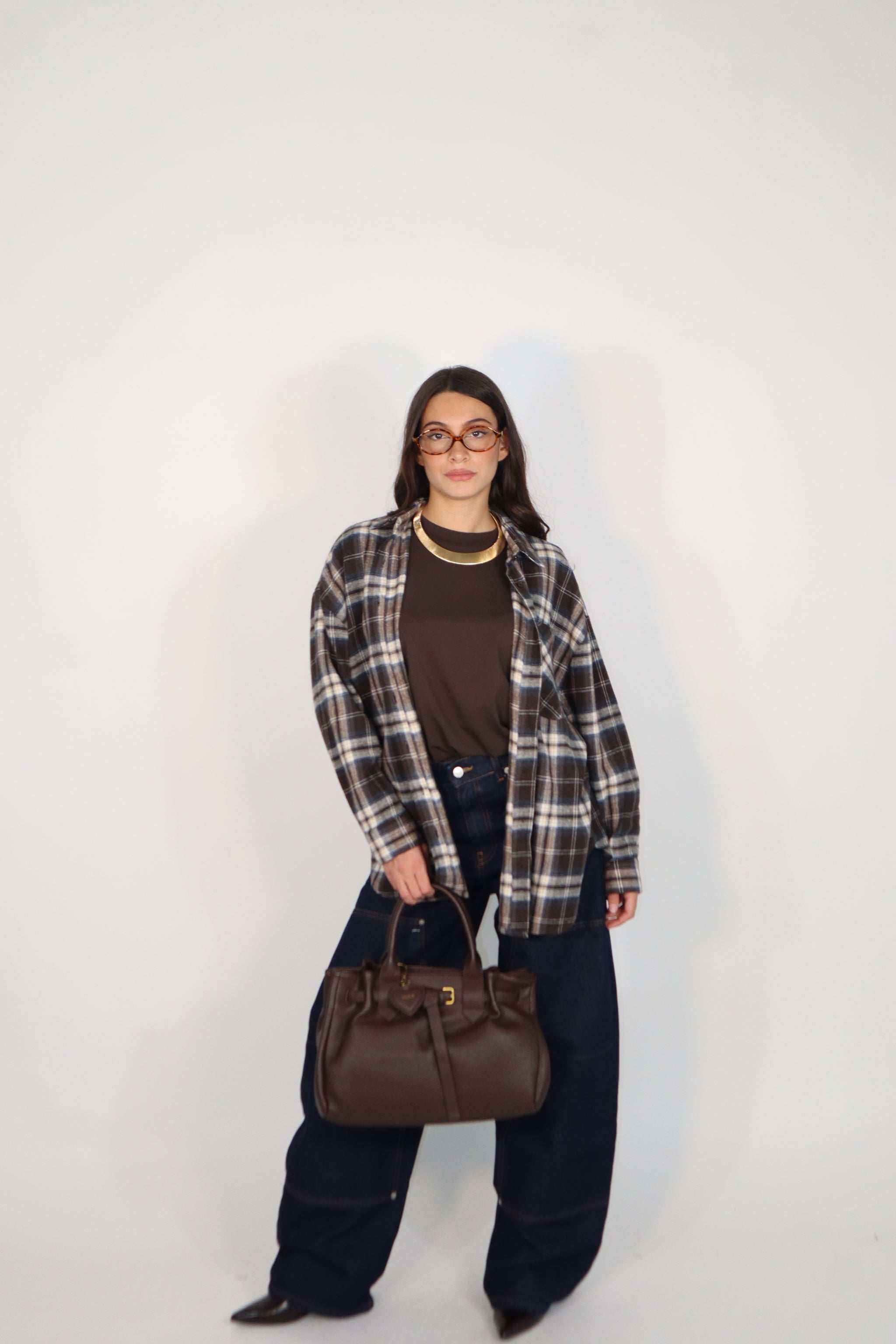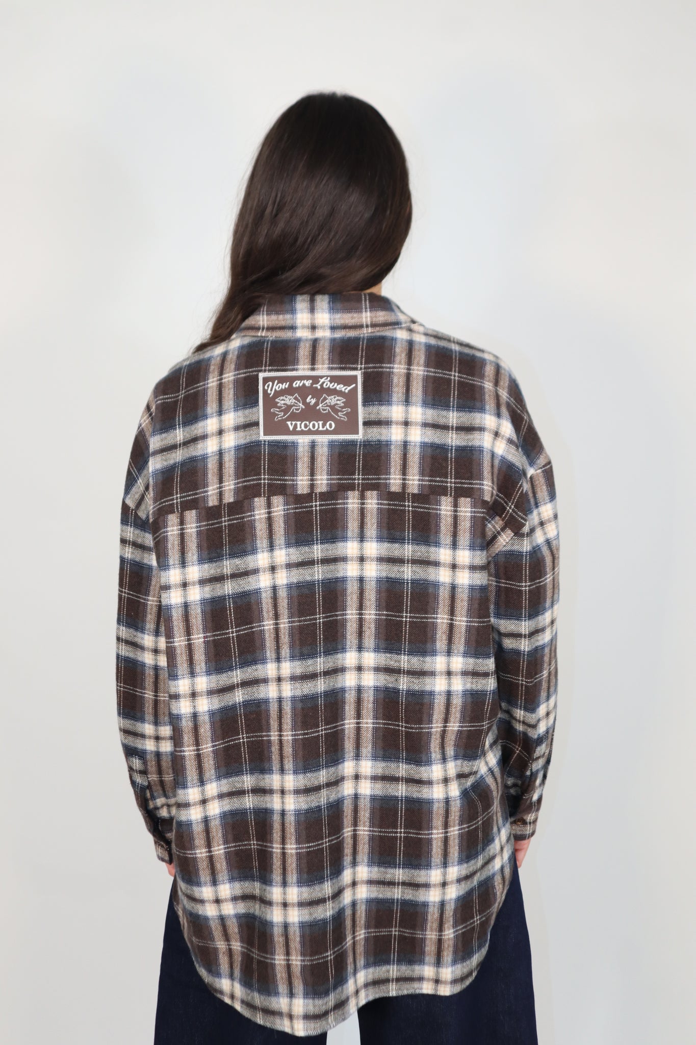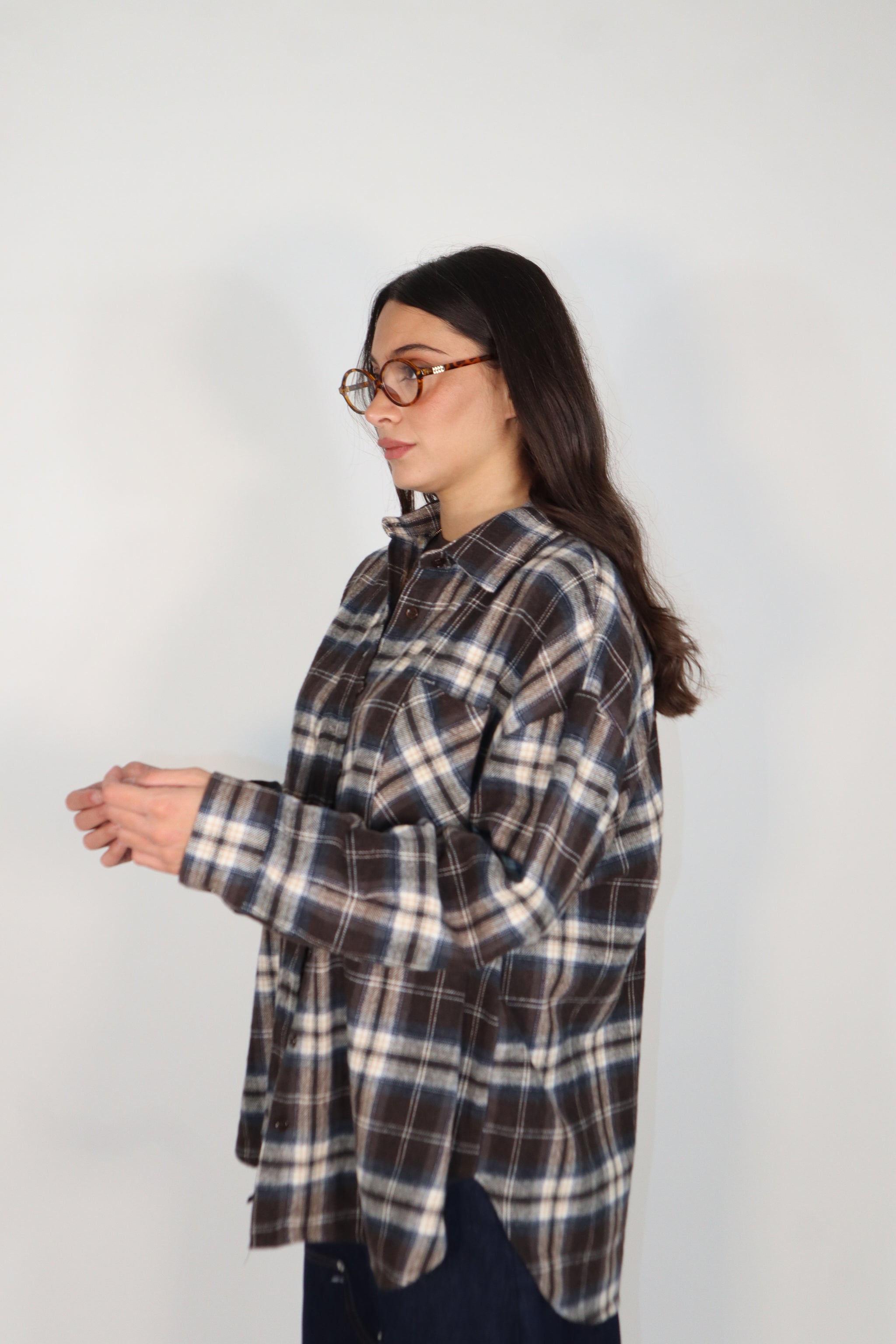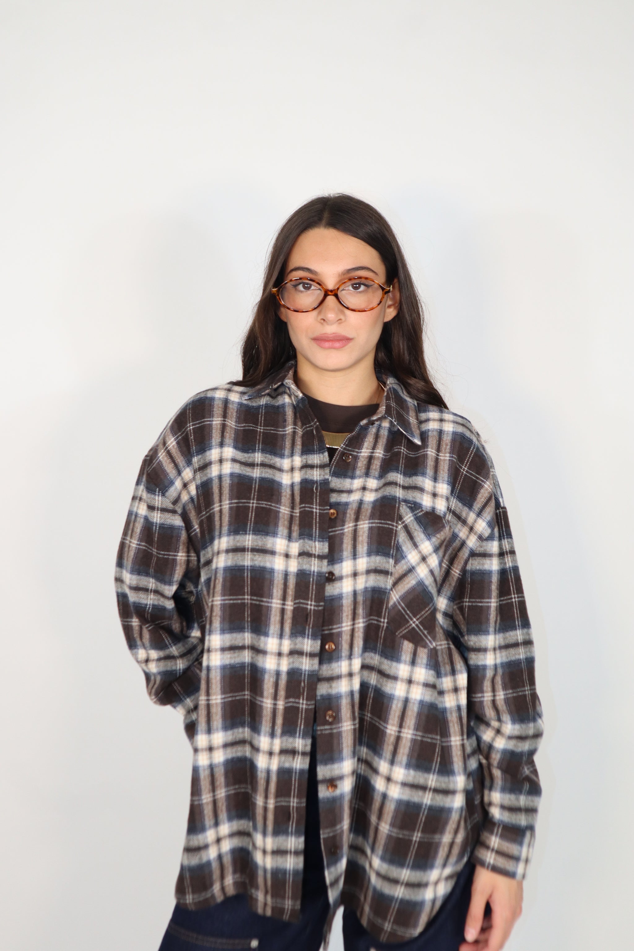 Camicia misti cotone e flanella sui toni del moro e blu . Fantasia quadri e sul retro c’è il patch in simil pelle con firma parlata. RF0528