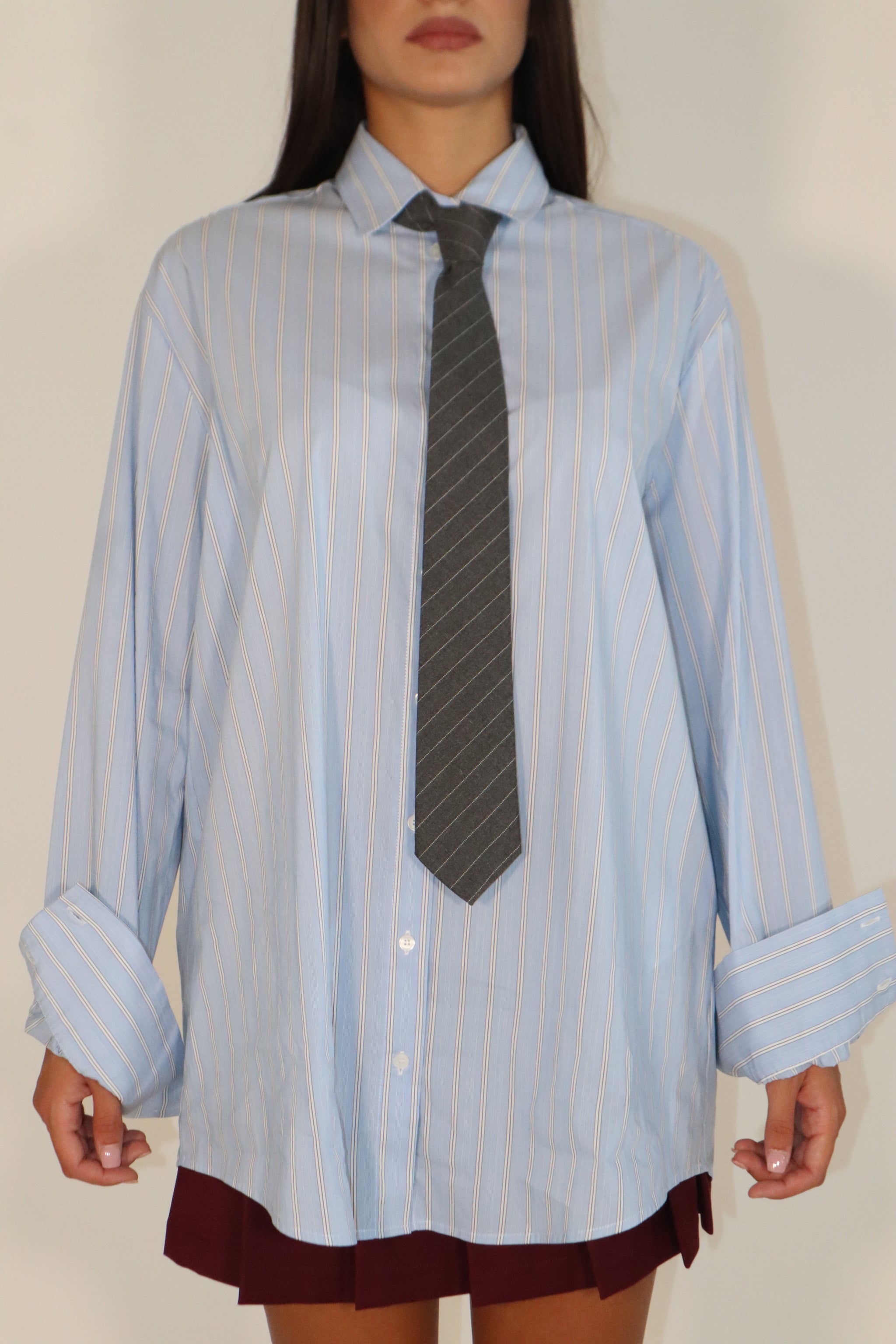 LA CAMICIA A RIGHE LINA SI ARRICCHISCE DI UN DETTAGLIO INEDITO: LA CRAVATTA A RIGHE, RIMOVIBILE, CHE STRAVOLGE IL CLASSICO CON UN TOCCO ANDROGINO E SOFISTICATO. IL COLLETTO ALLA FRANCESE, I POLSI CON BOTTONI E LA VESTIBILITÀ REGOLARE COMPLETANO IL LOOK CON PROPORZIONI RILASSATE MA DECISE.