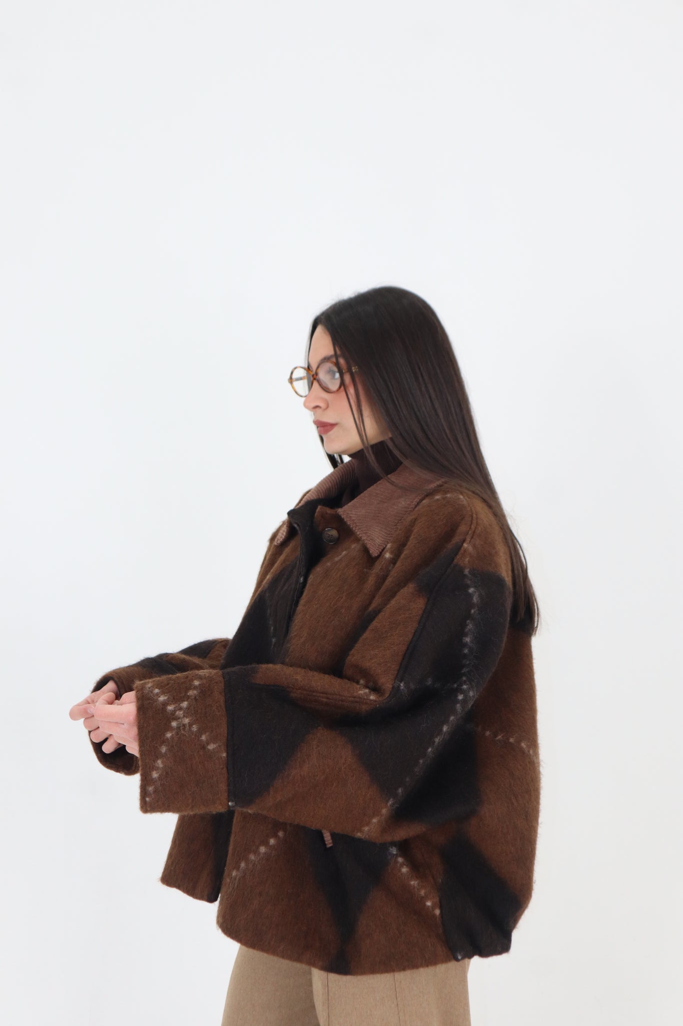 Bomber Lana e altre viscose fantasia rombi con colletto in velluto a coste e riprese alle tasche laterali.