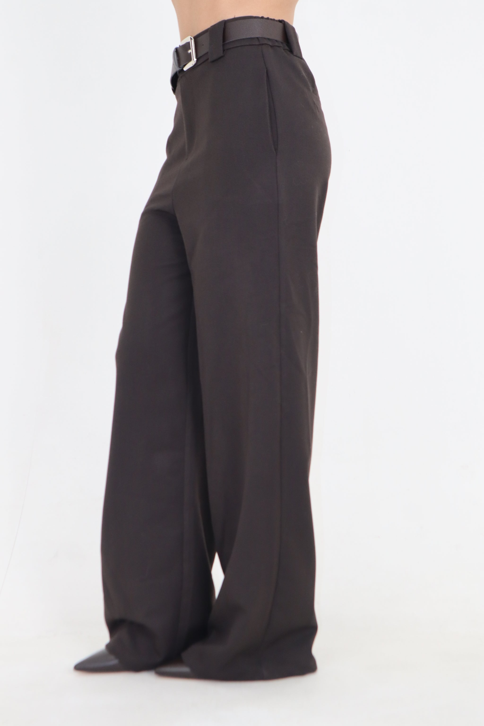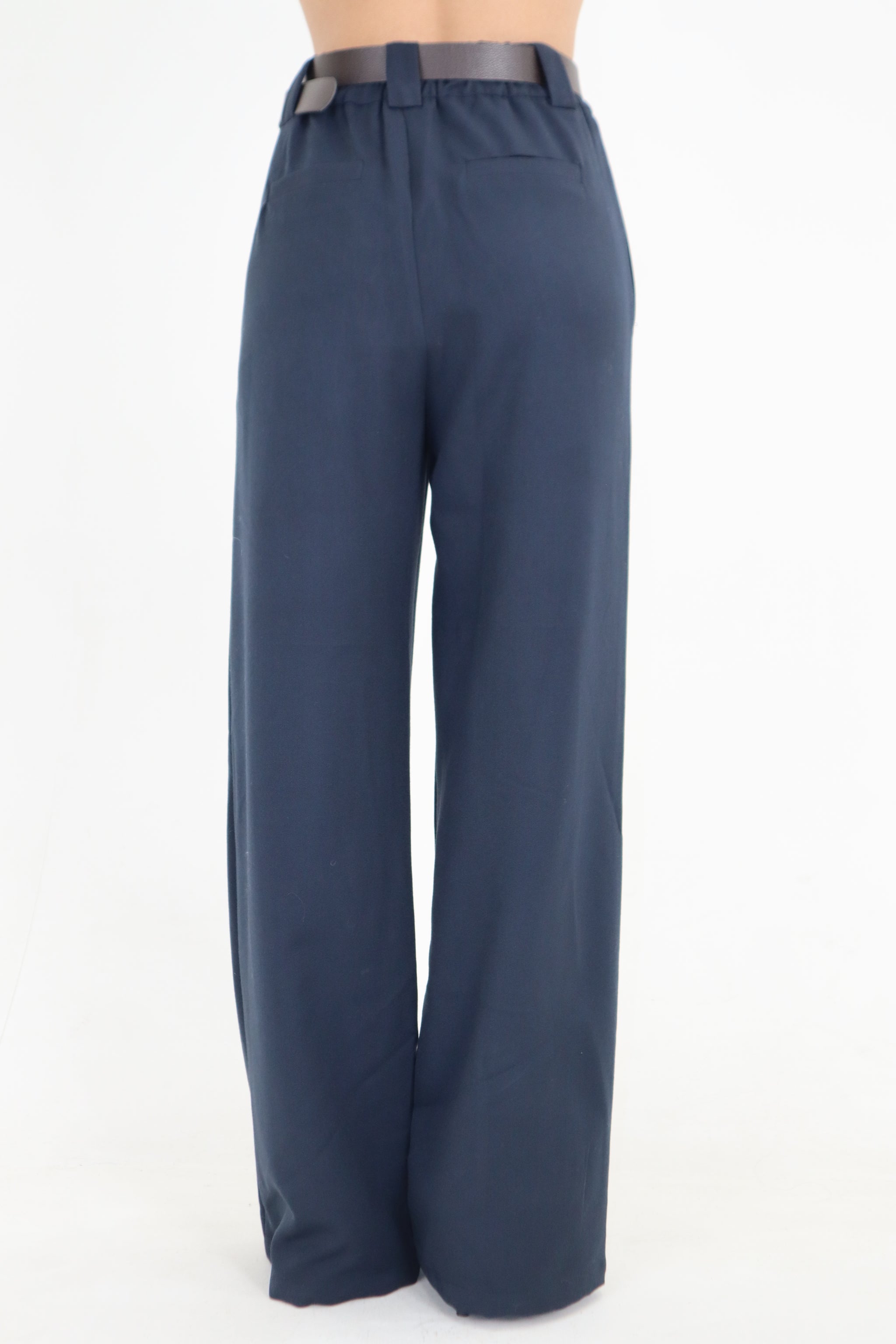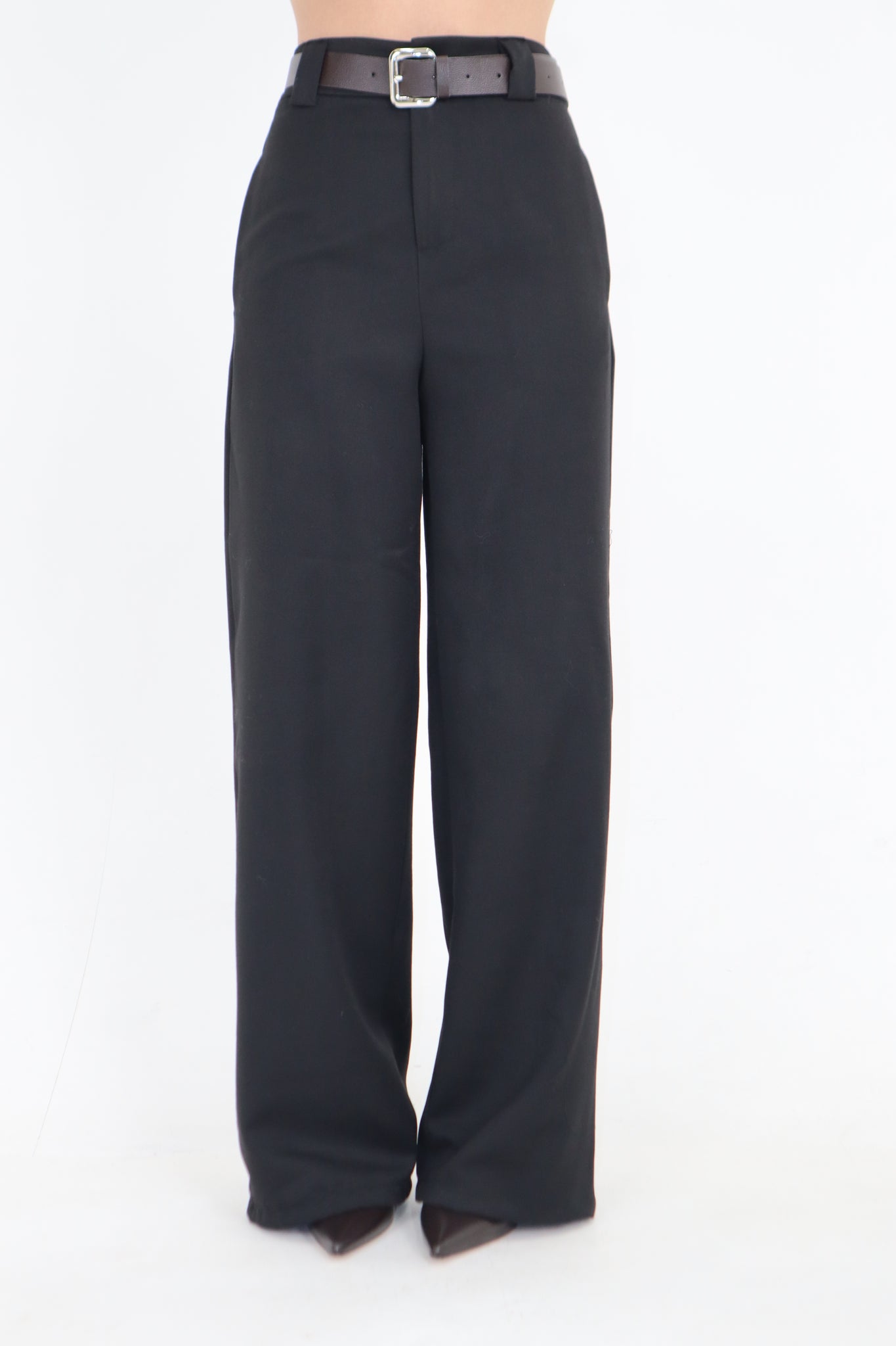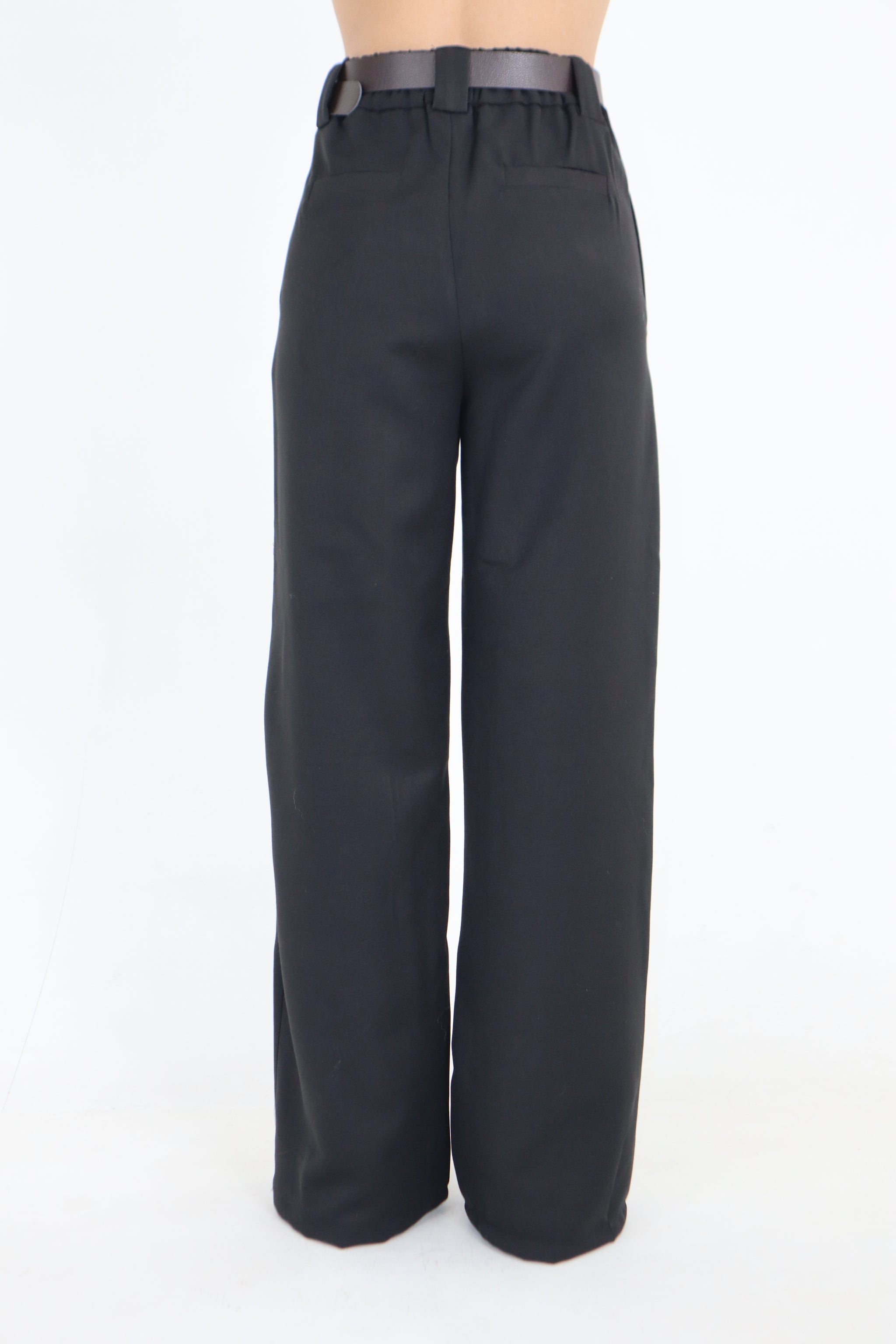 Pantalone vita alta a gamba dritta con elastico sul dietro e cintura in ecopelle