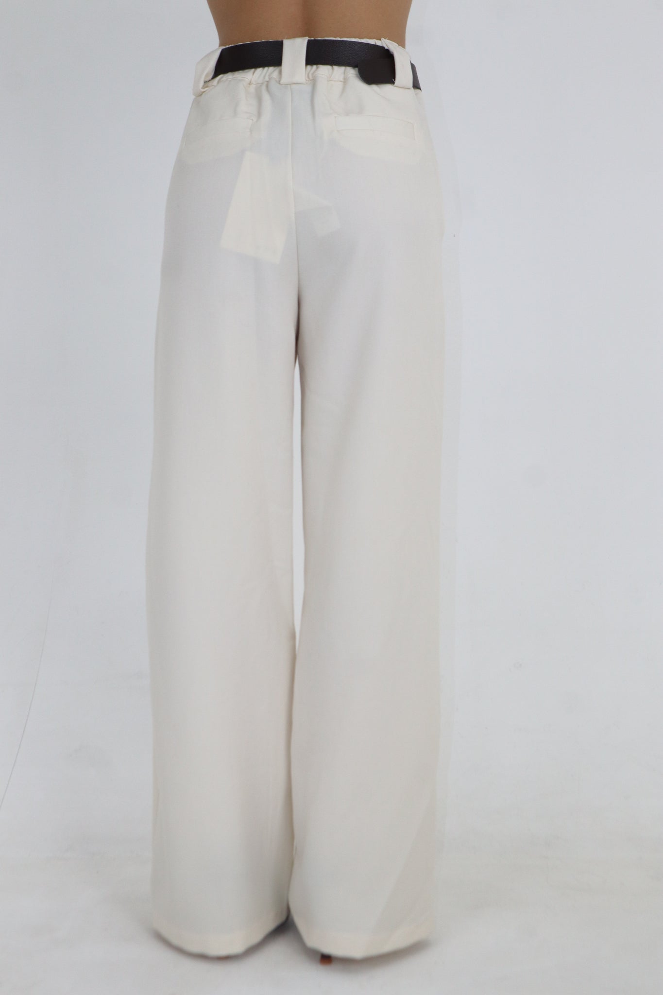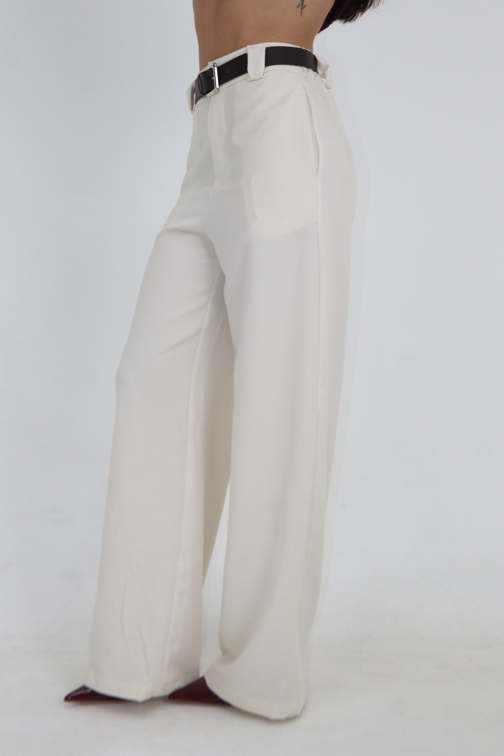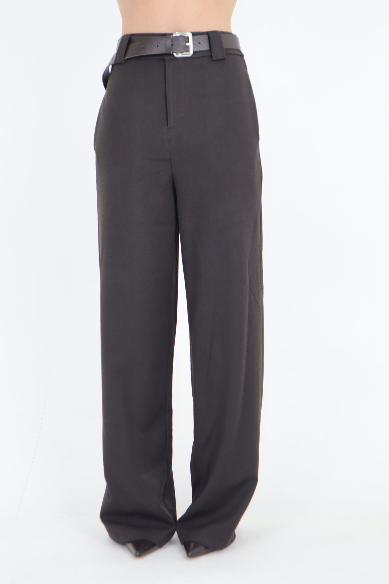 Pantalone vita alta a gamba dritta con elastico sul dietro e cintura in ecopelle