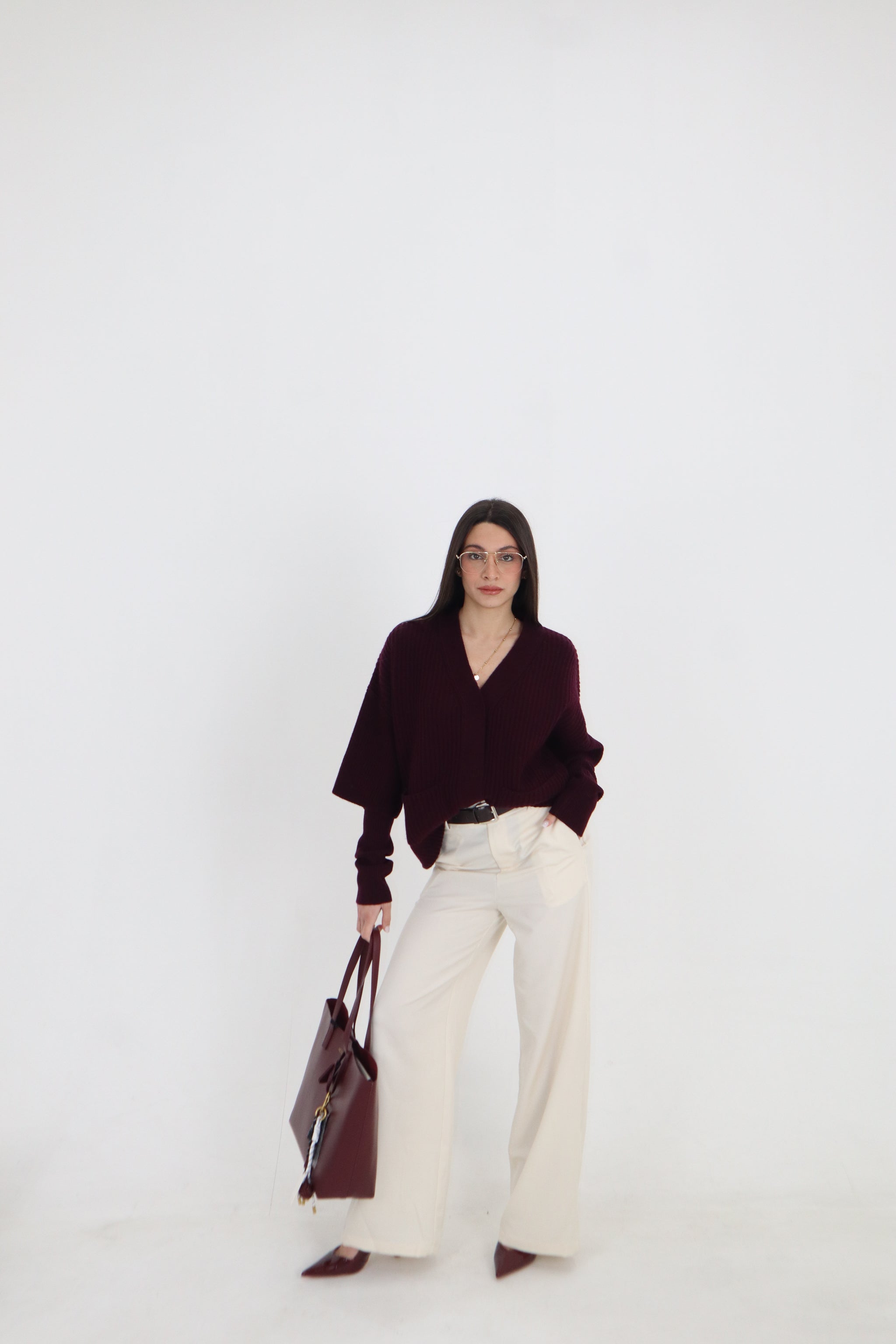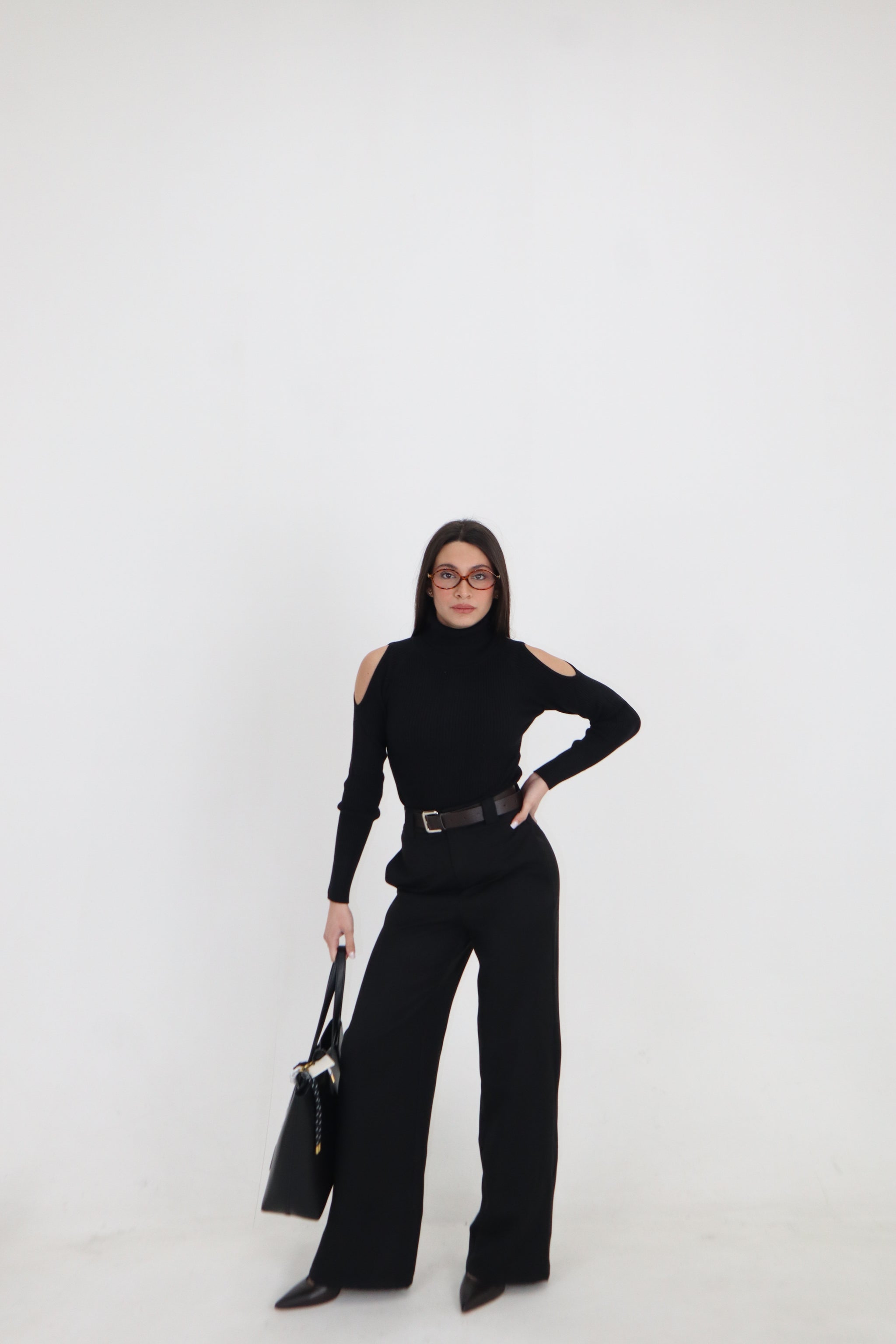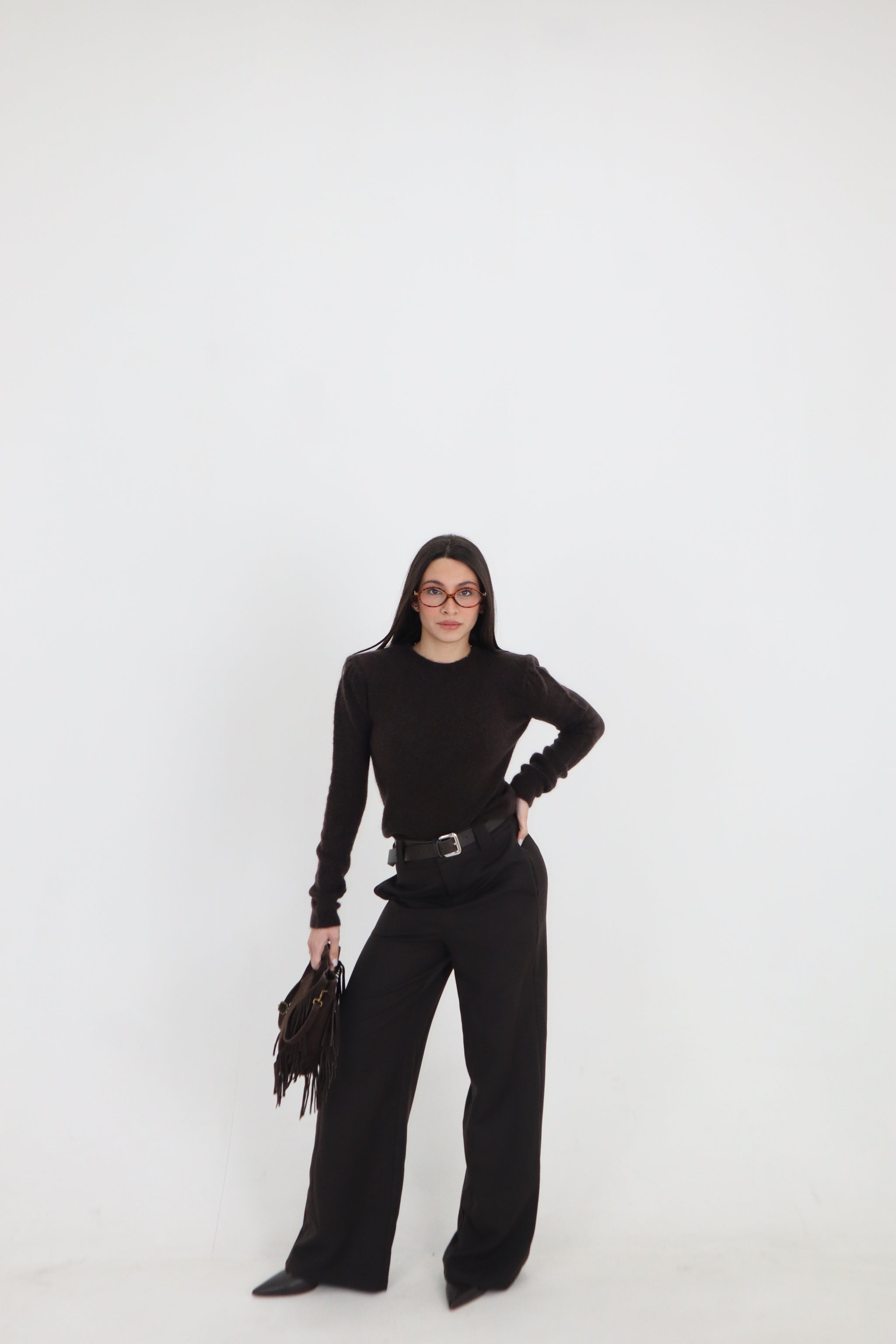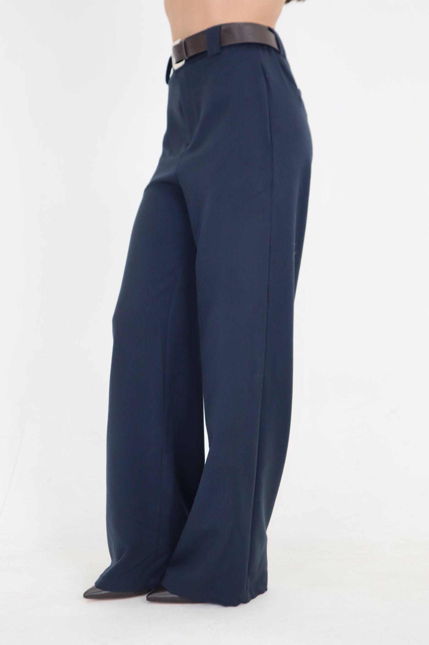 Pantalone vita alta a gamba dritta con elastico sul dietro e cintura in ecopelle
