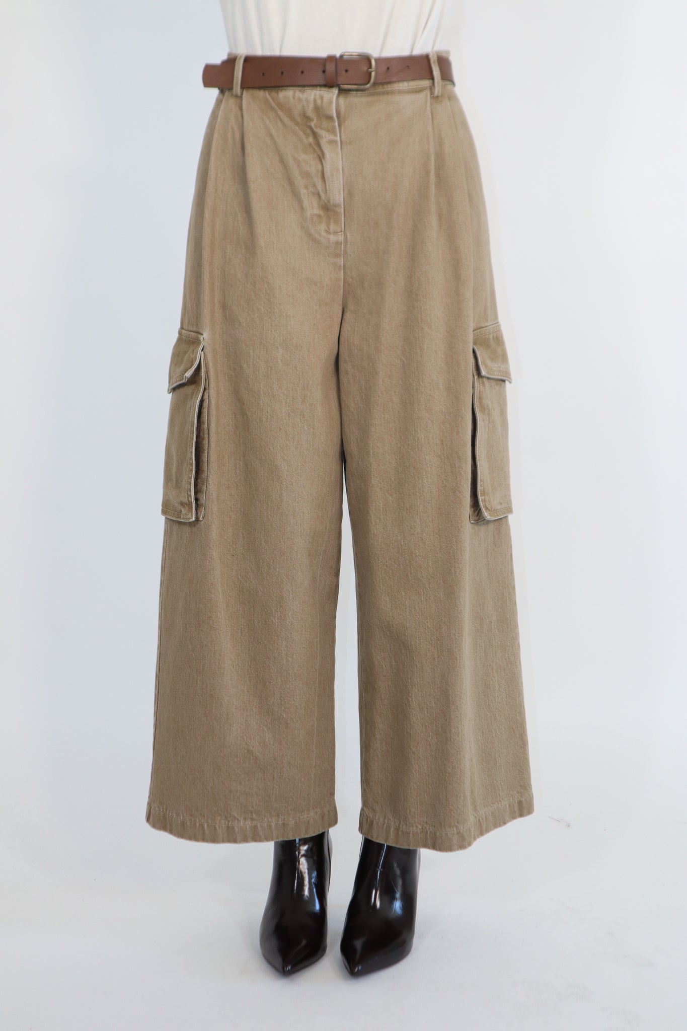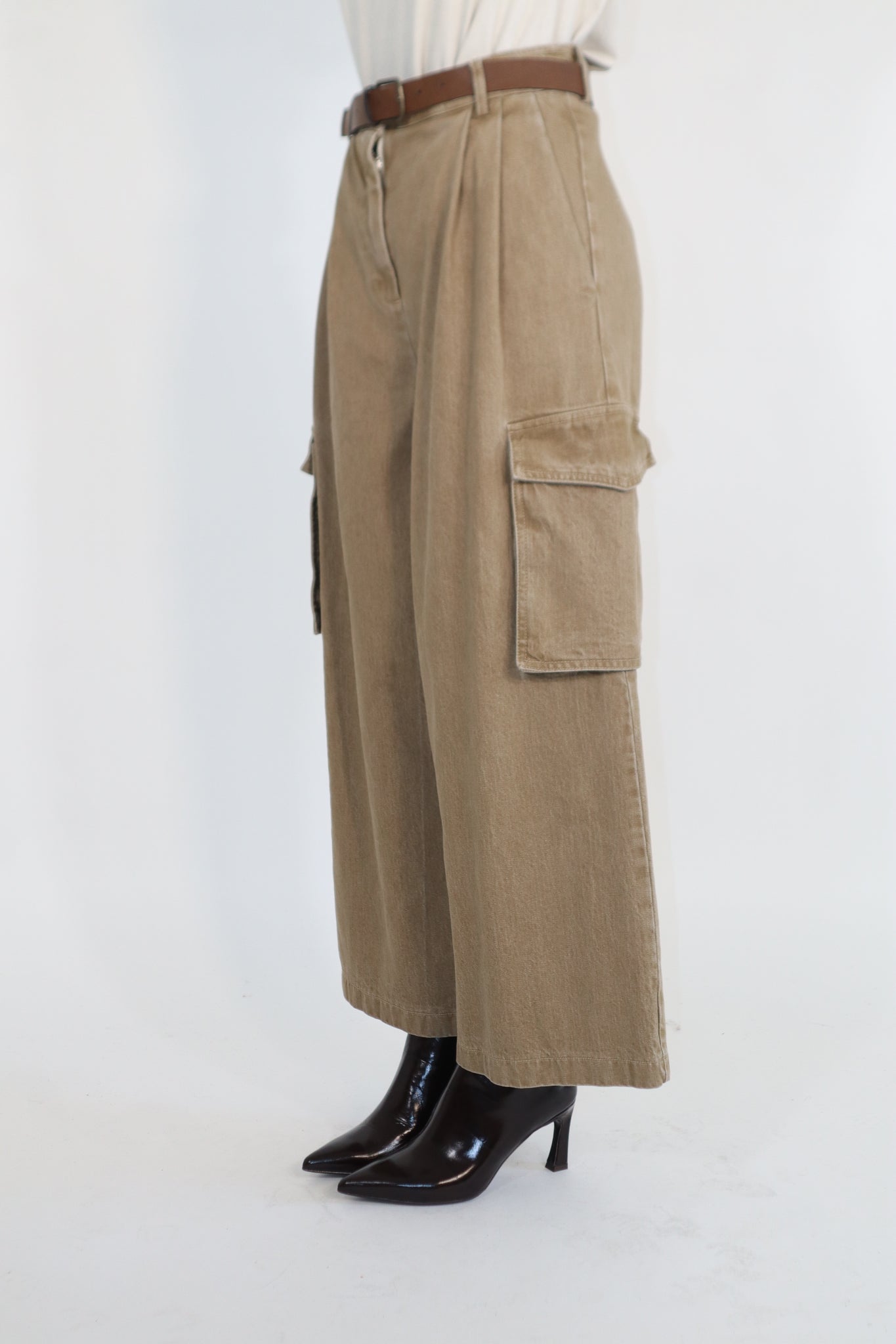 PANTALONE CON TASCONI LATERALI E CINTURA IN VITA