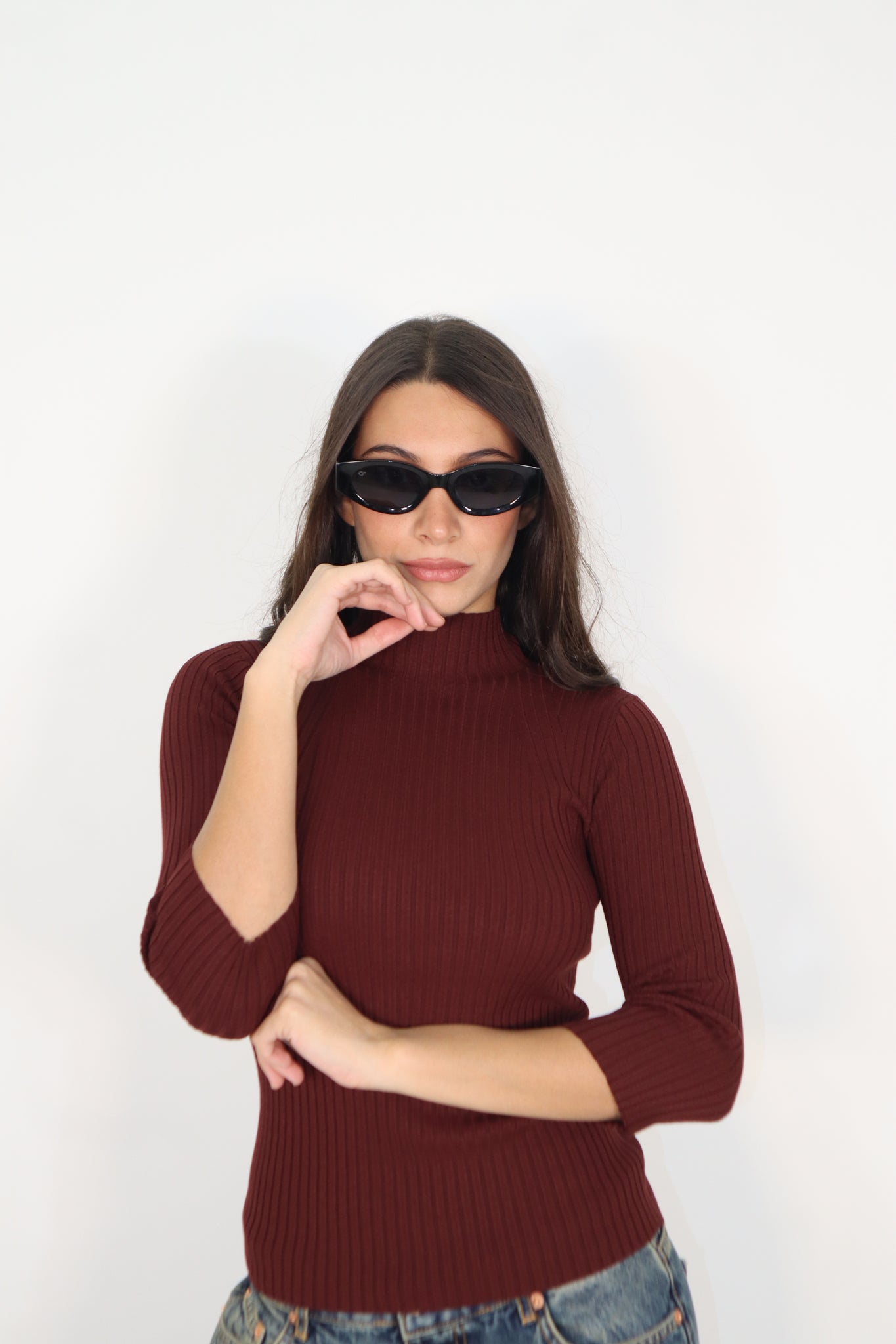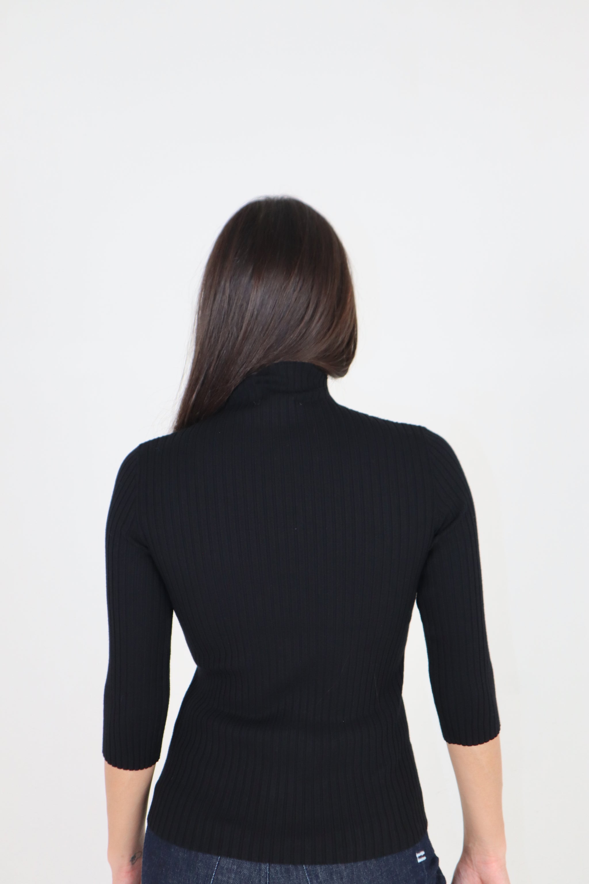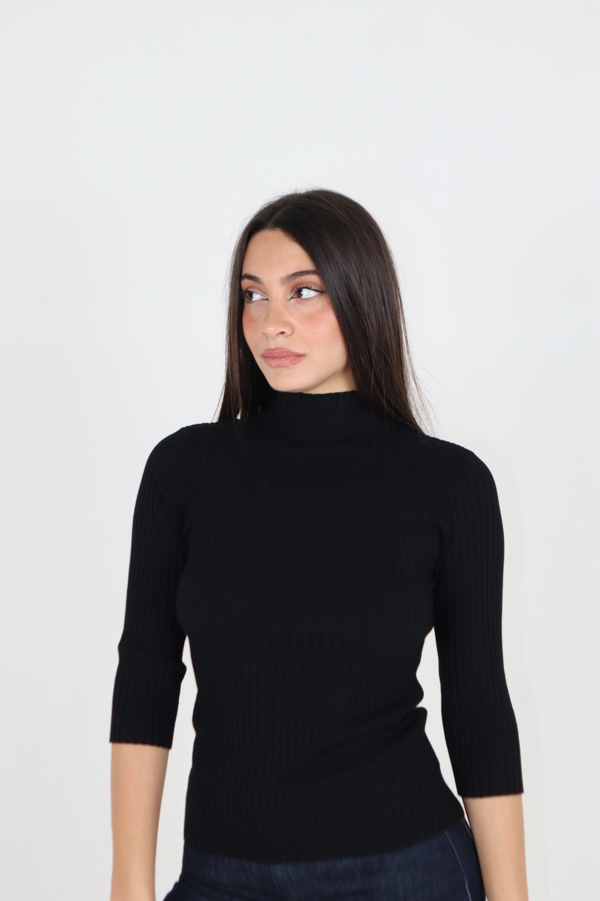 Maglia mezzo collo a costine e manica tre quarti . In viscosa e altre fibre.