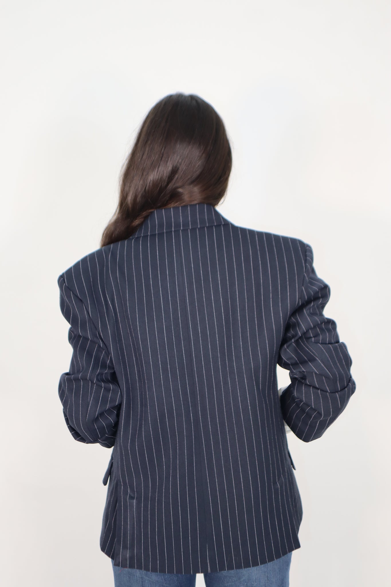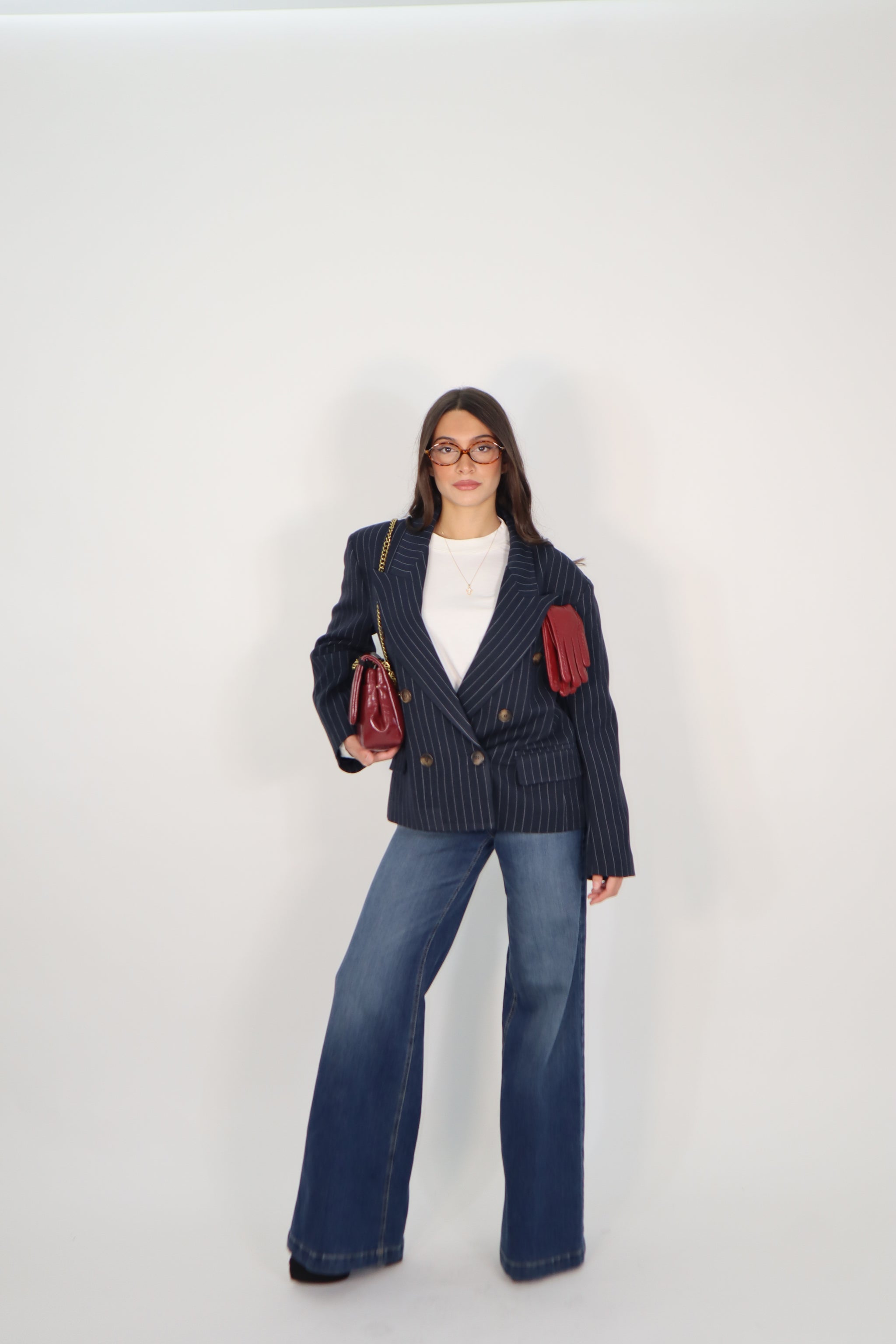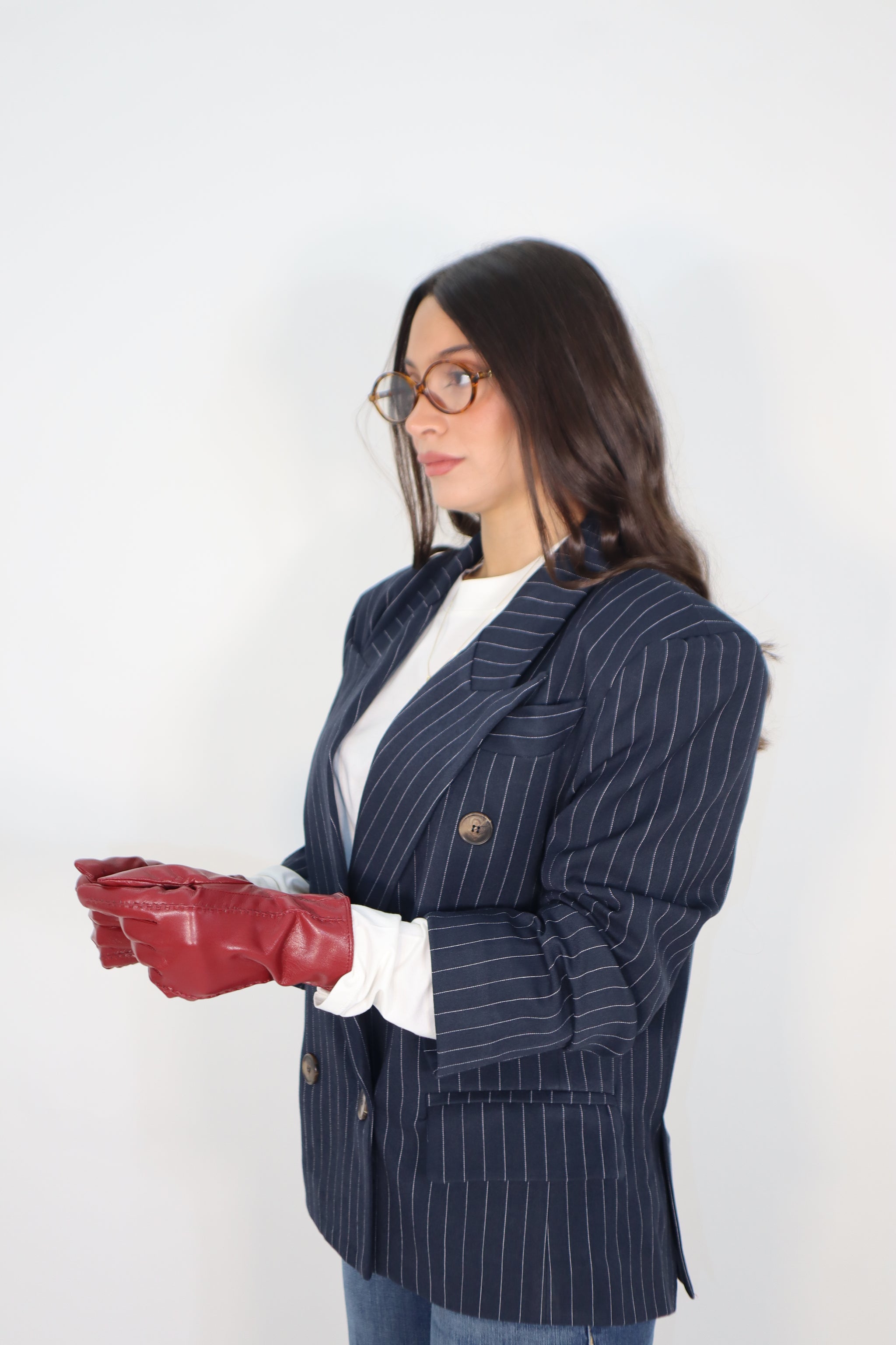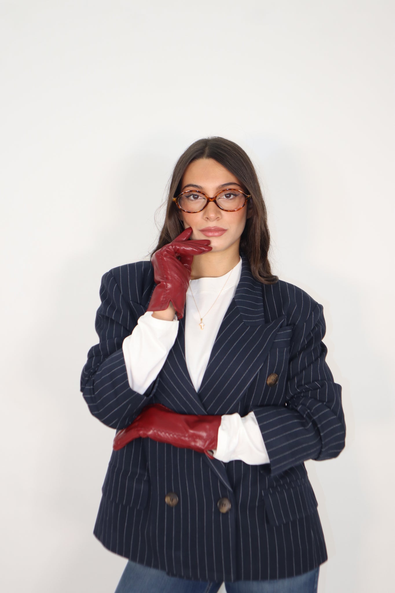 Blazer blu gessato doppiopetto a 6 bottoni bassa , crop oversize. con dettaglio guanto rosso.
