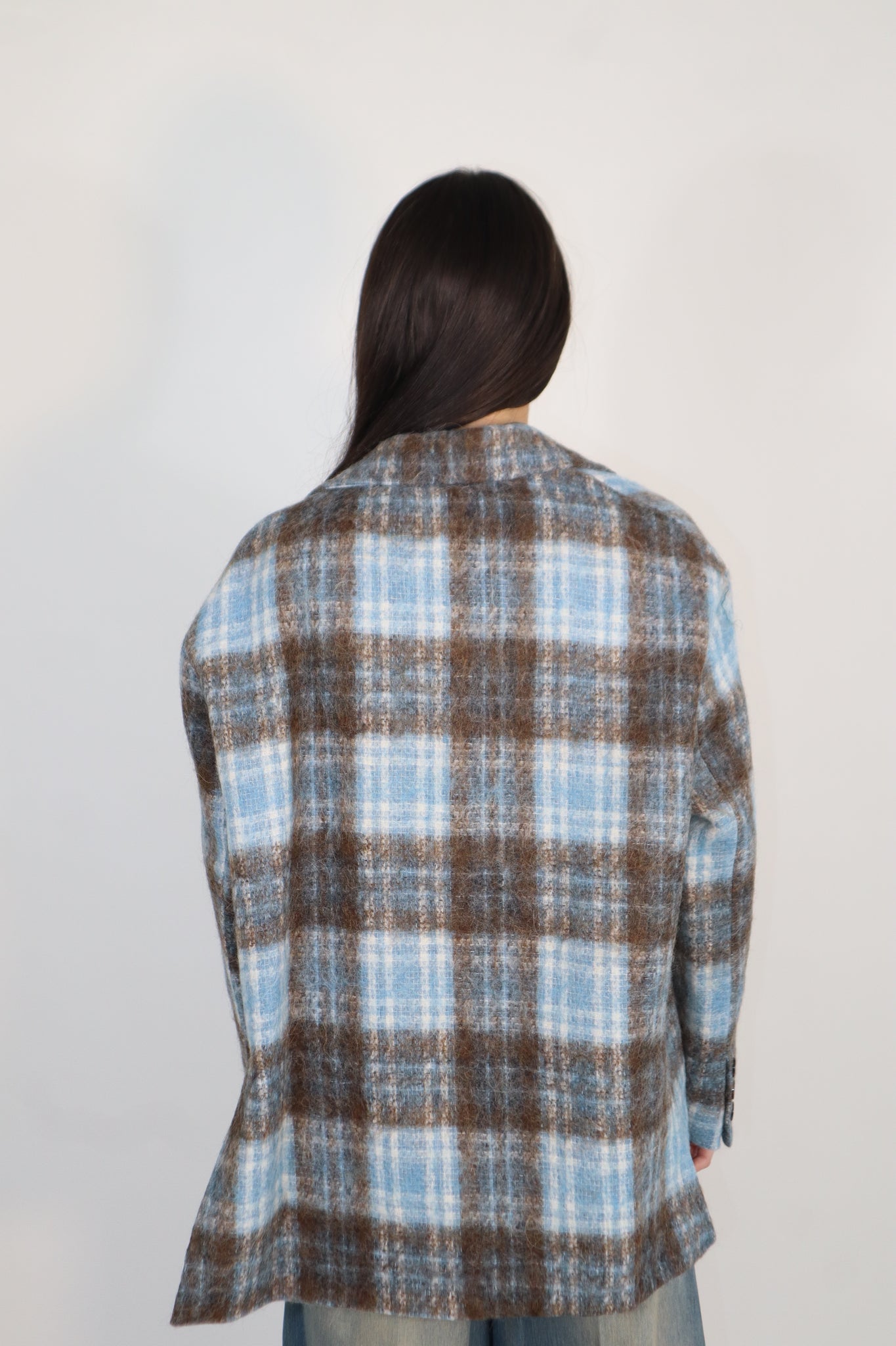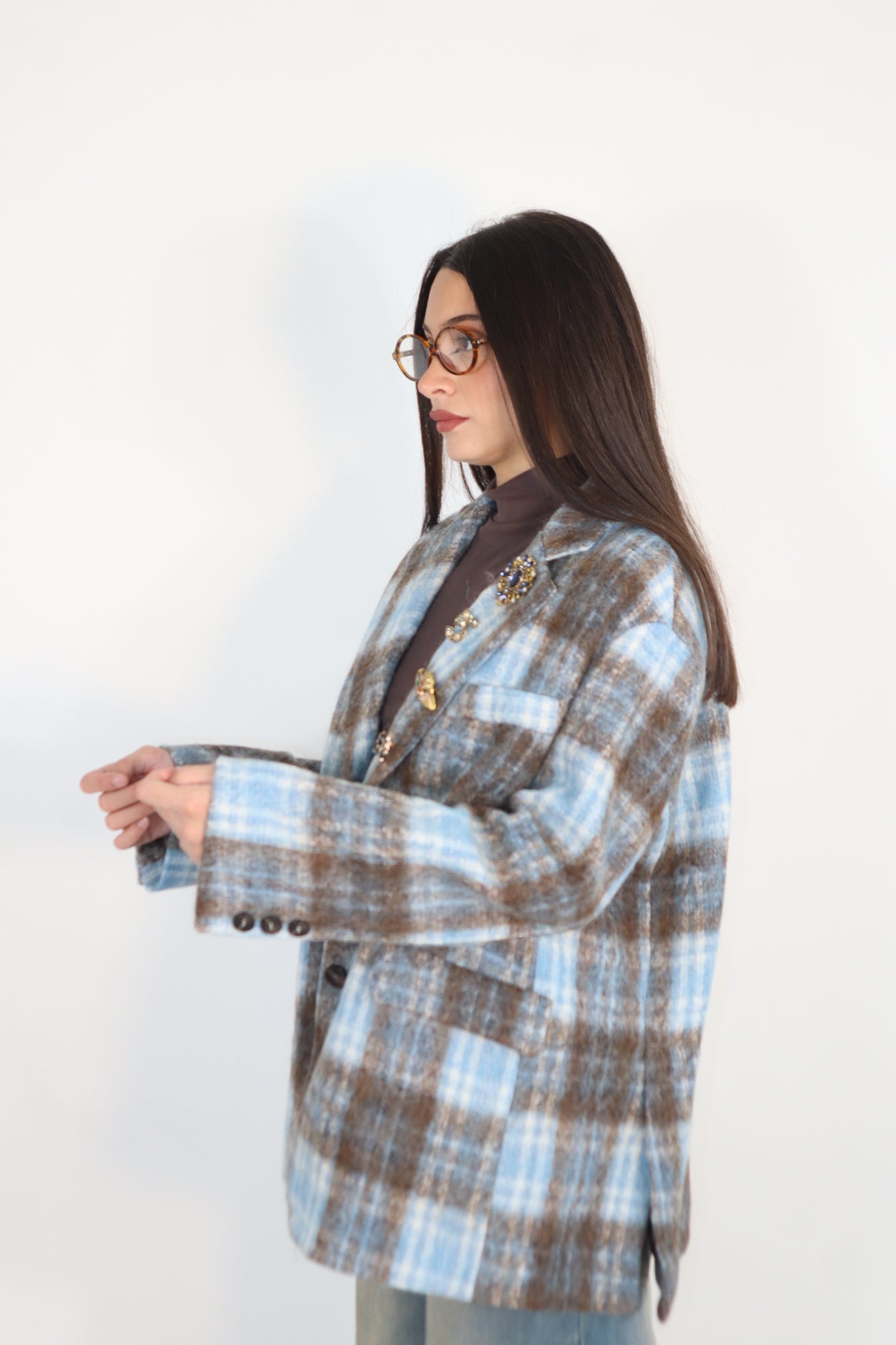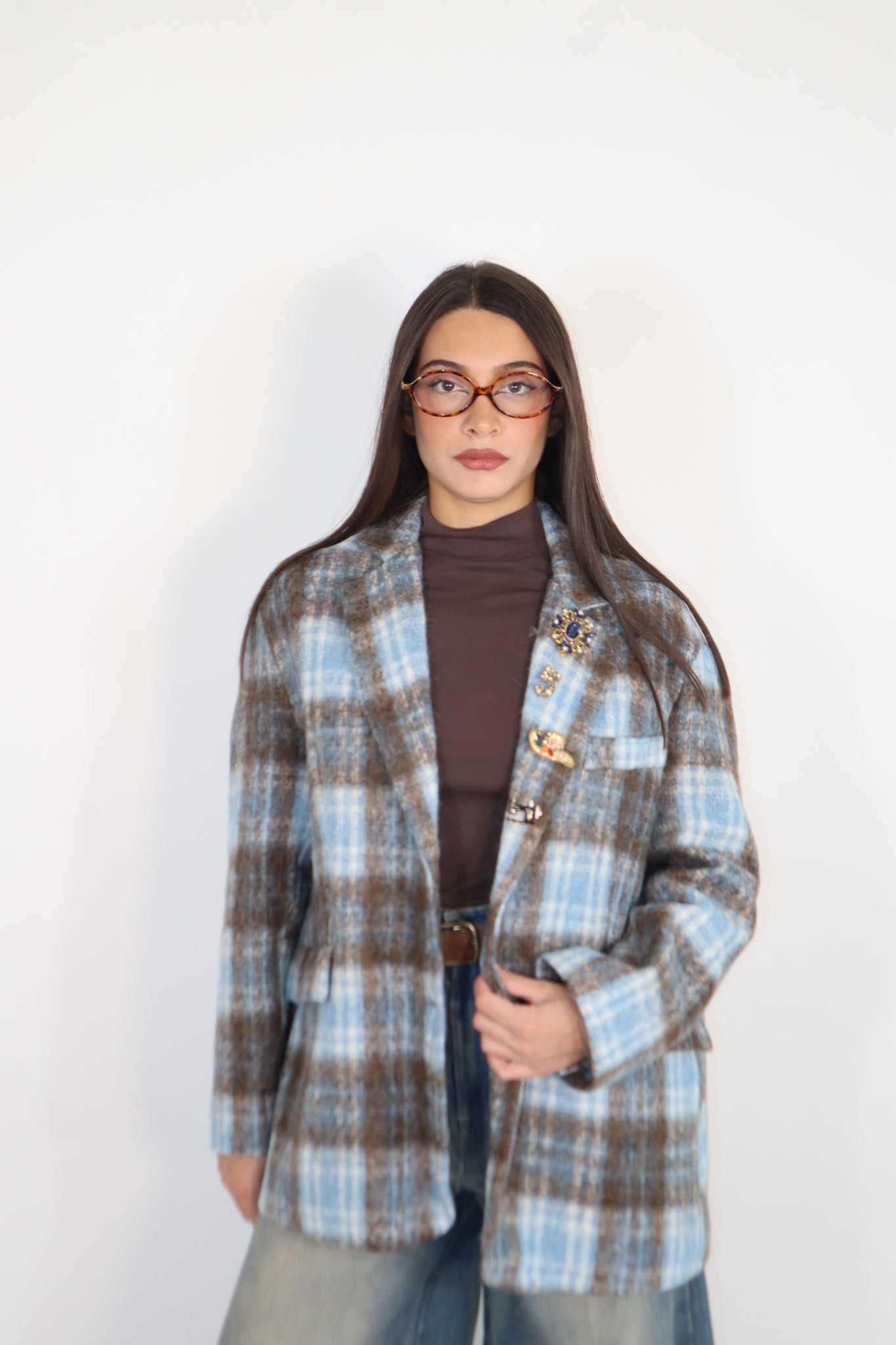 GIACCA CELESTE E MORO CON SPILLE APPLICATE