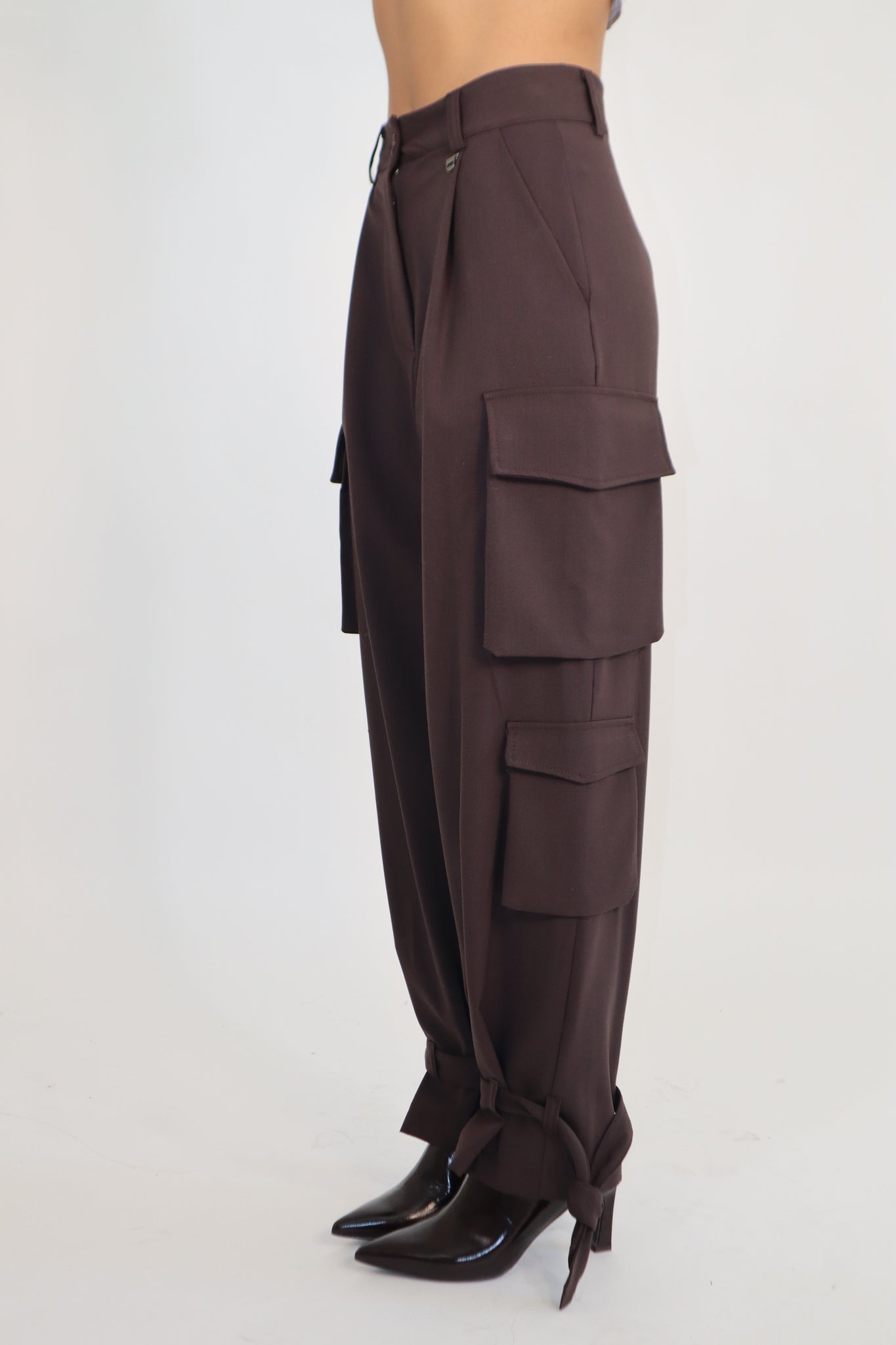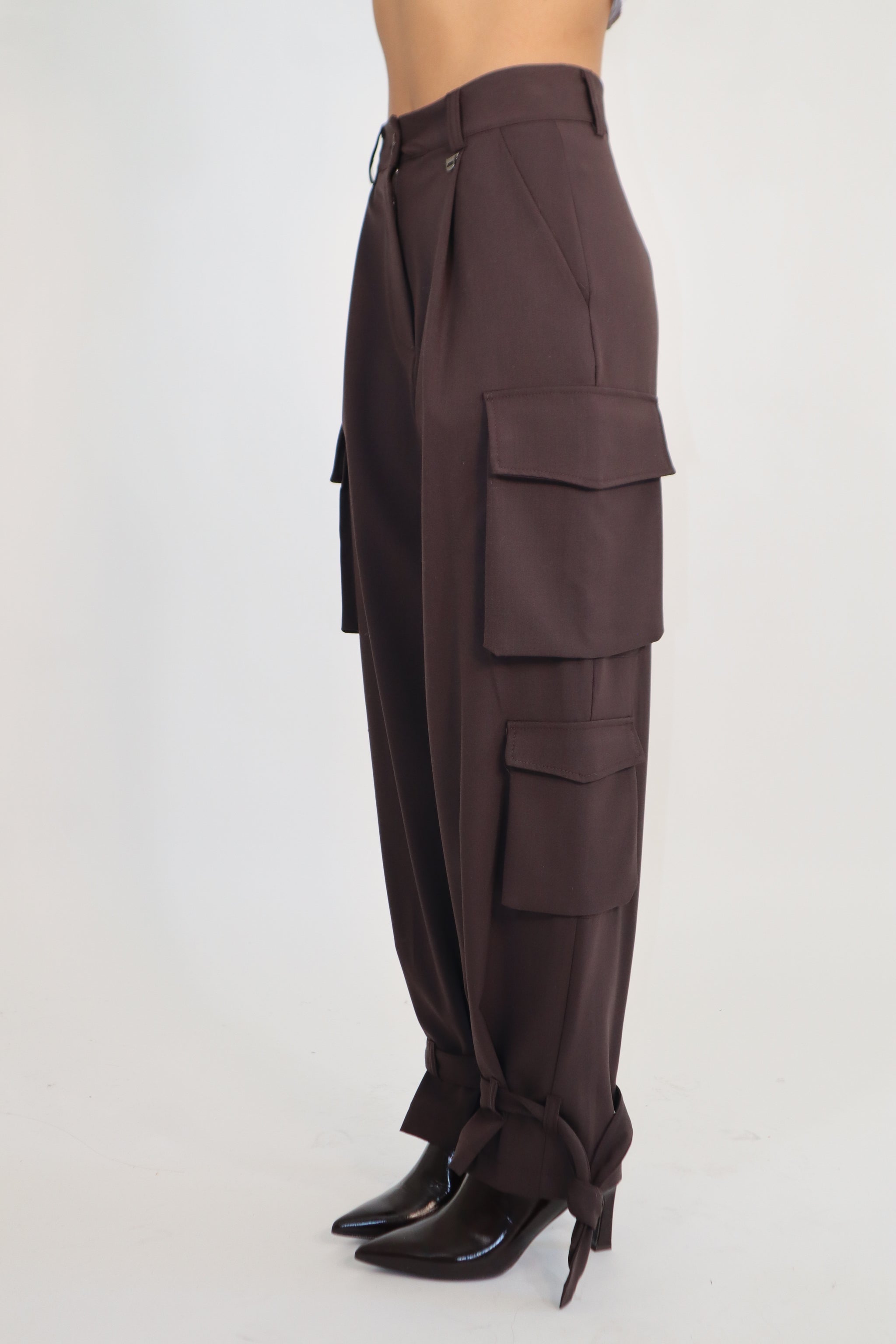 Pantalone cargo con TASCONI e lacci alle caviglie . In cioccolato , vestibilità regolare .