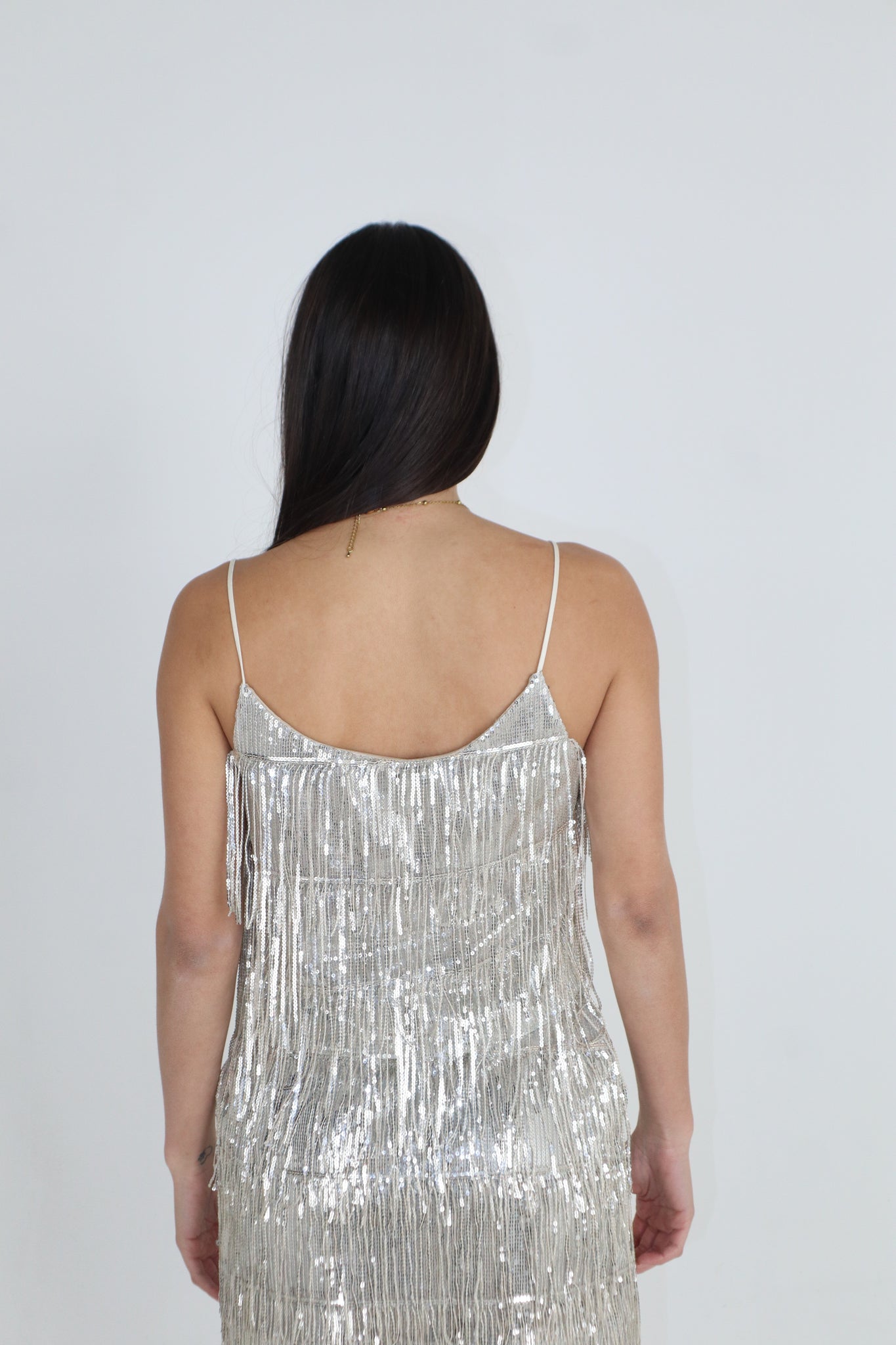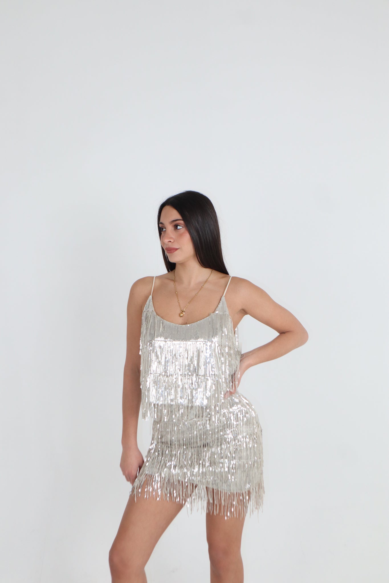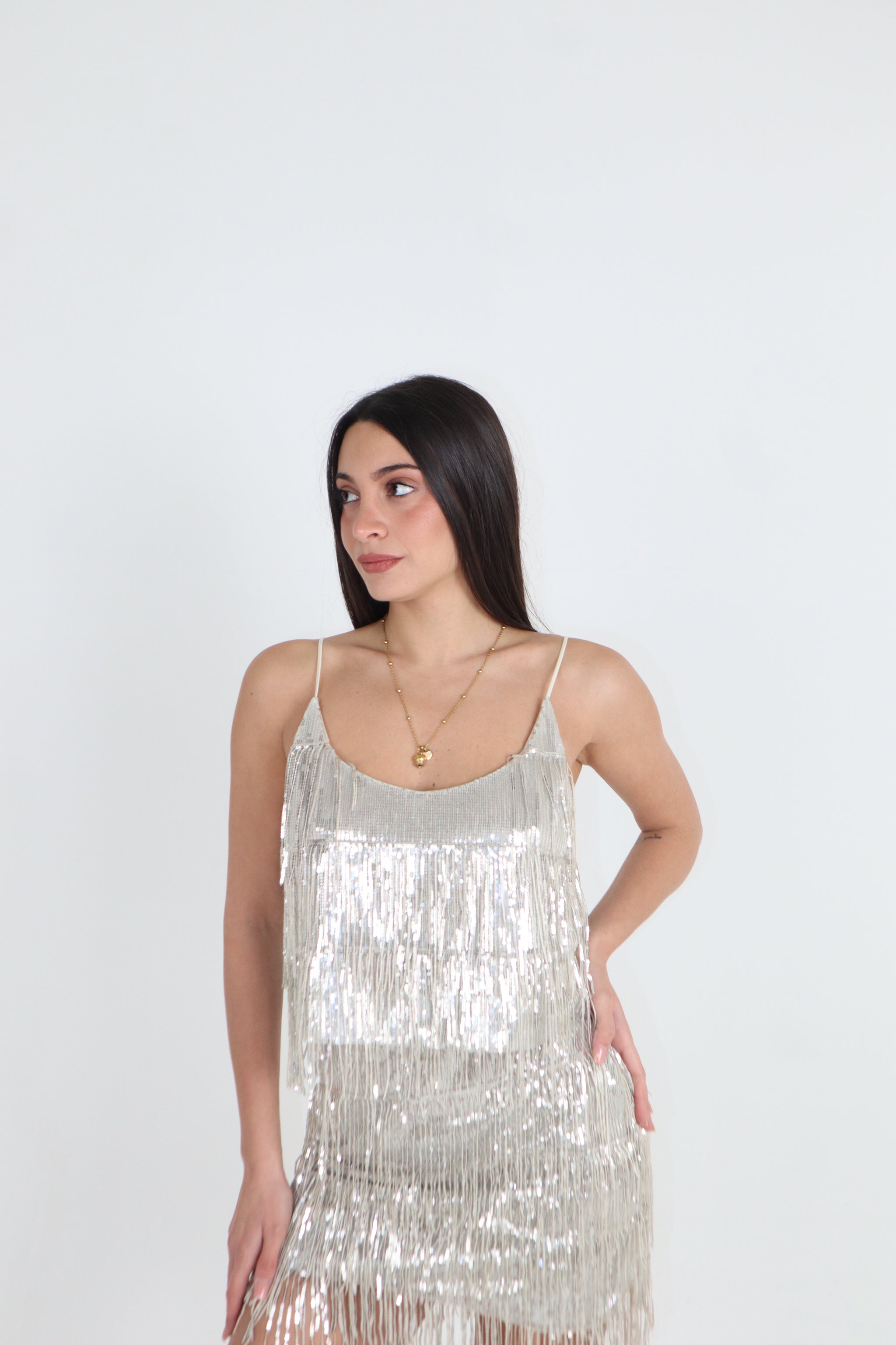 TOP CHAMPAGNE CON FRANGE E MICRO PAILLETTES