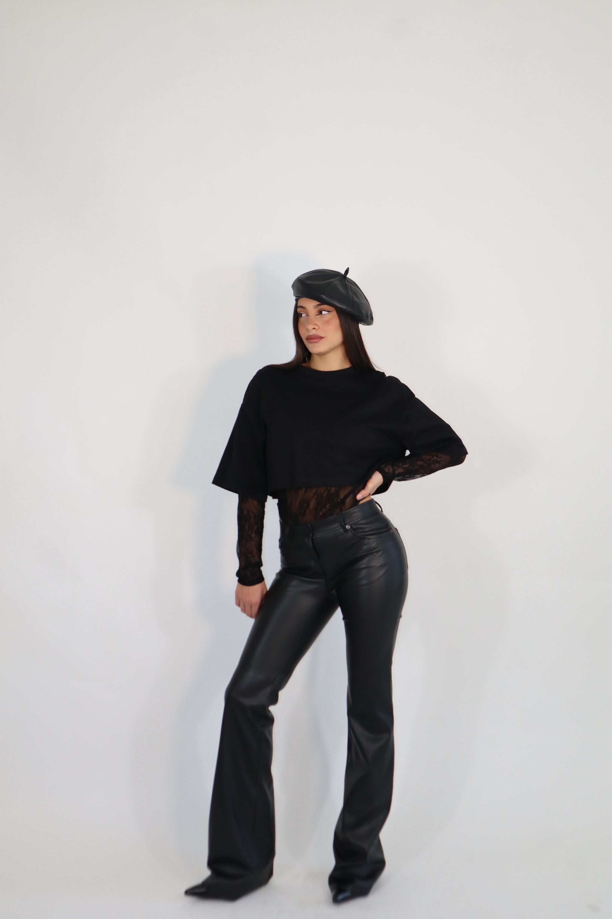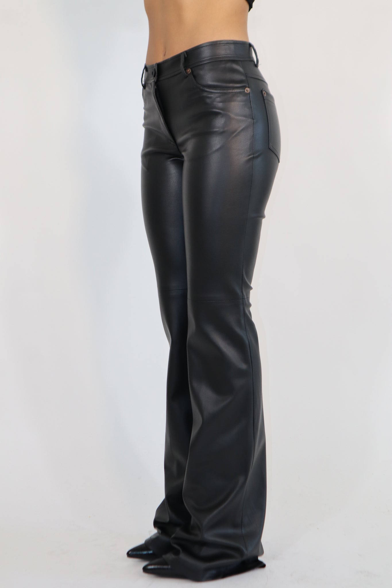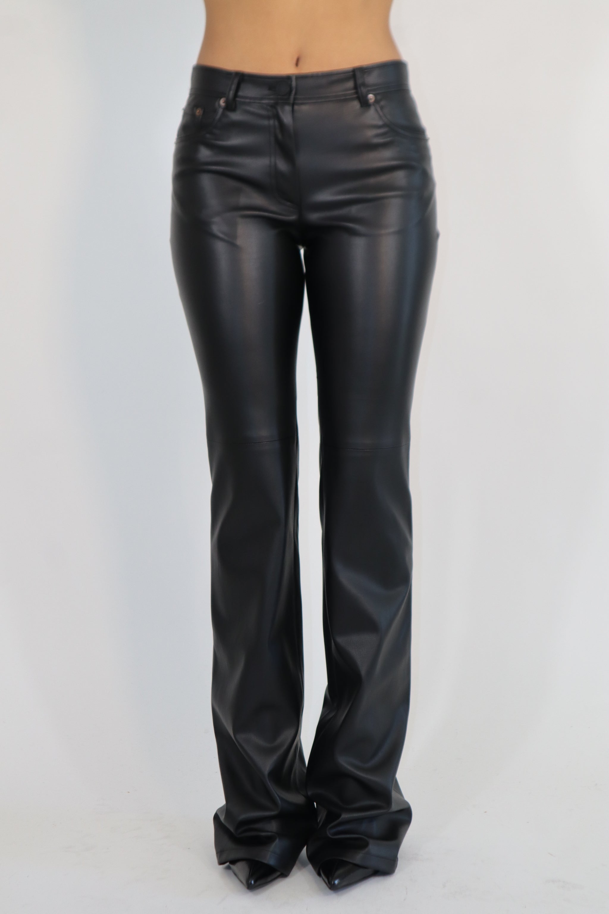 I PANTALONI CARLY IN TESSUTO SPALMATO UNISCONO IL FASCINO DEL FINISH EFFETTO PELLE A UN TAGLIO D’ISPIRAZIONE ‘70S. LA GAMBA LEGGERMENTE SVASATA SLANCIA LA SILHOUETTE, MENTRE LE CUCITURE IN EVIDENZA E LE TASCHE POSTERIORI DONANO UN TOCCO GRINTOSO E CONTEMPORANEO.