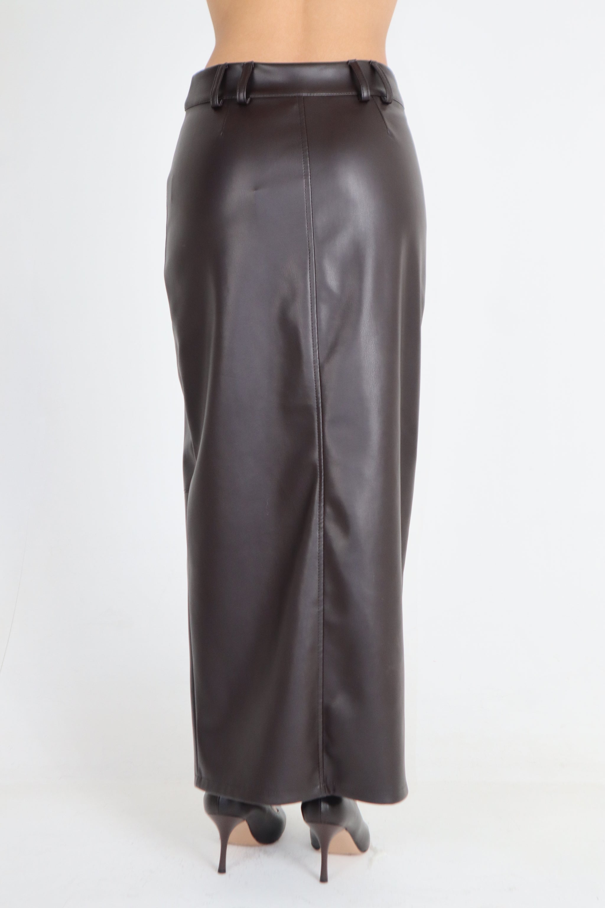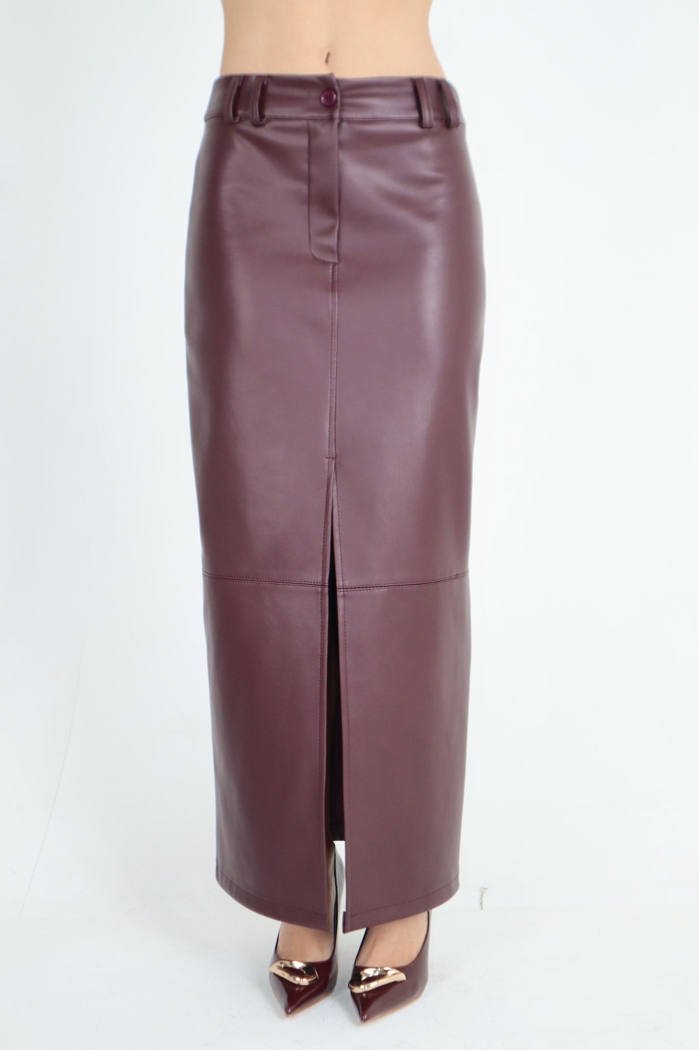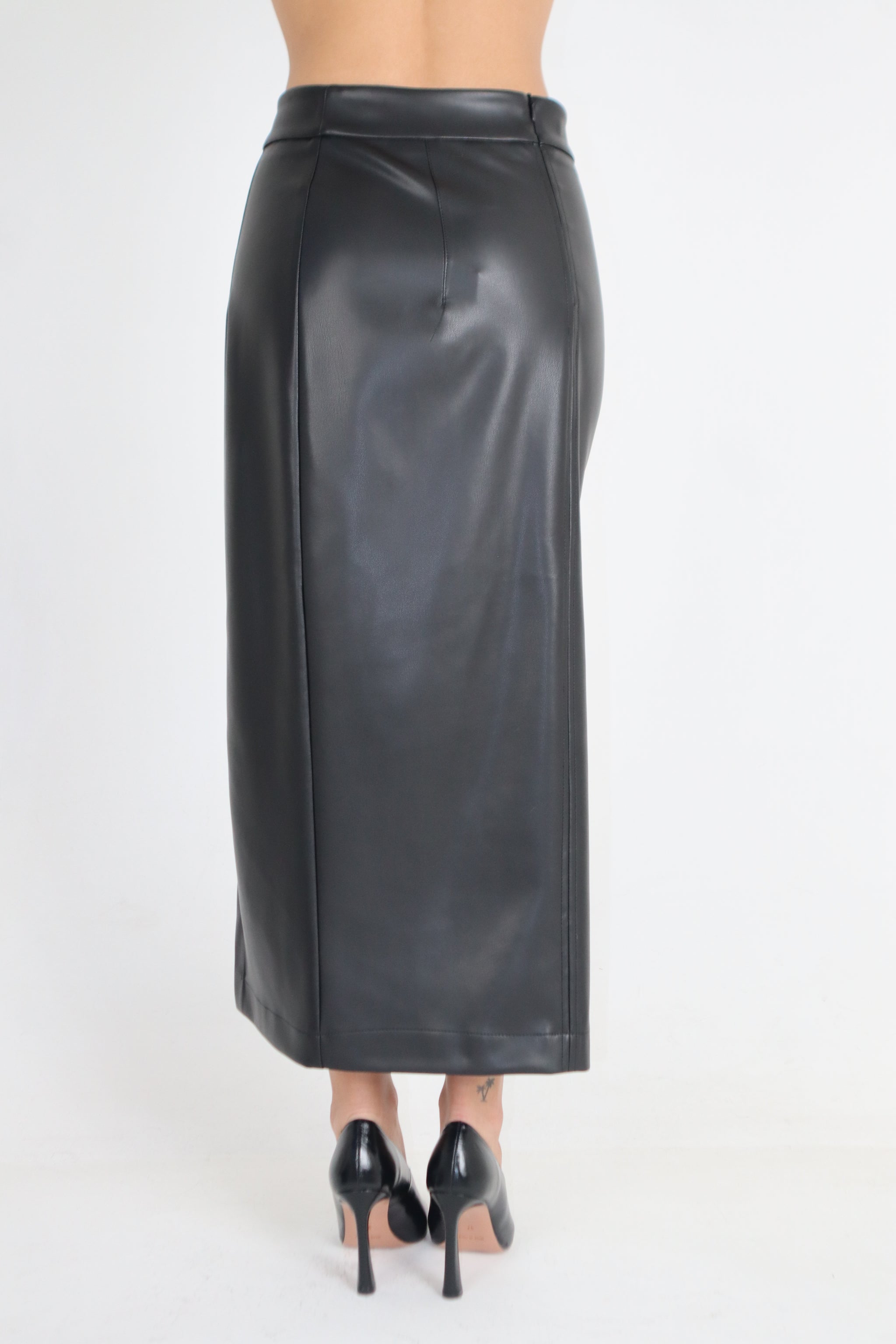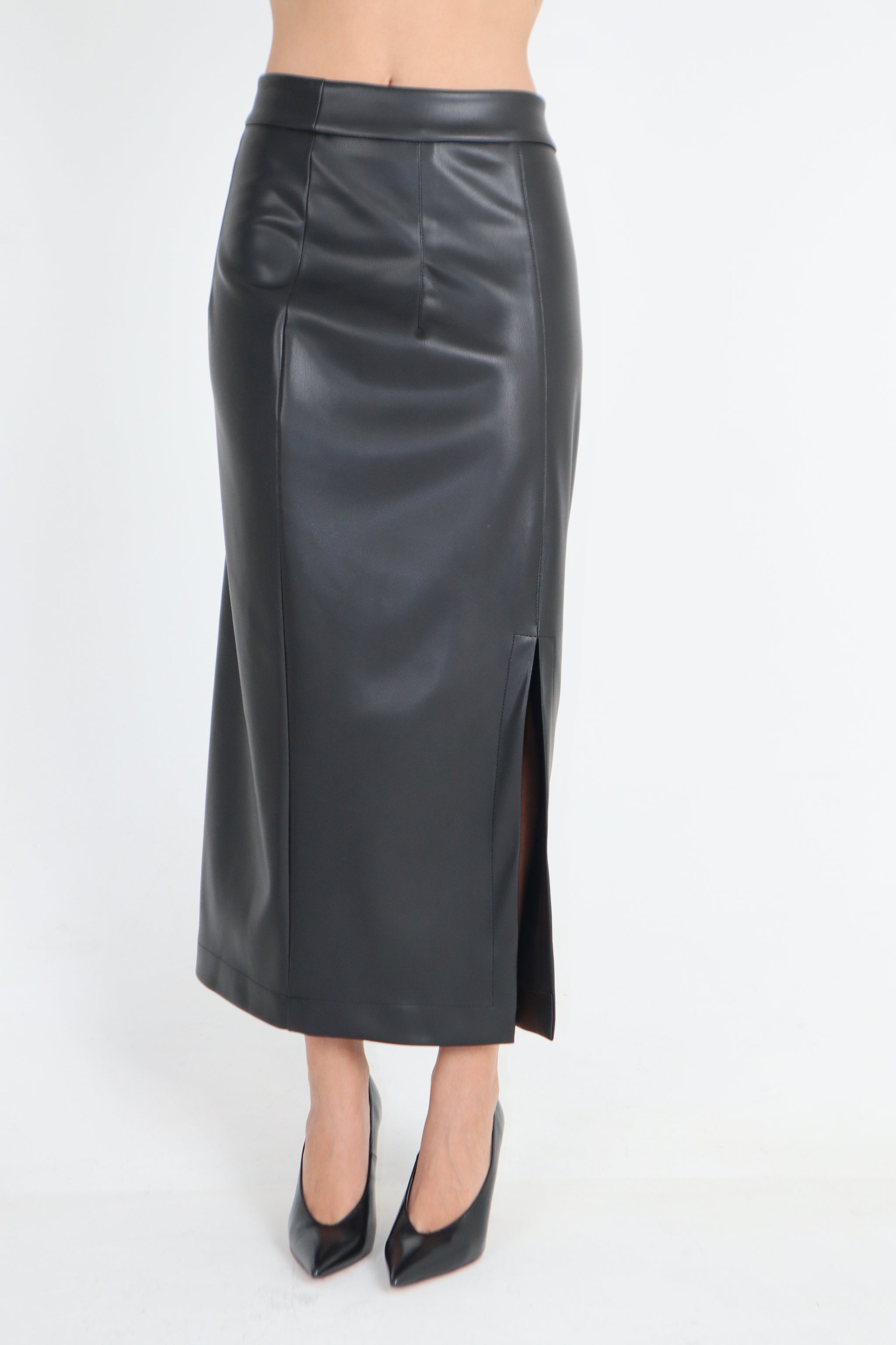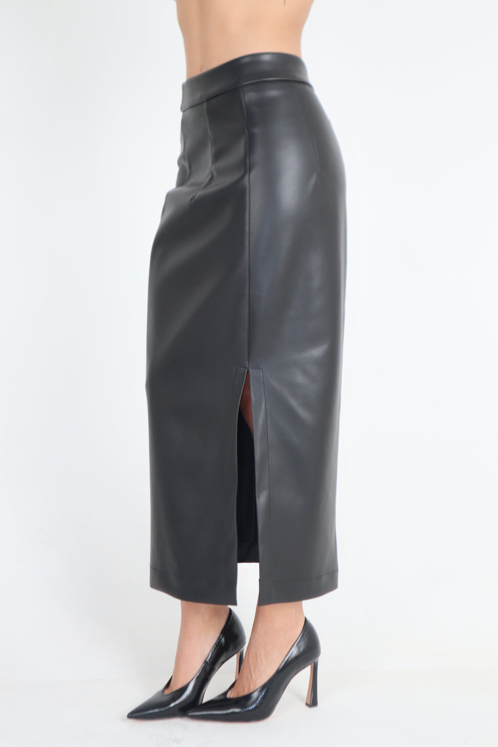 Gonna lunga in similpelle con impunture sotto al ginocchio con spacco frontale.