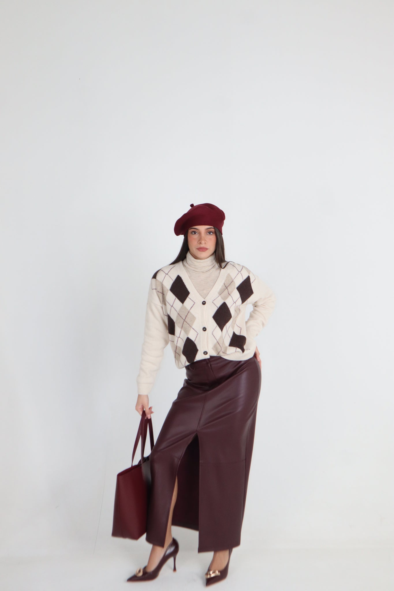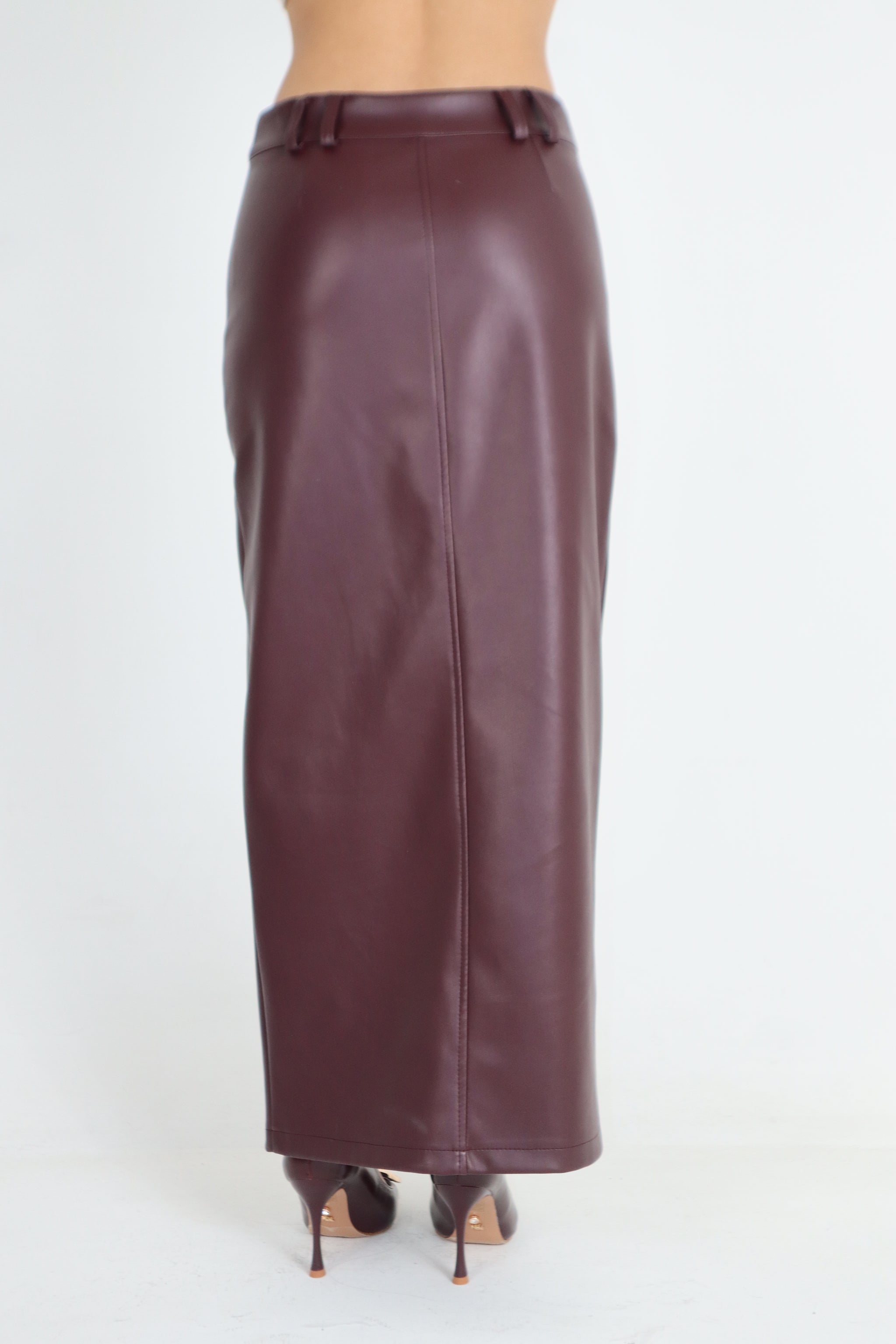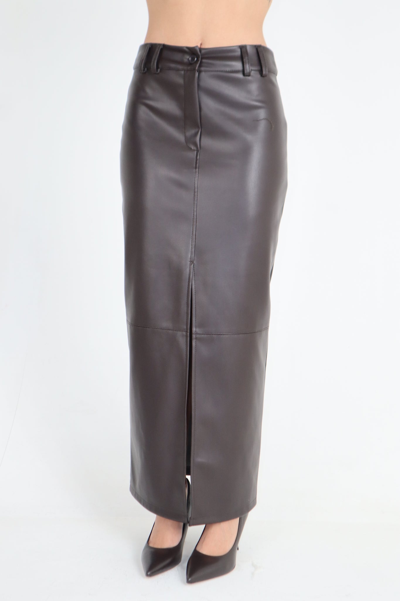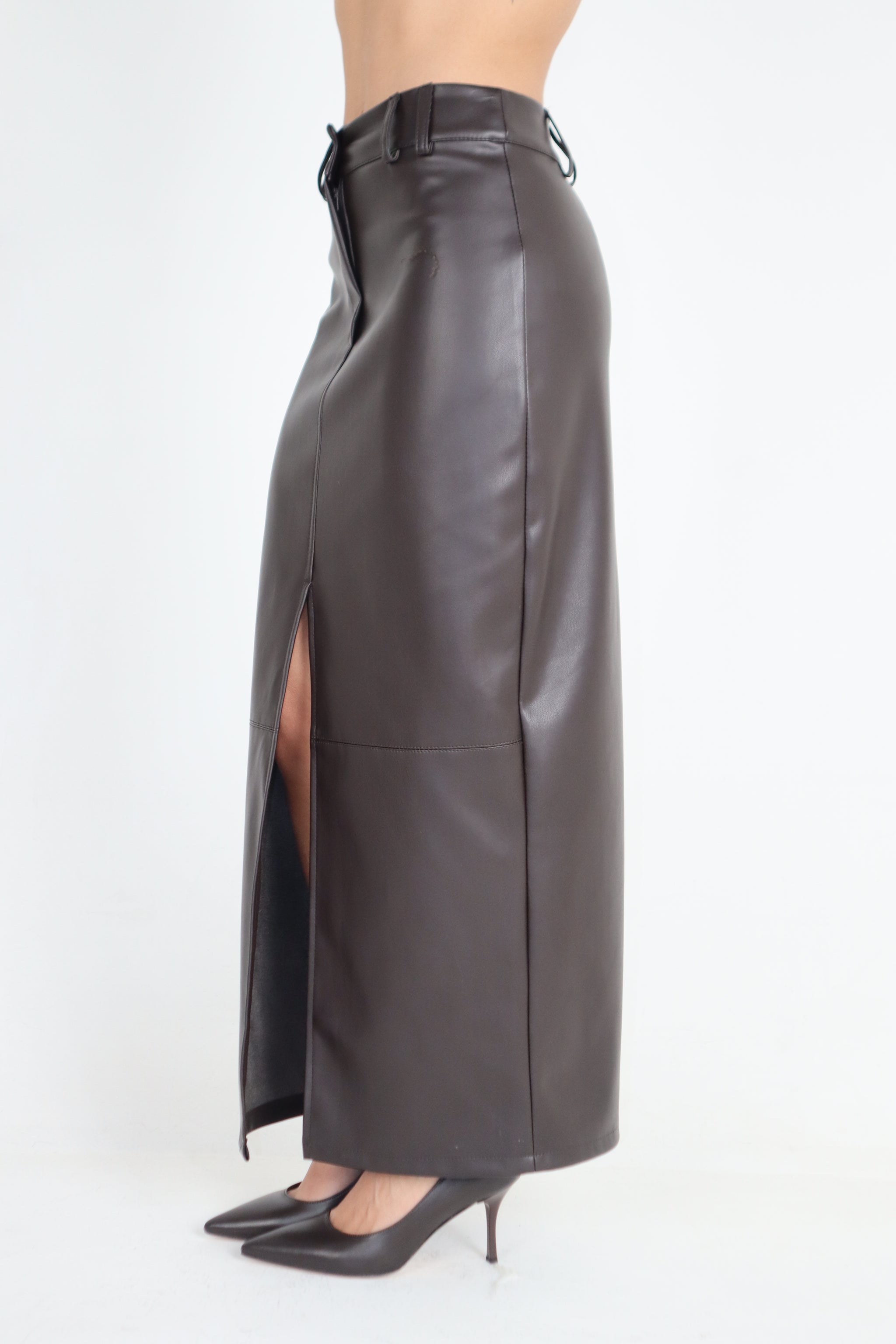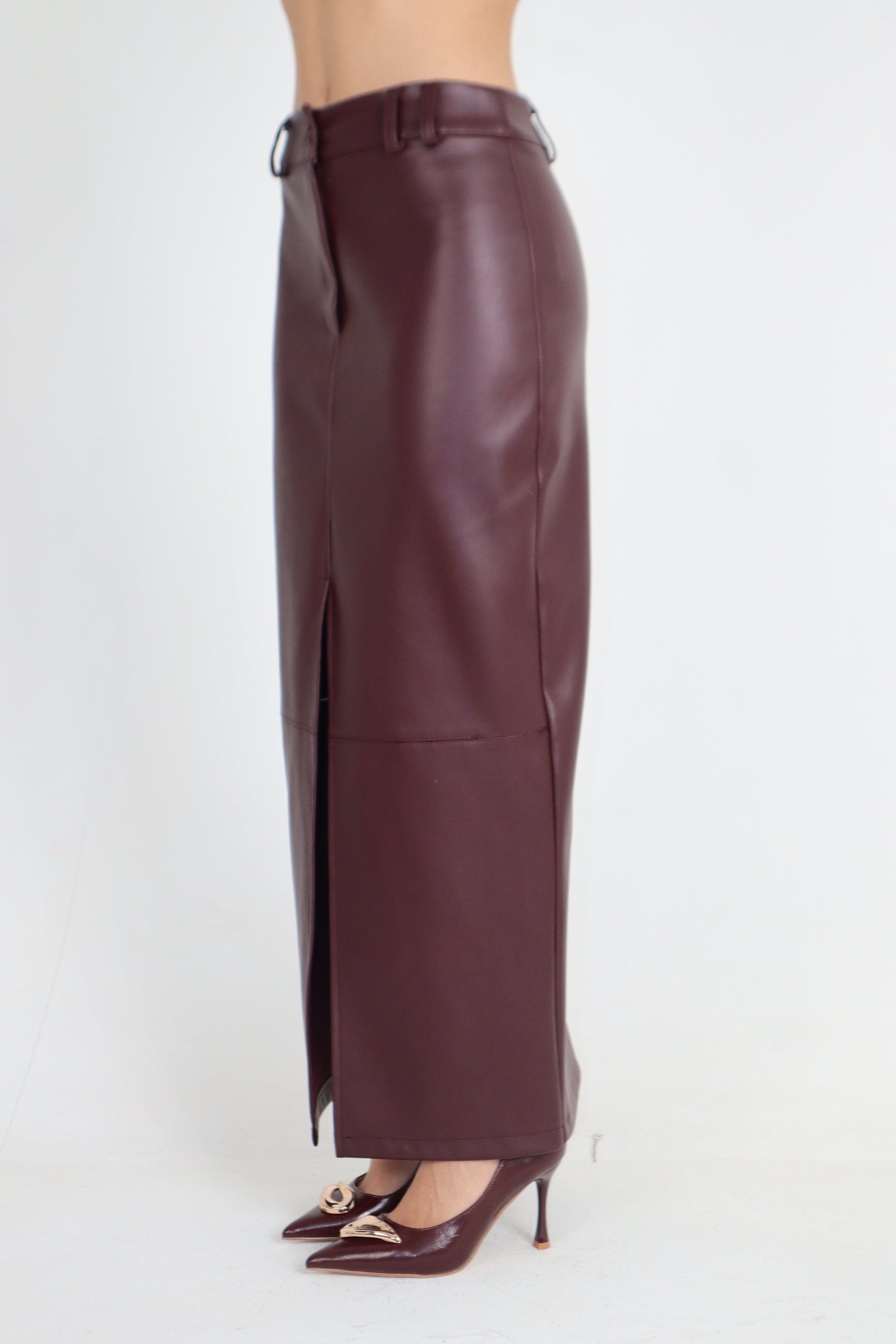 Gonna lunga in similpelle con impunture sotto al ginocchio con spacco frontale.