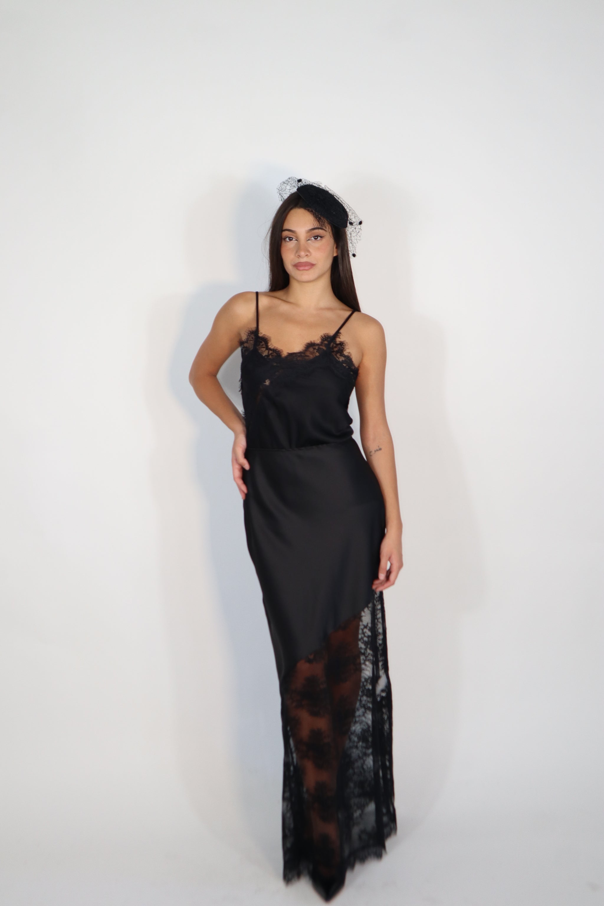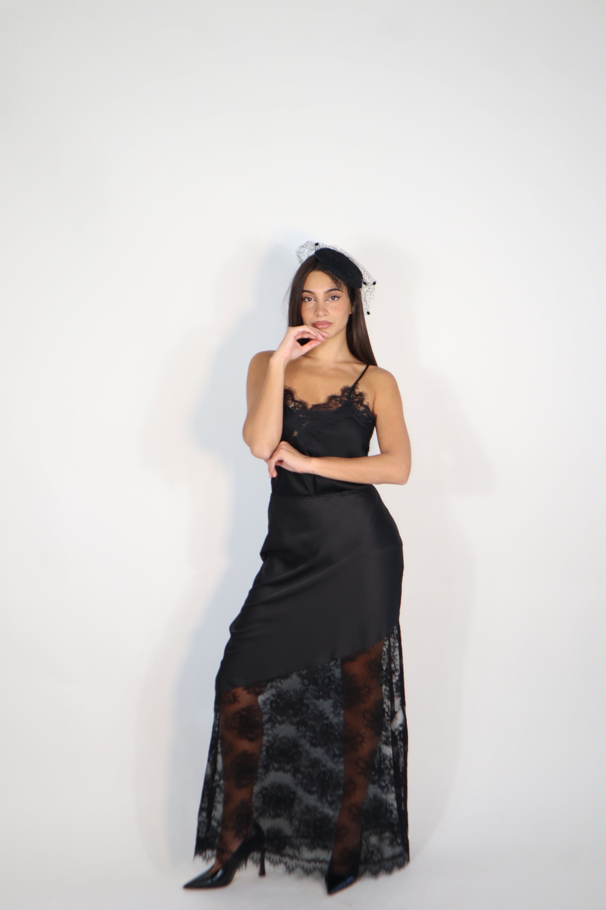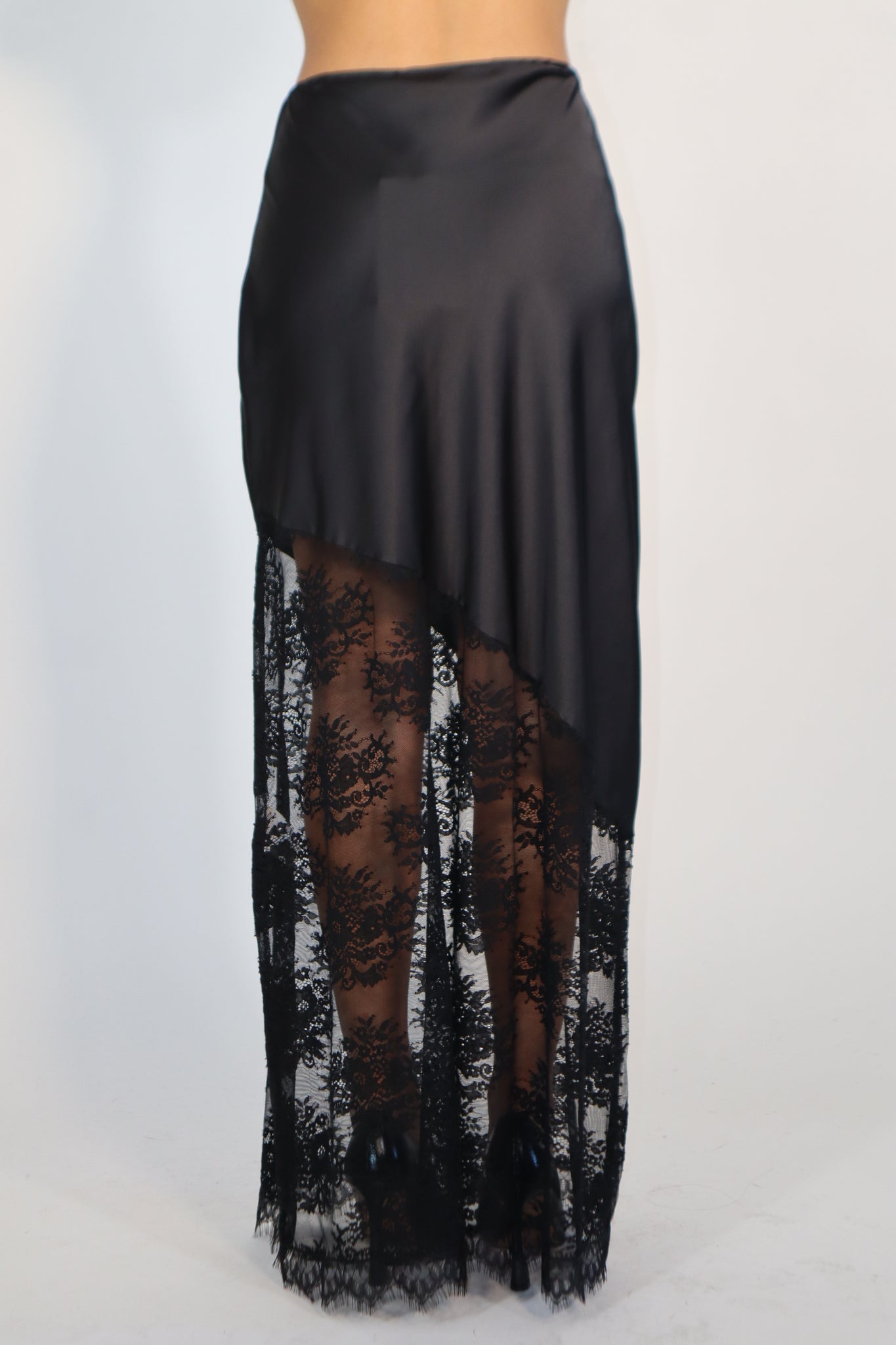 Gonna satin longuette con taglio trasversale e inserto in pizzo .