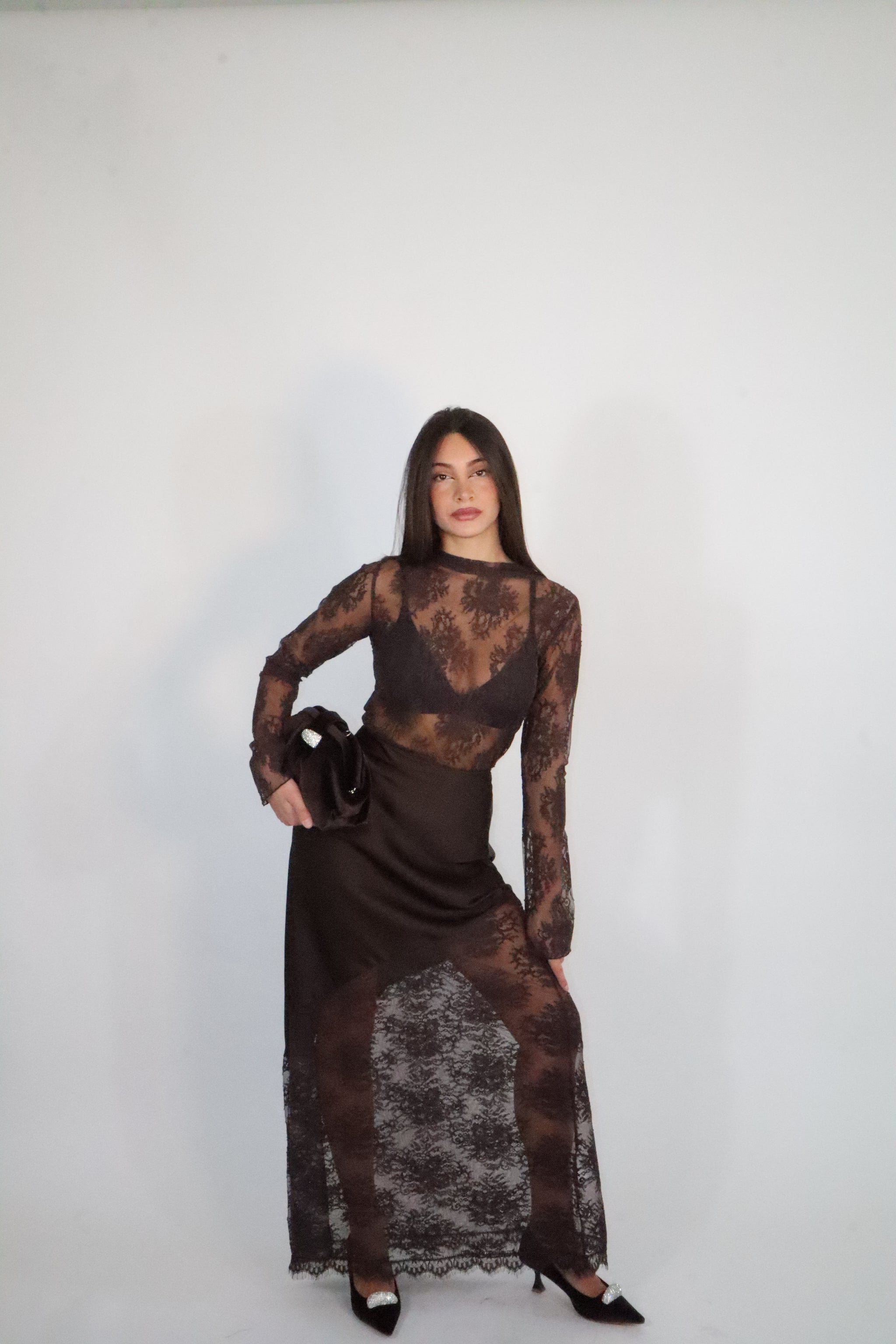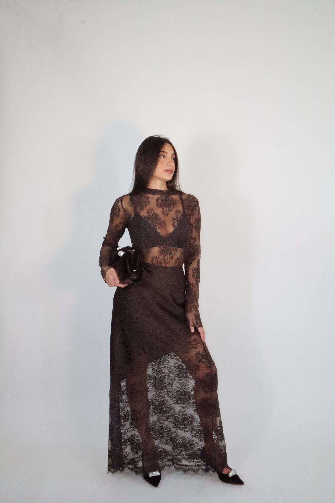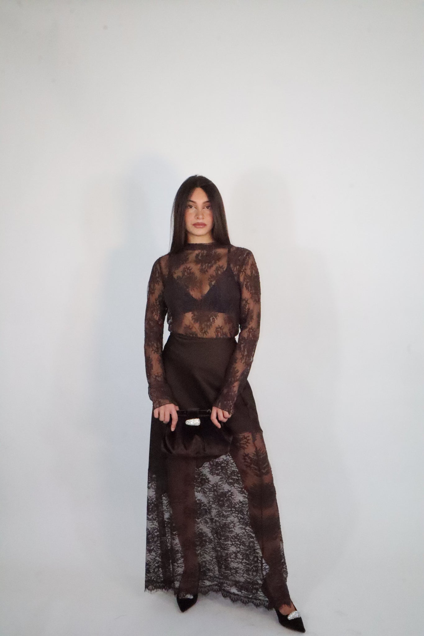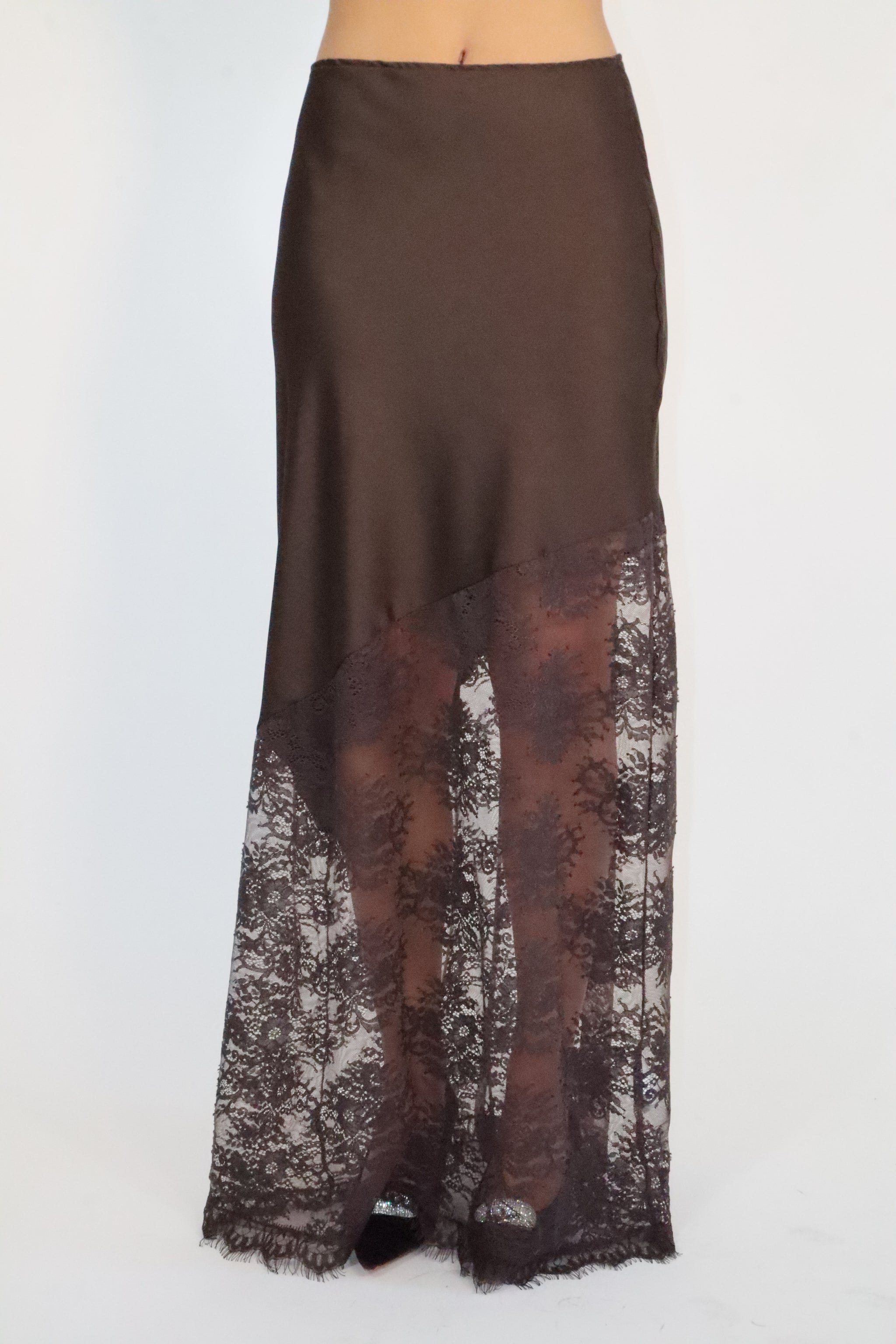 Gonna satin longuette con taglio trasversale e inserto in pizzo .