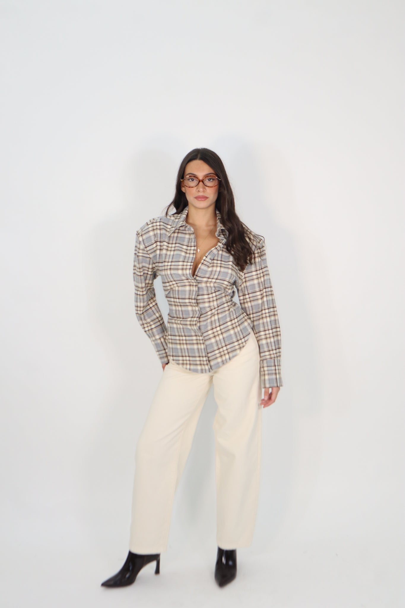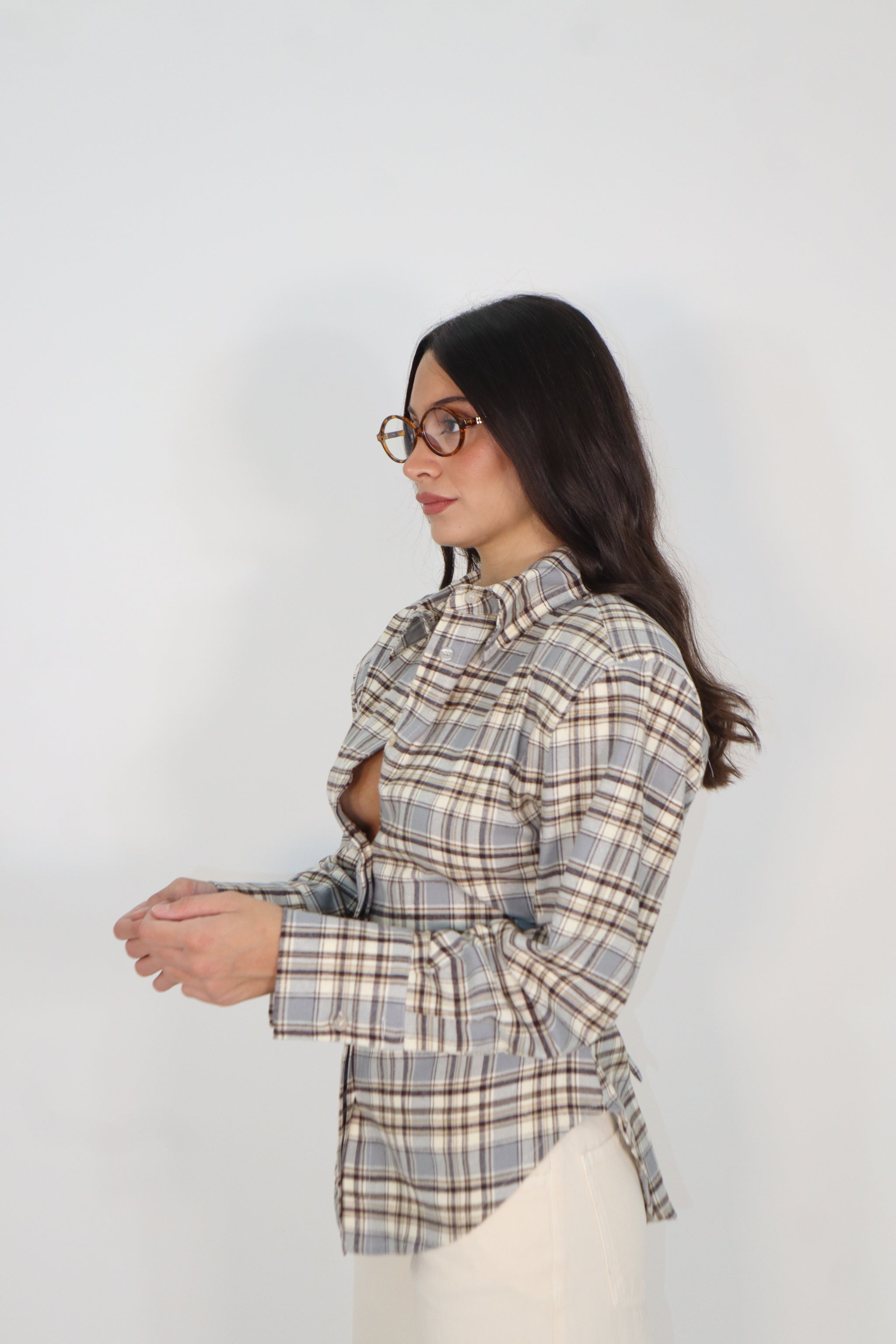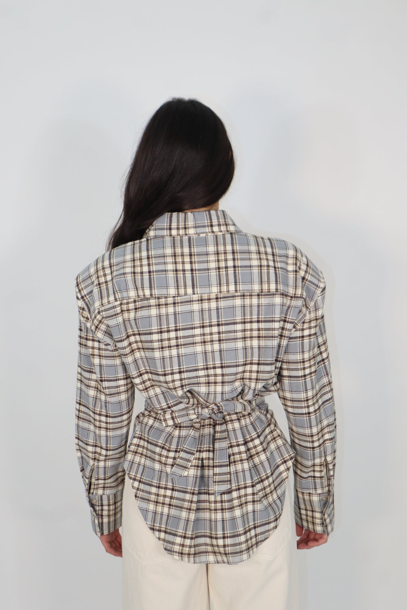 Camicia quadri celeste e moro a fondo naturale . Con spallina importante , sul retro ha la cinturina in tessuto.
