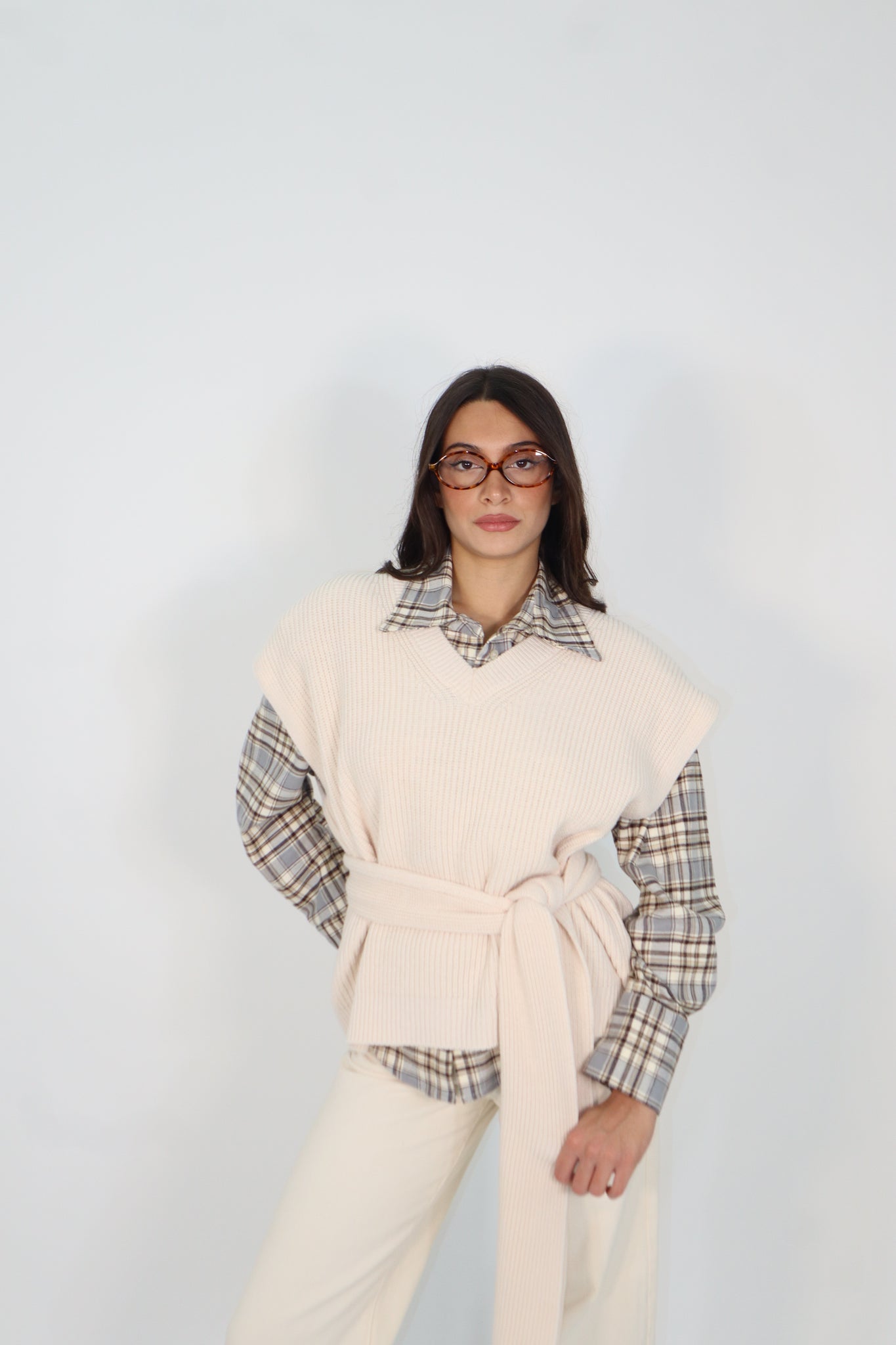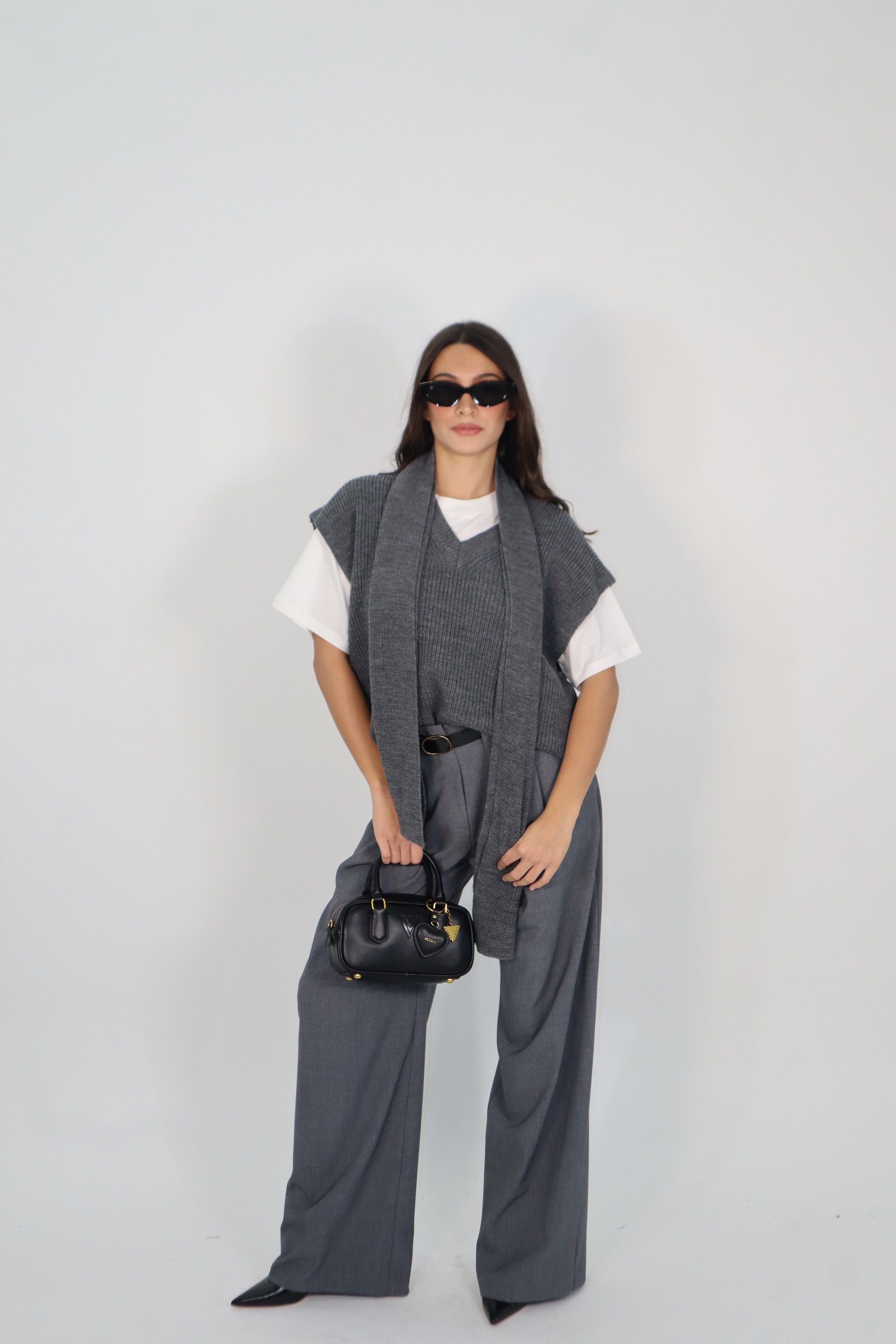 GILET , giromanica profondo e collo sciarpa removibile utilizzabile anche come cintura.