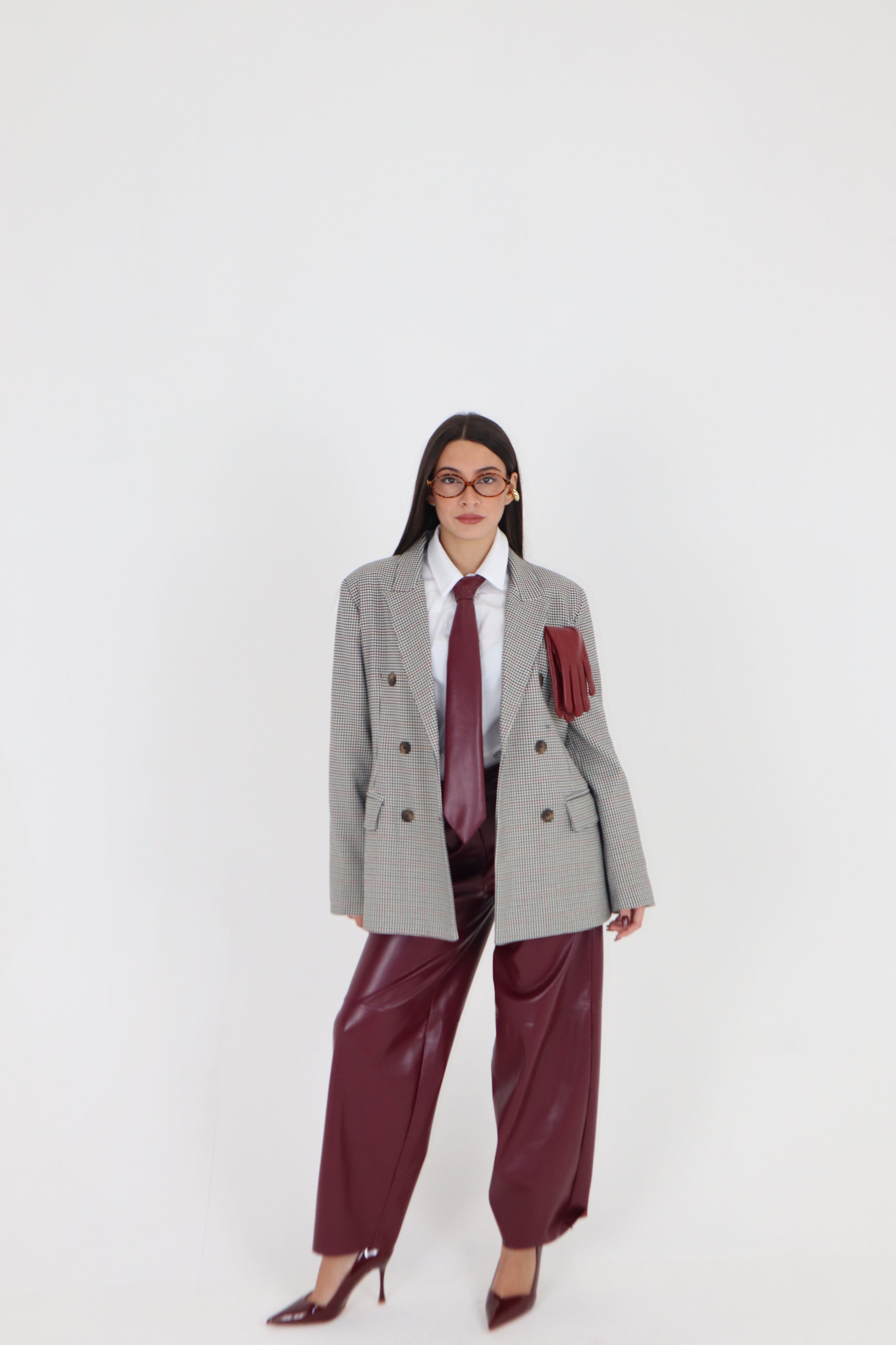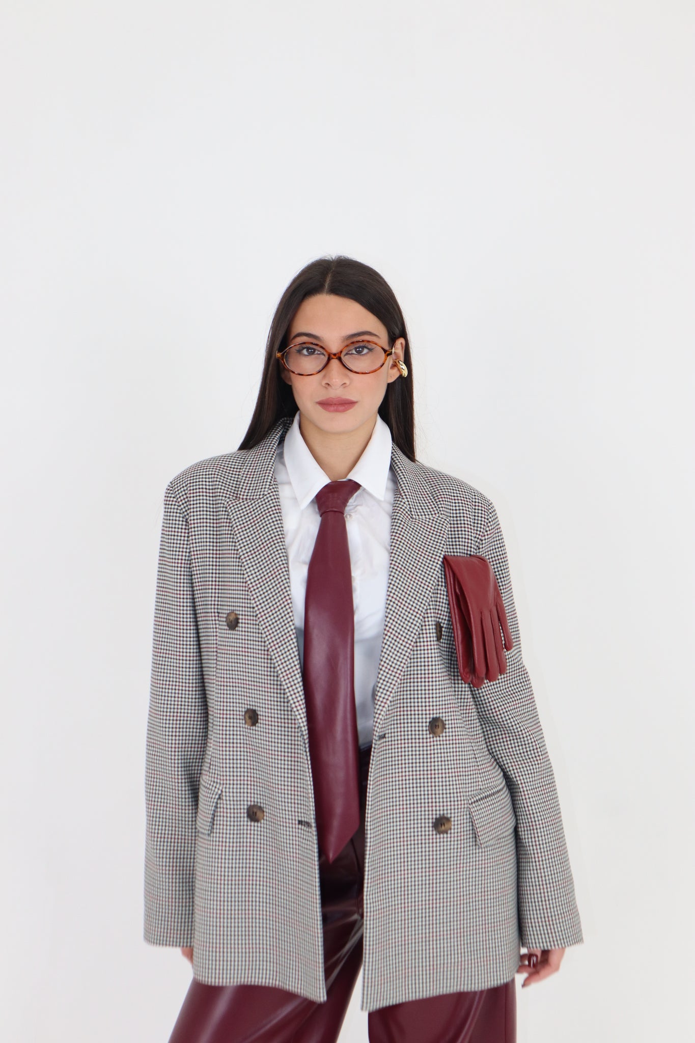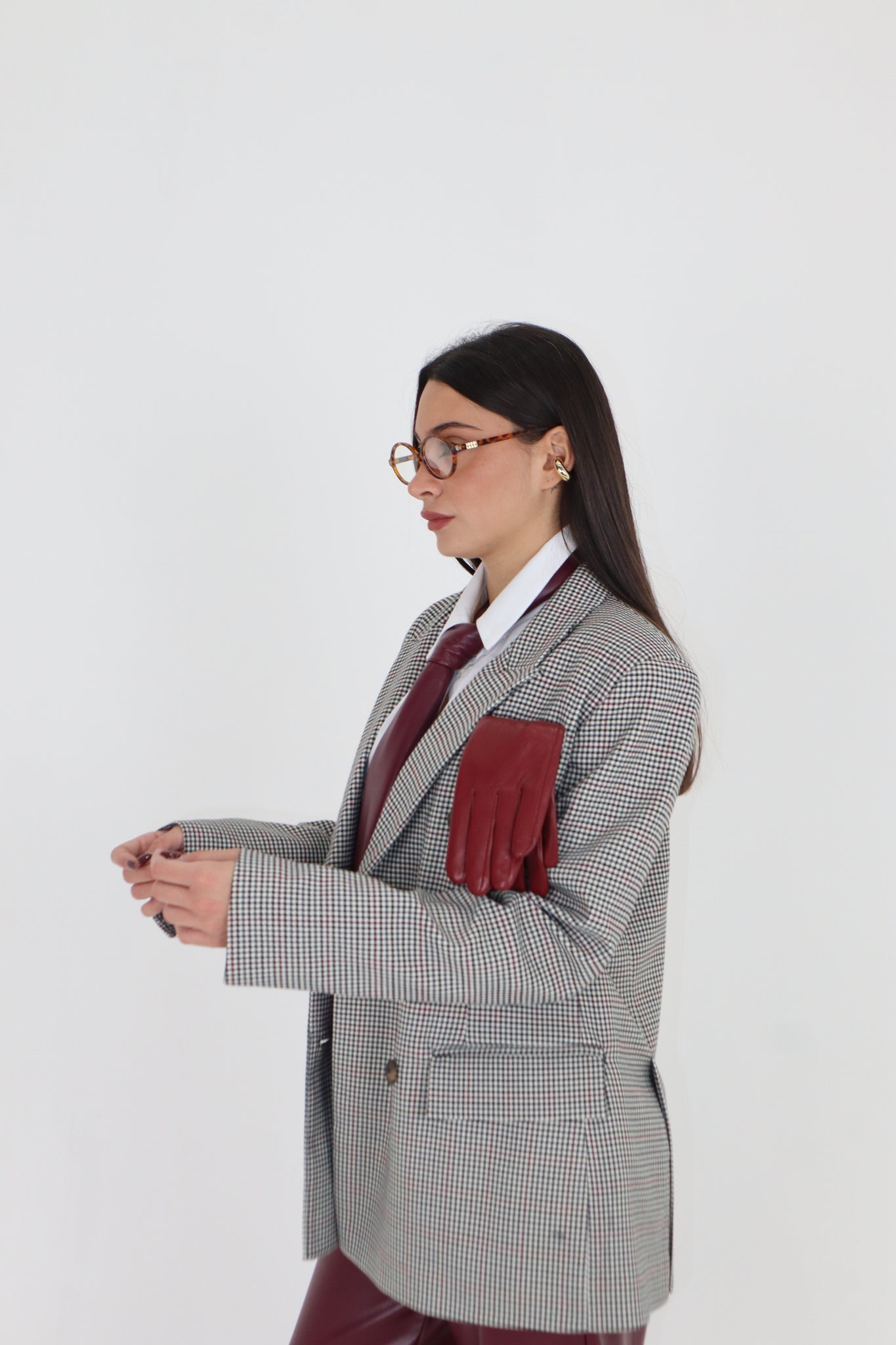 Blazer in check e quadri sui toni del nero e del rosso con dettaglio guanto rosso. Doppiopetto over , bassa a 6 bottoni. Foderata.