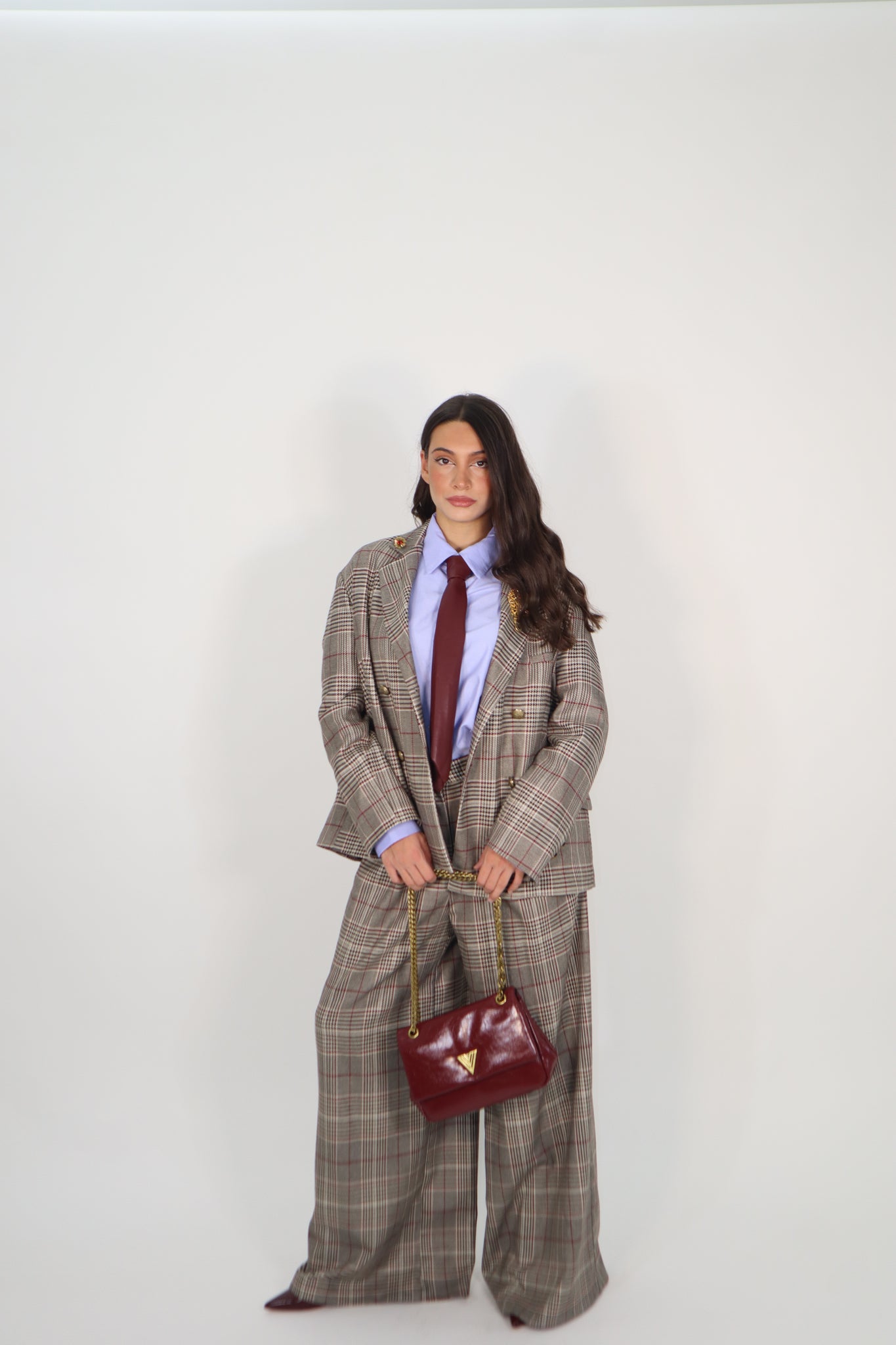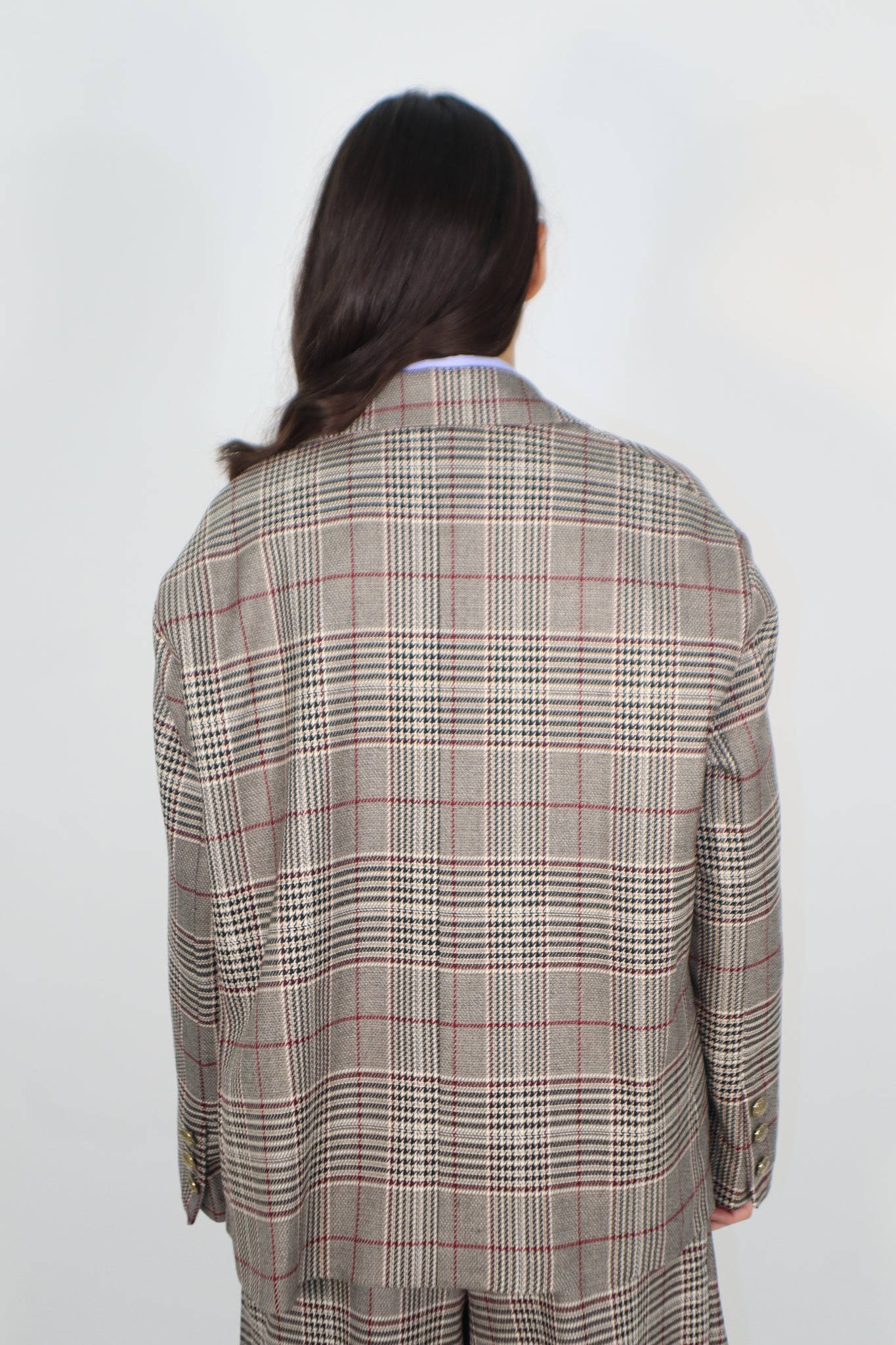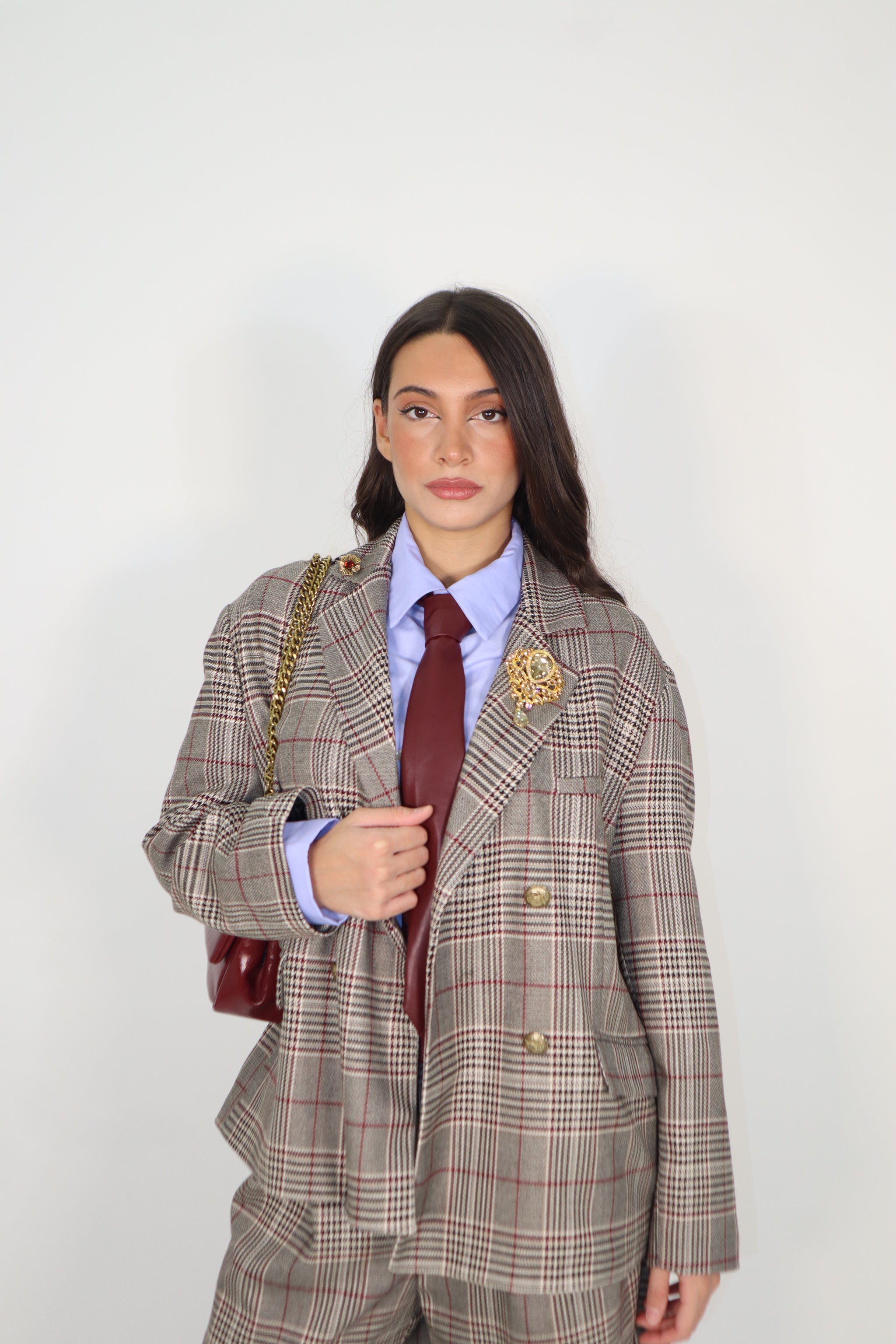 Blazer over vestibilità comoda doppio petto con bottoni in oro e maxi spilla gioiello sul rever. Stampa PRINCIPE DI GALLES