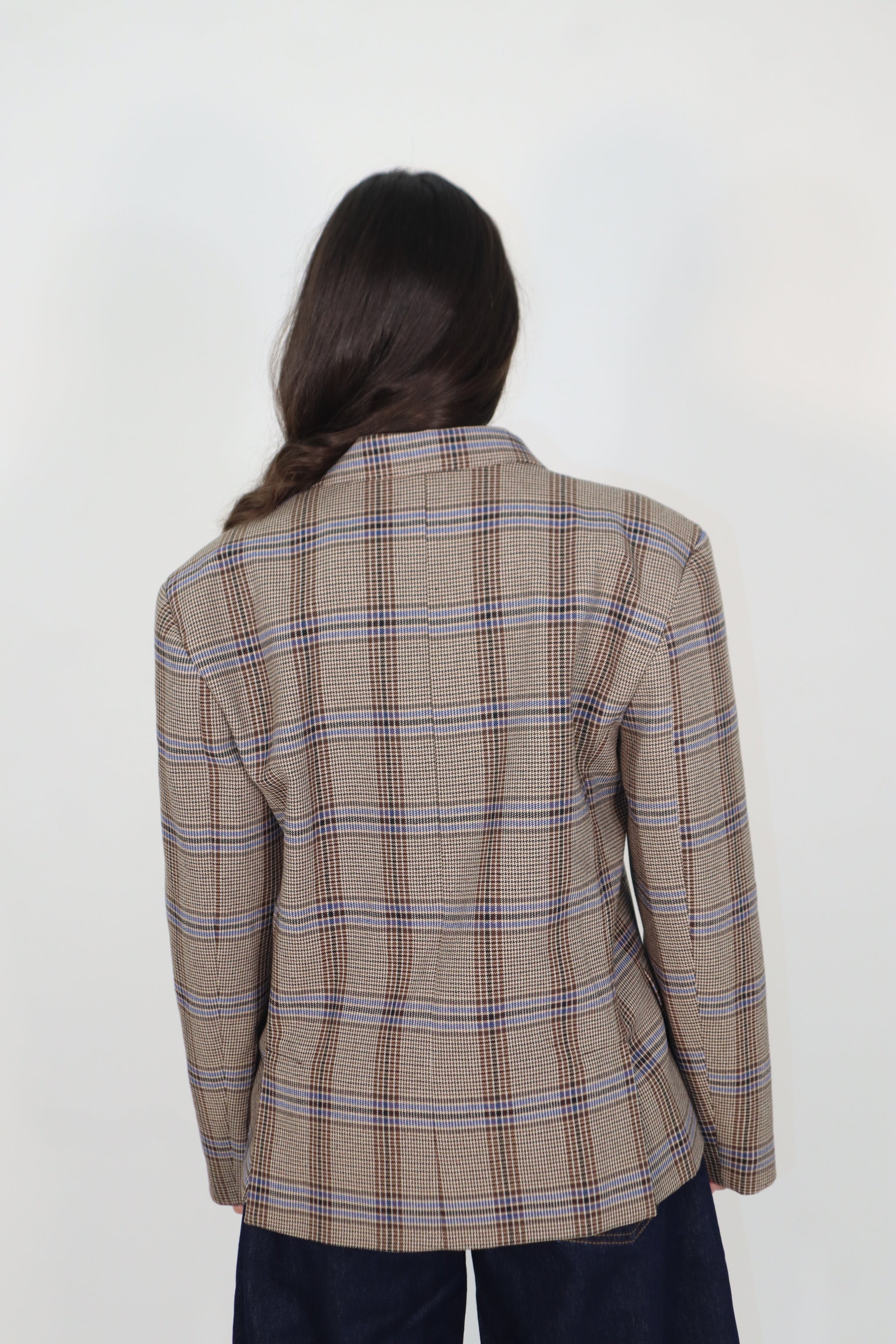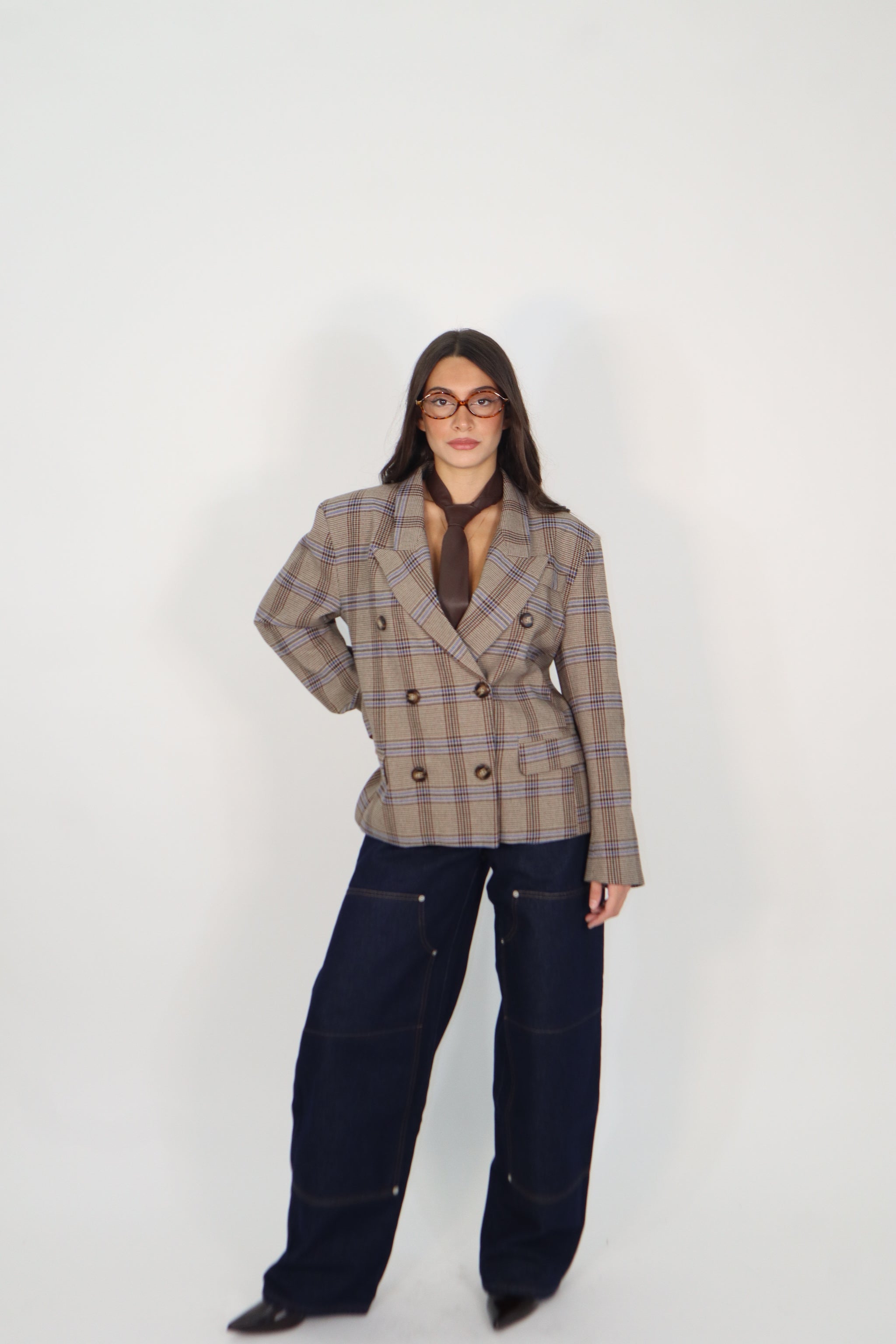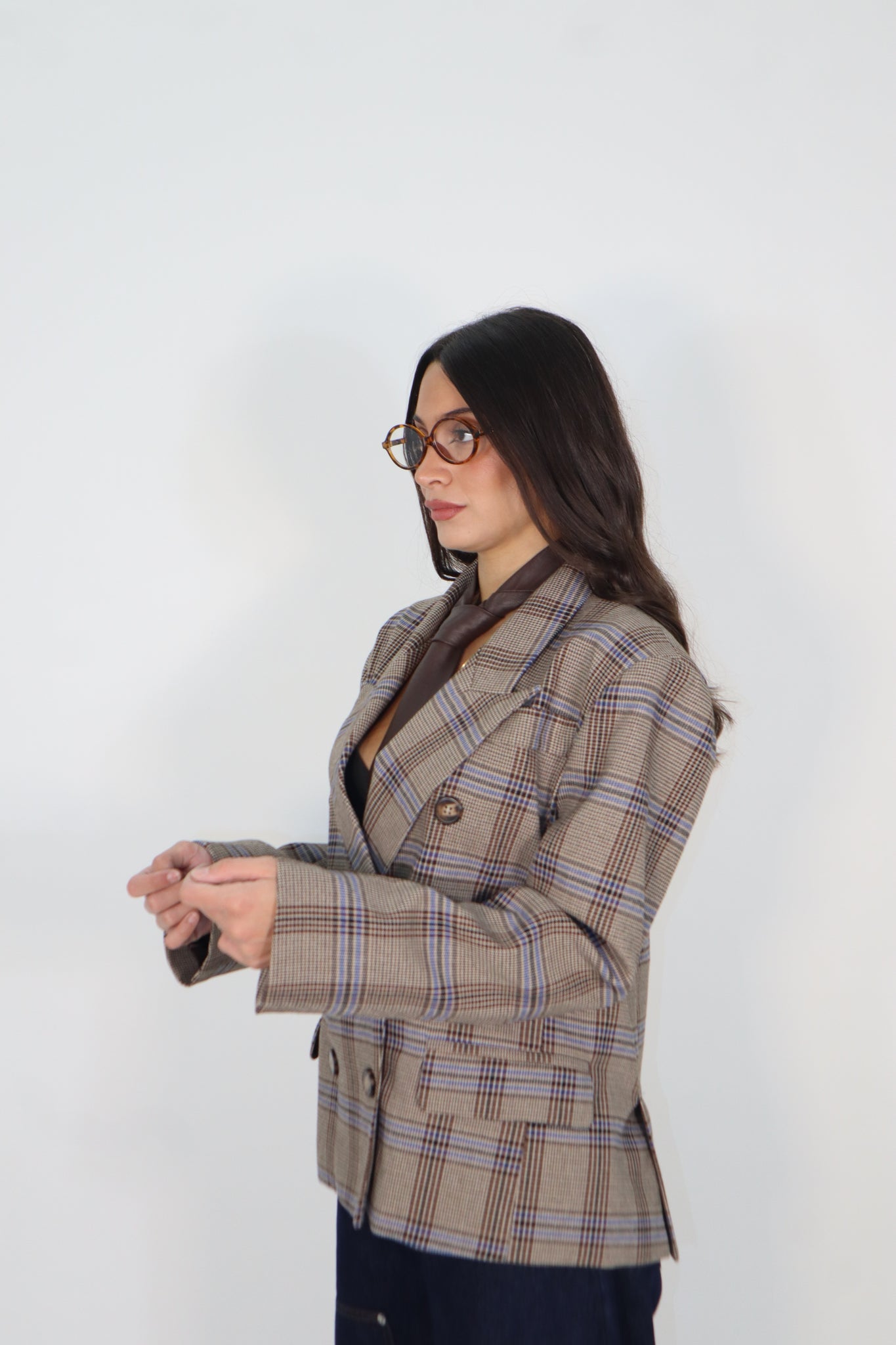 BLAZER DOPPIOPETTO in stampa principe di Galles sui toni del moro e righino azzurro. Dettaglio cravatta in similpelle moro