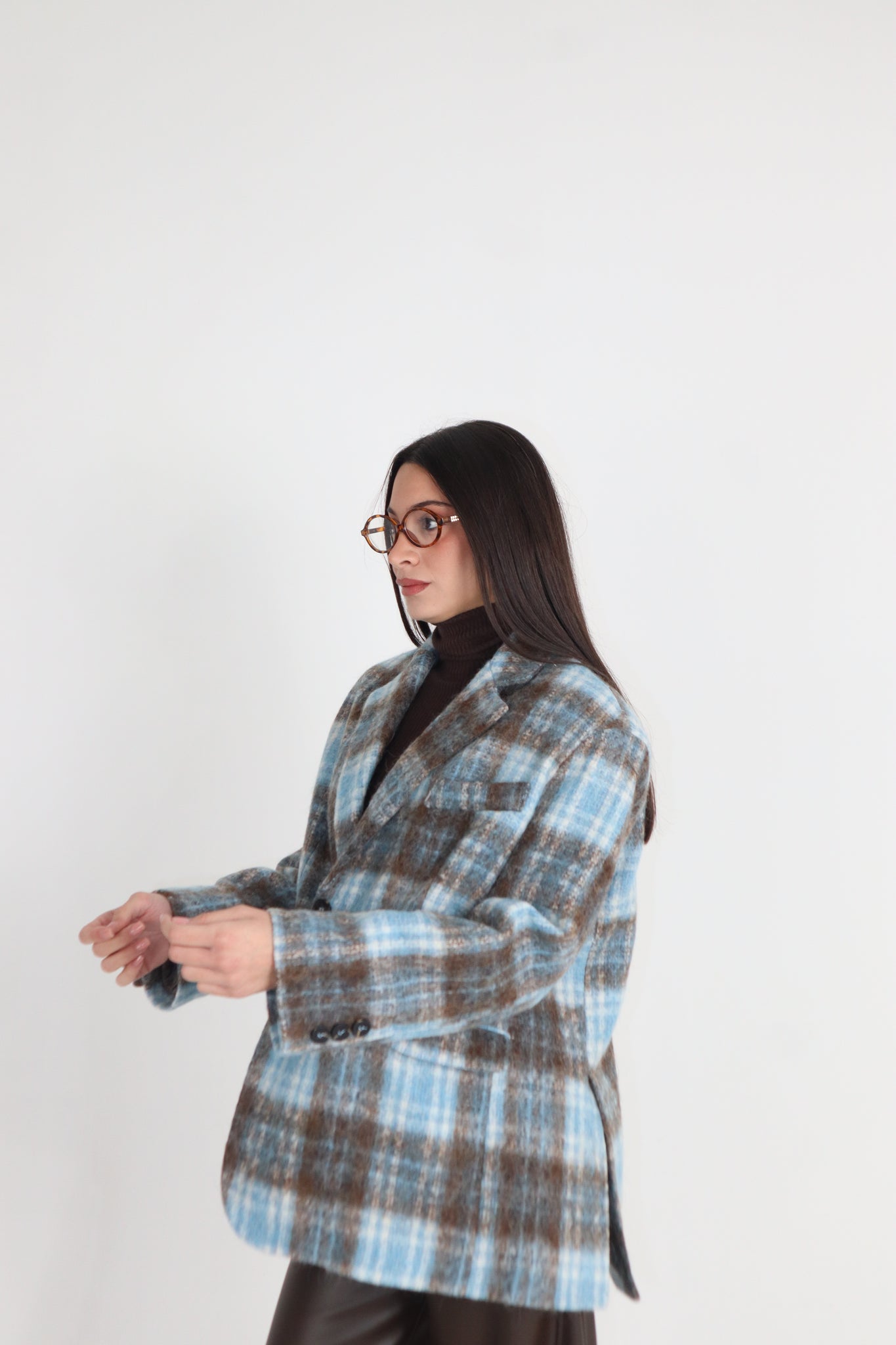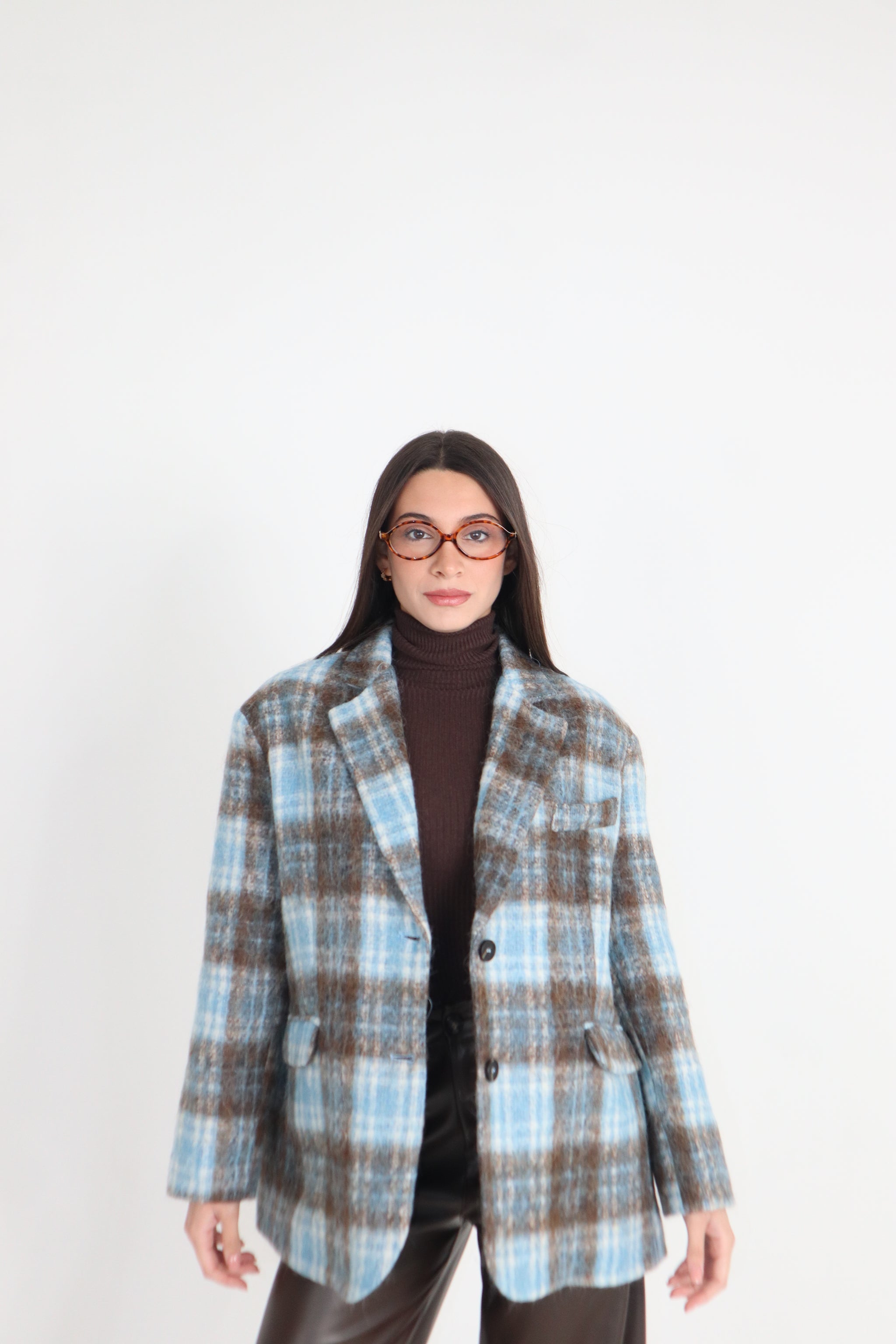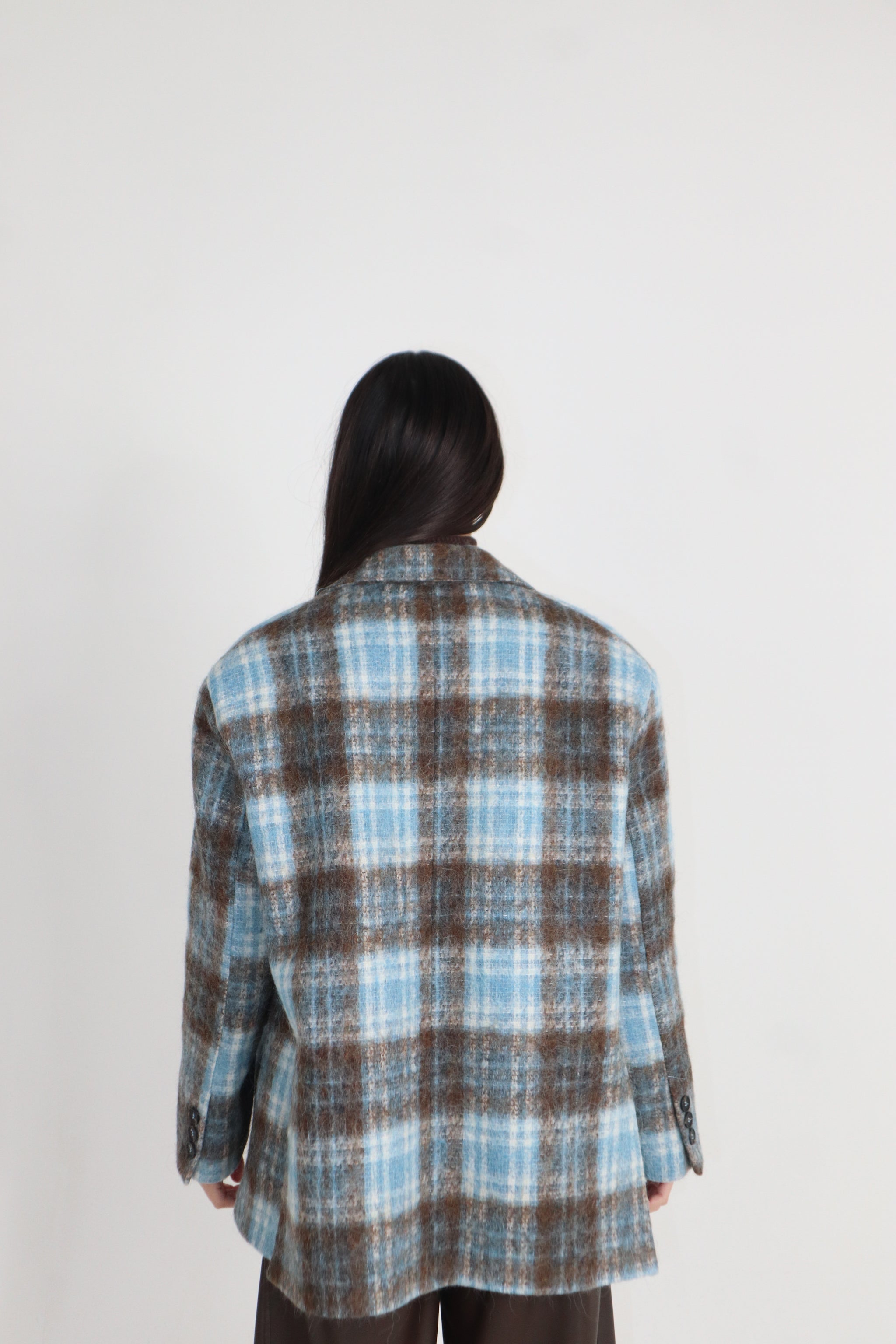 Giacca azzurra a quadri in lana mohair taglia unica monopetto a due bottoni oversize.