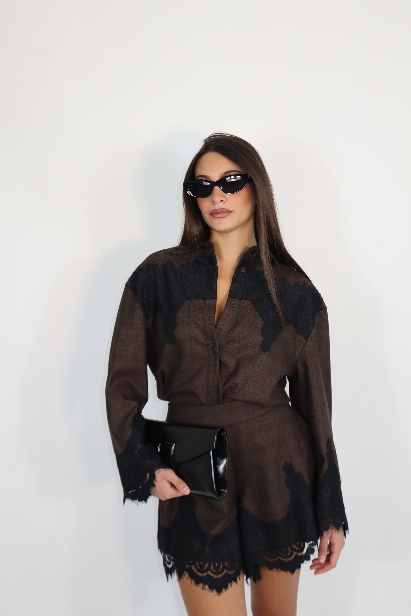 CAMICIA MORO CON INSERTI IN PIZZO NERO , REGULAR FIT