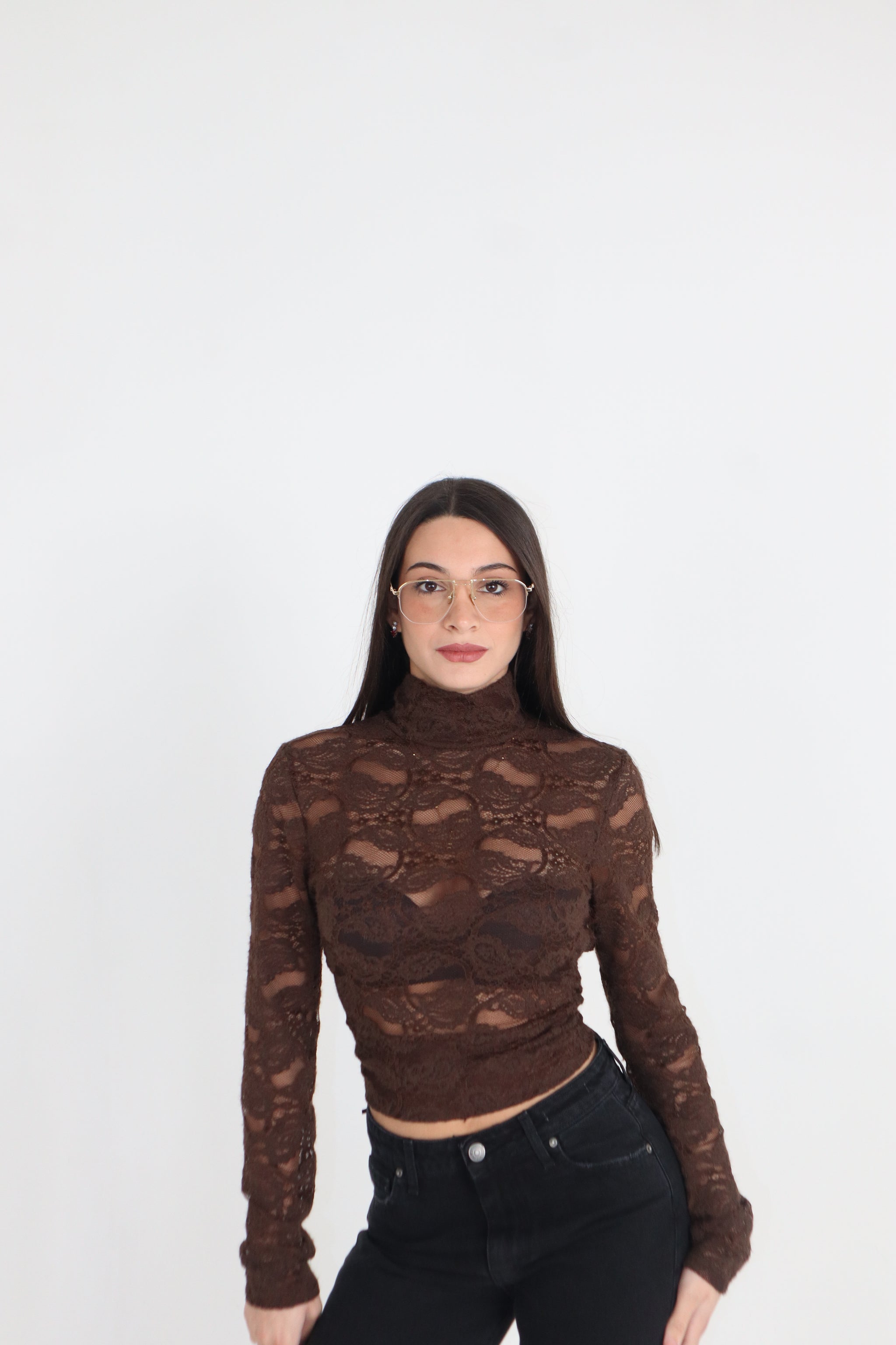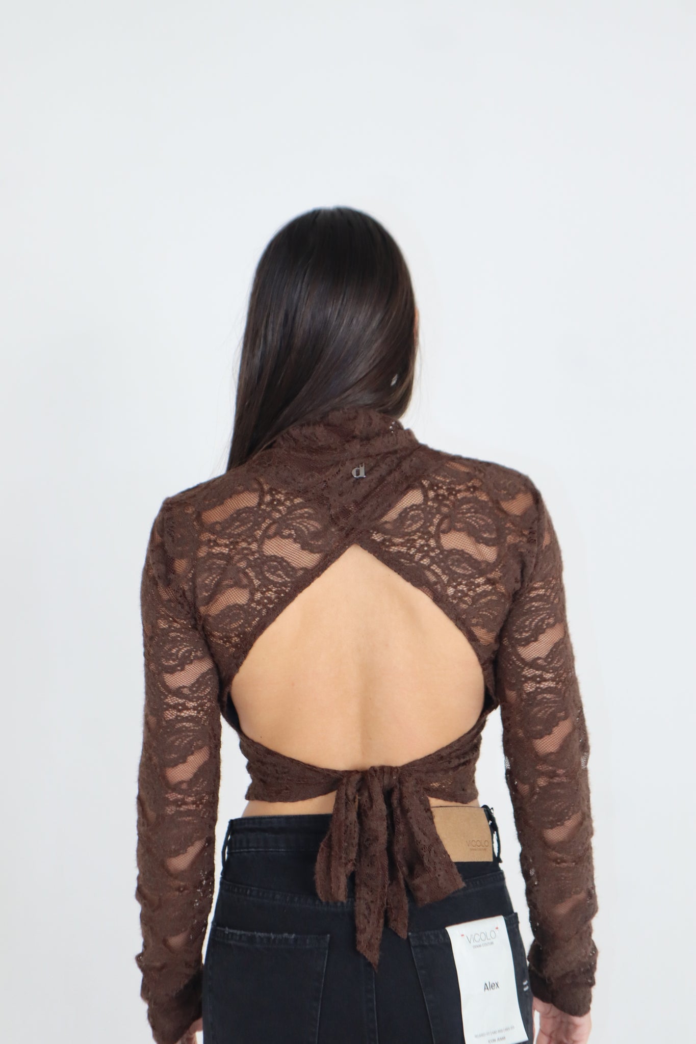 Top in pizzo con colletto e oblò sulla schiena, si allaccia dietro la schiena.