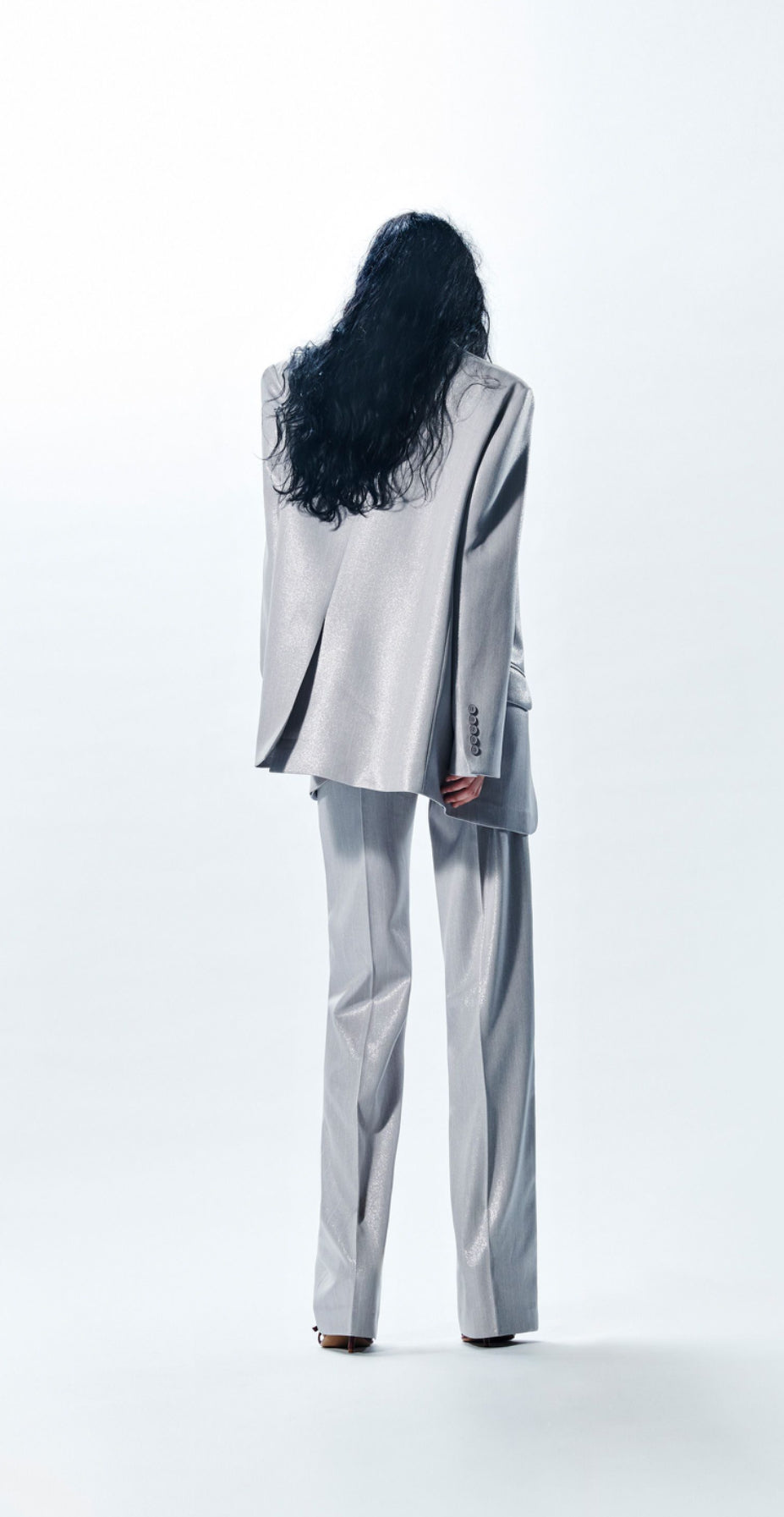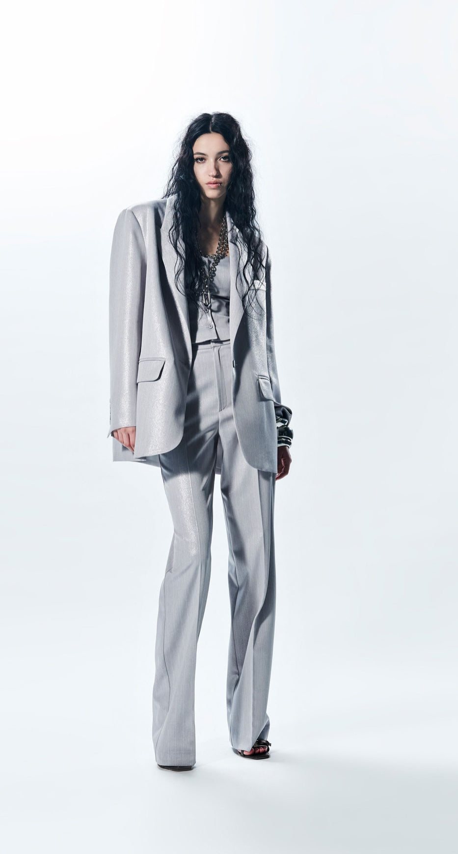 BLAZER OVERSIZE GESSATO IN FILO LUREX CON ABBOTTONATURA MONOPETTO.