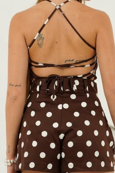 Il TOP POIS MORO presenta un design con scollo a cuore e fondo moro decorato da pois bianchi, combinando estetica e versatilità. I lacci posteriori regolabili permettono un adattamento ottimale, garantendo comfort e vestibilità personalizzata. Questo capo è ideale per un look raffinato in diverse occasioni.