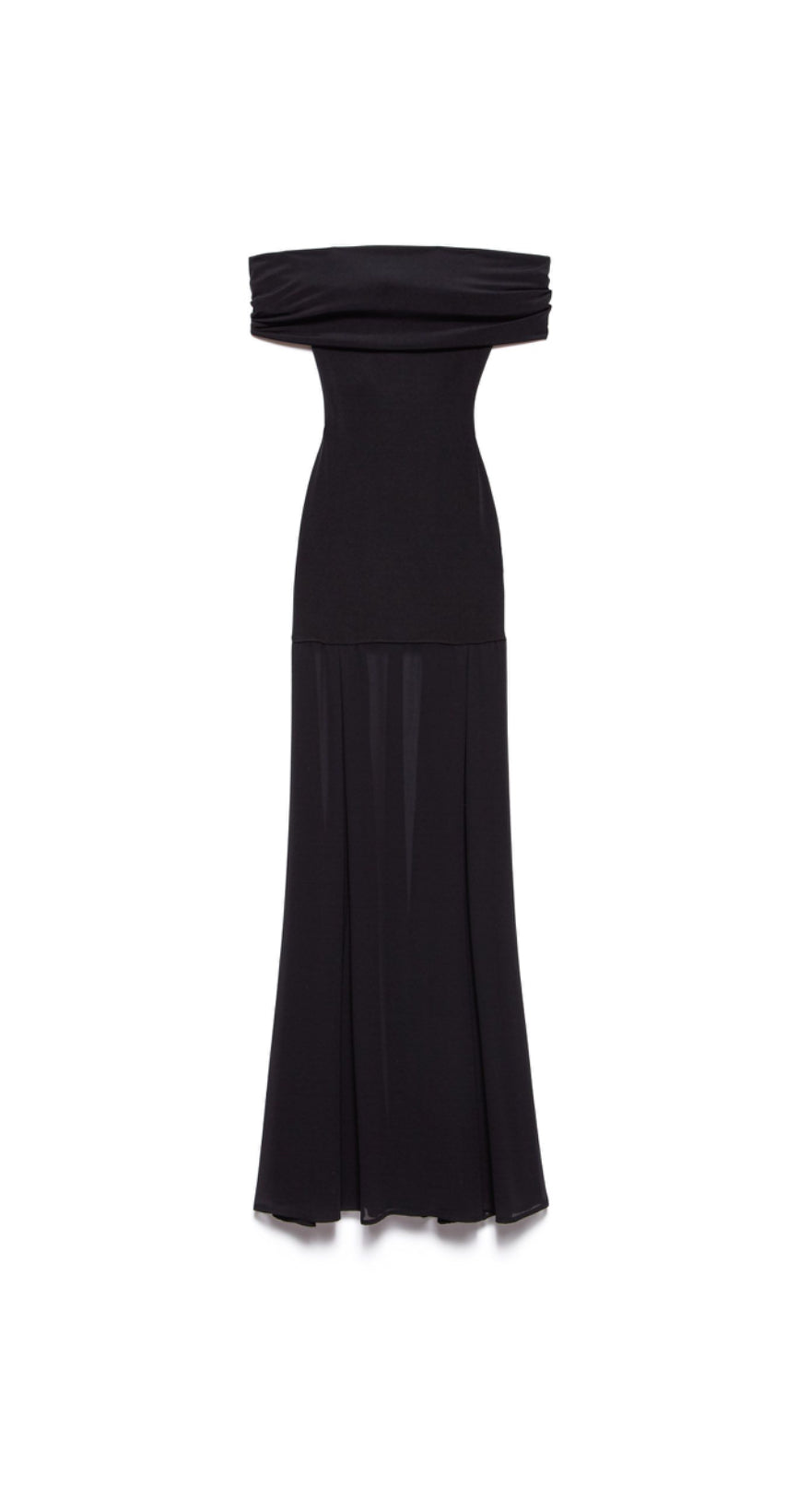 ABITO LUNGO IN JERSEY CON SCOLLO A BARCHETTA E LUNGHEZZA GONNA TRASPARENTE.