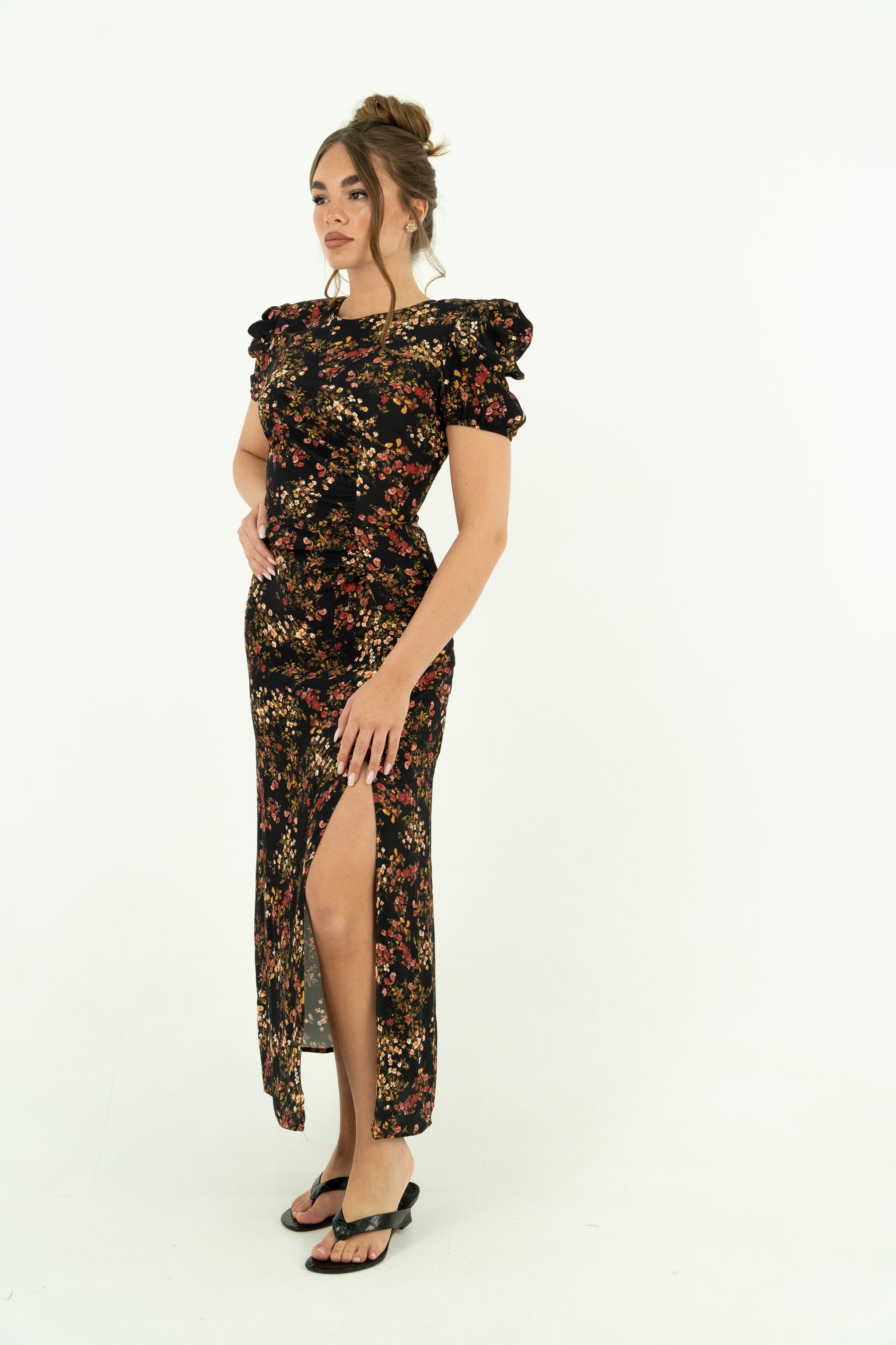 L'abito fondo nero con fiori colorati offre un design elegante e versatile, ideale per eventi formali e occasioni informali. La combinazione di colori vivaci su una base scura consente di ottenere un look sofisticato, mentre il tessuto garantisce comfort e libertà di movimento.