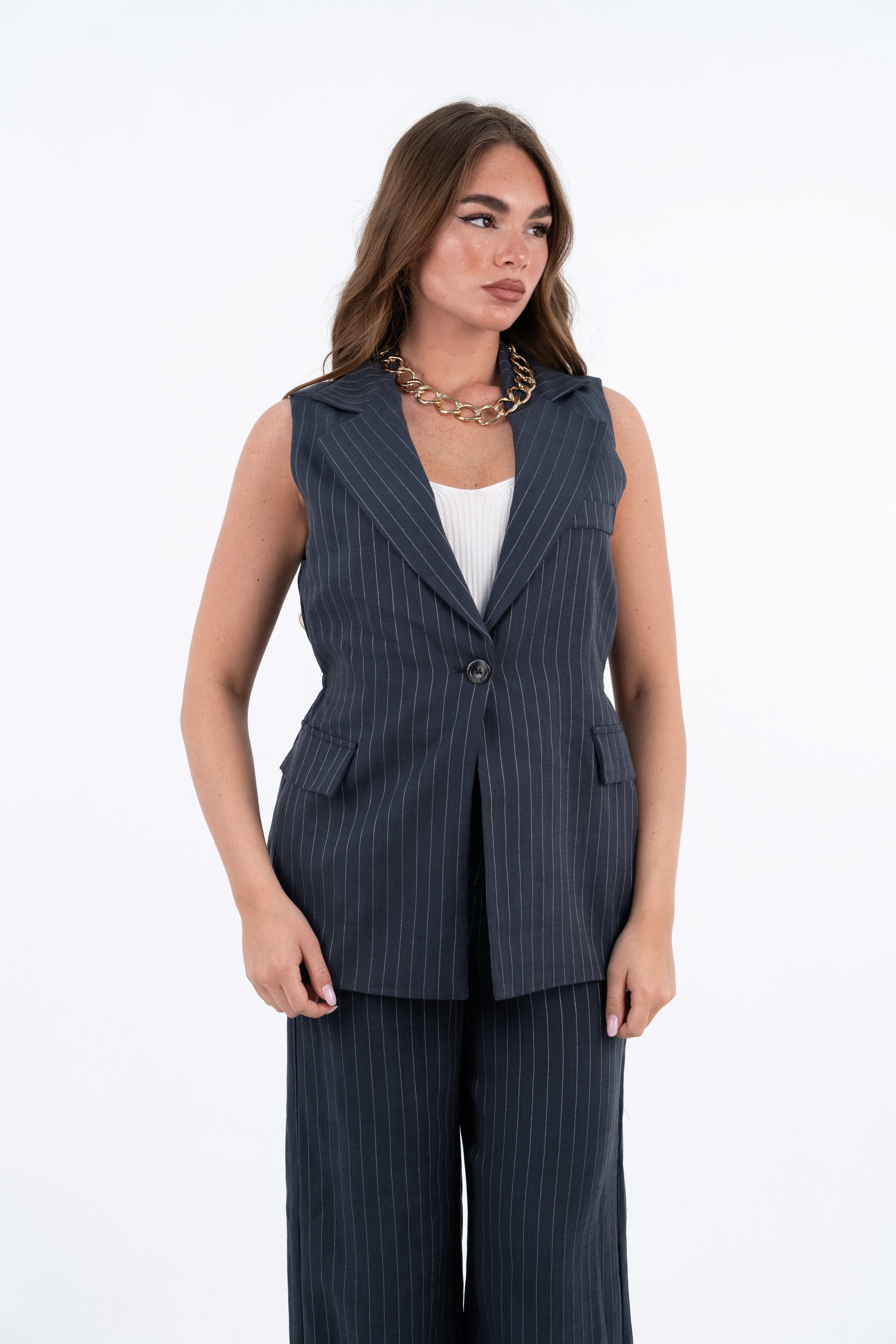 Il Gilet Gessato Blu è progettato con un elastico in vita, garantendo una vestibilità comoda e adattabile. La trama gessata conferisce un aspetto elegante e professionale, ideale per occasioni formali o eventi aziendali. La composizione del tessuto assicura durabilità e comfort nell'uso quotidiano.