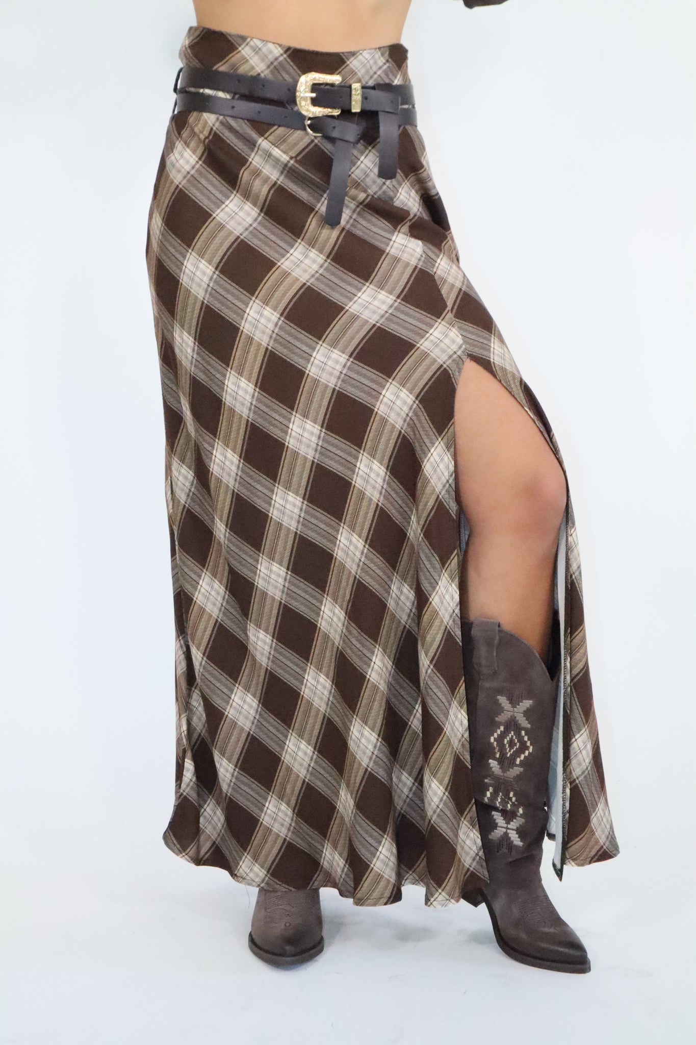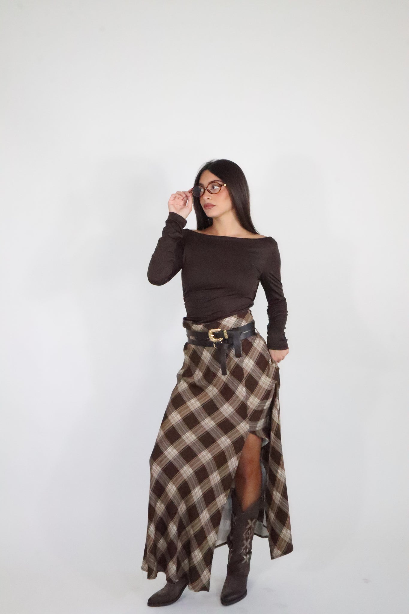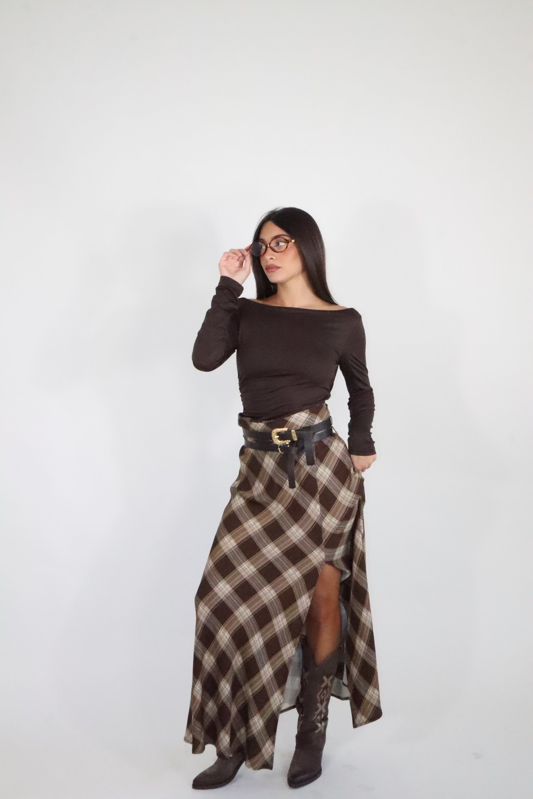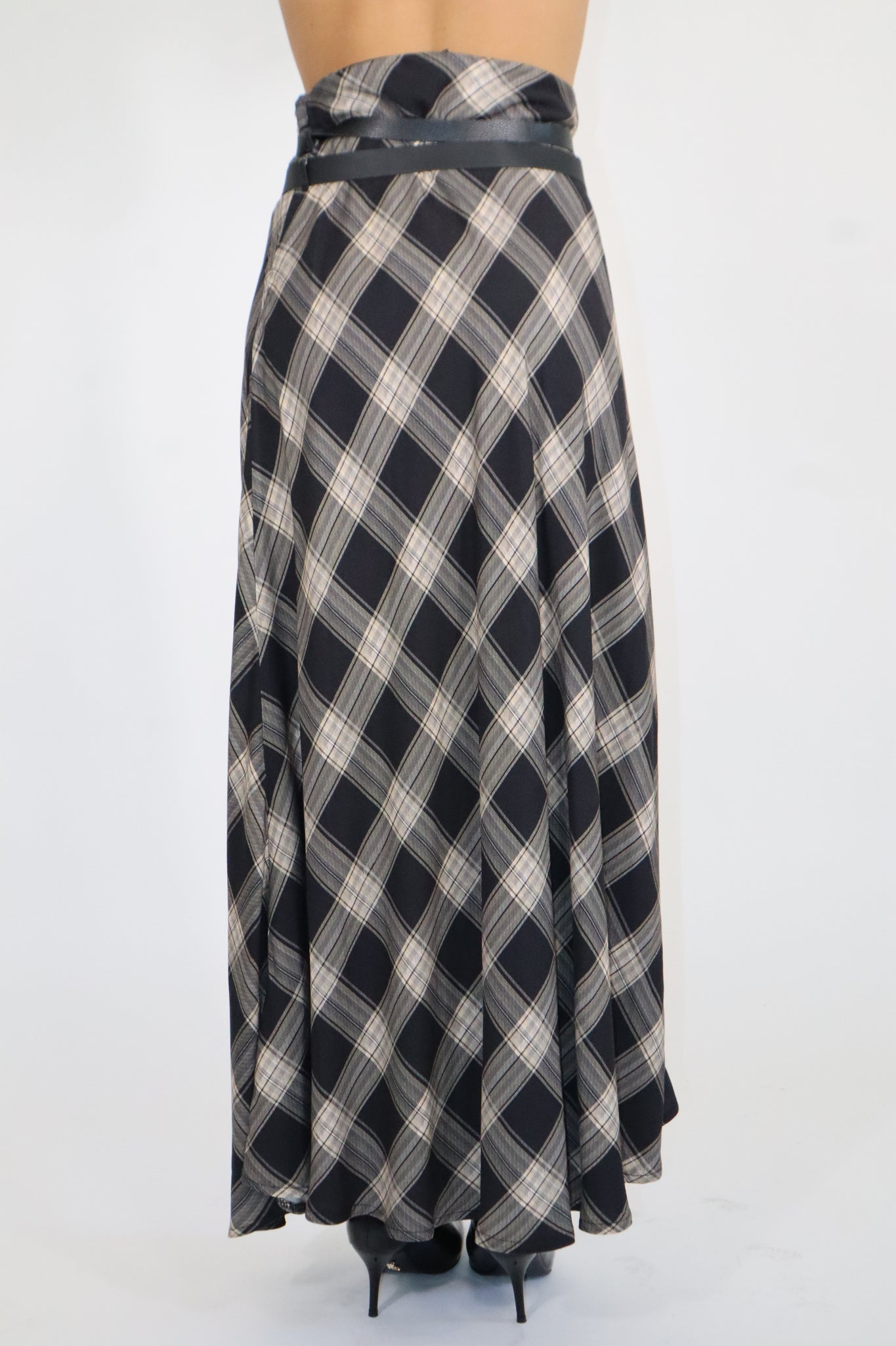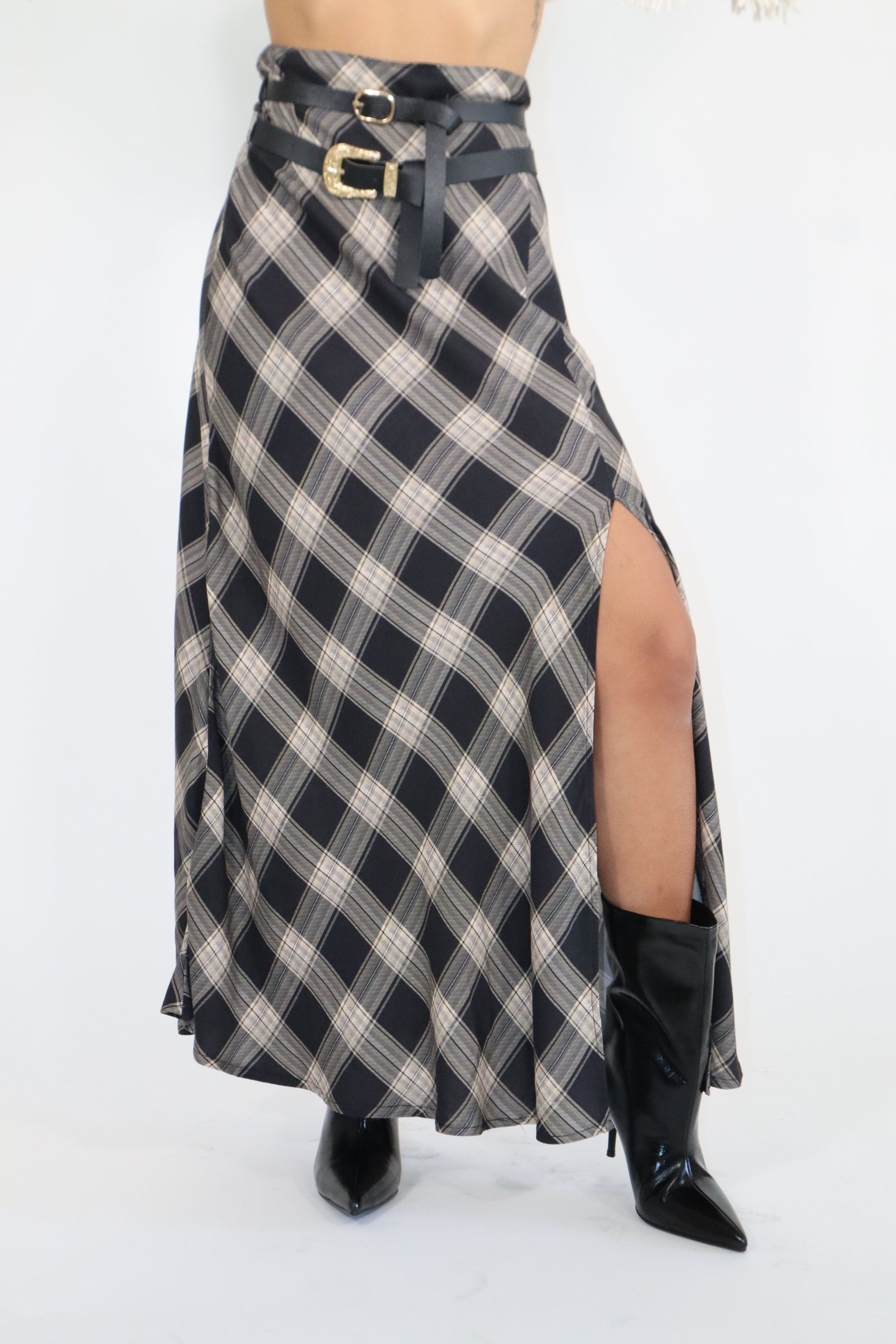 Gonna stampa quadri taglio asimmetrica con spacco, doppia cintura.