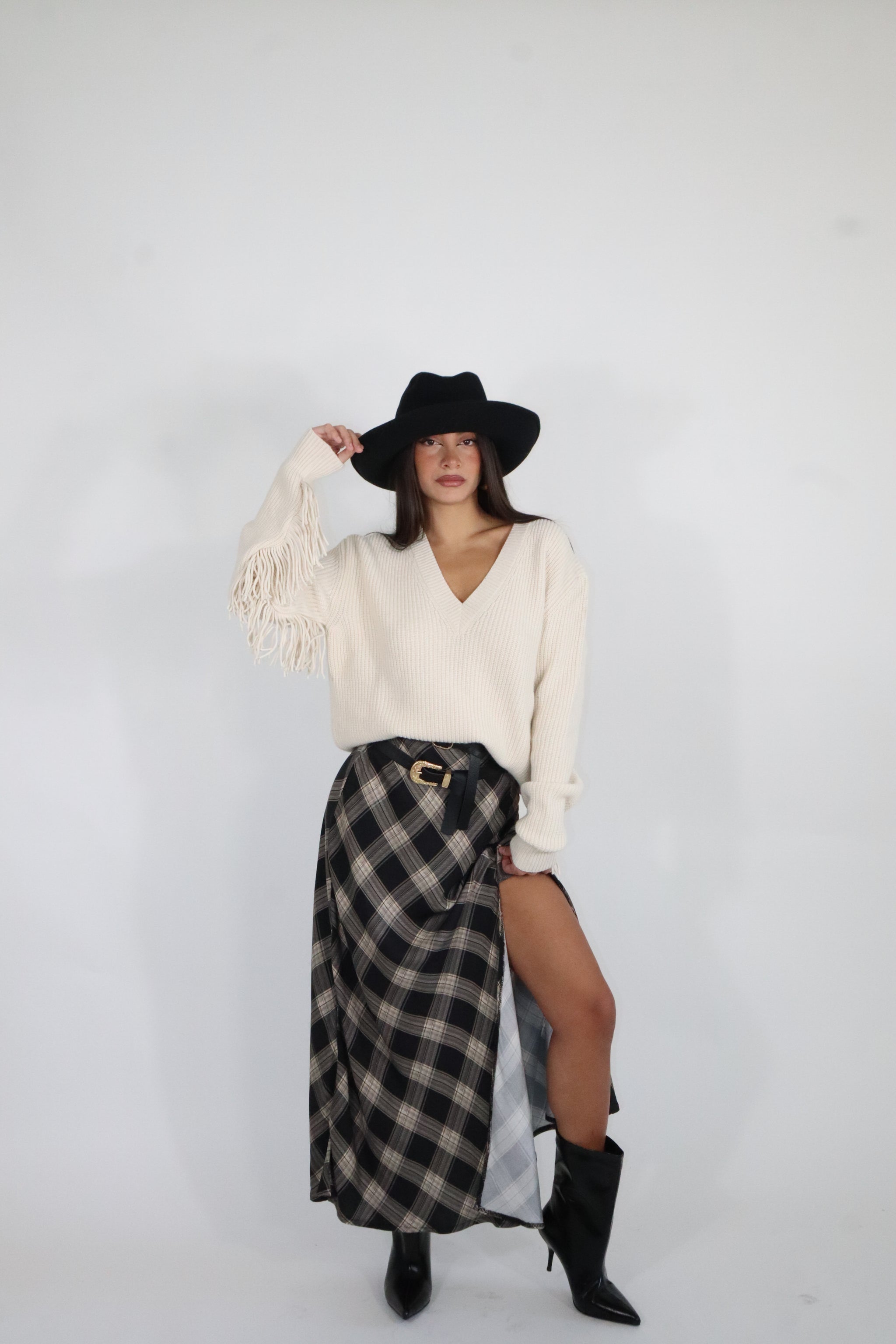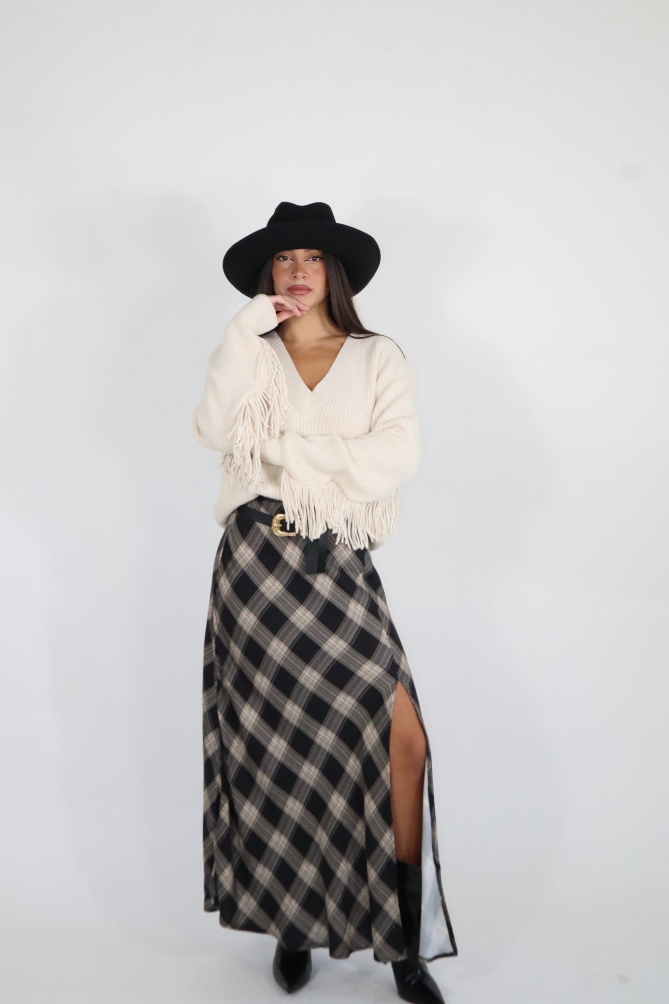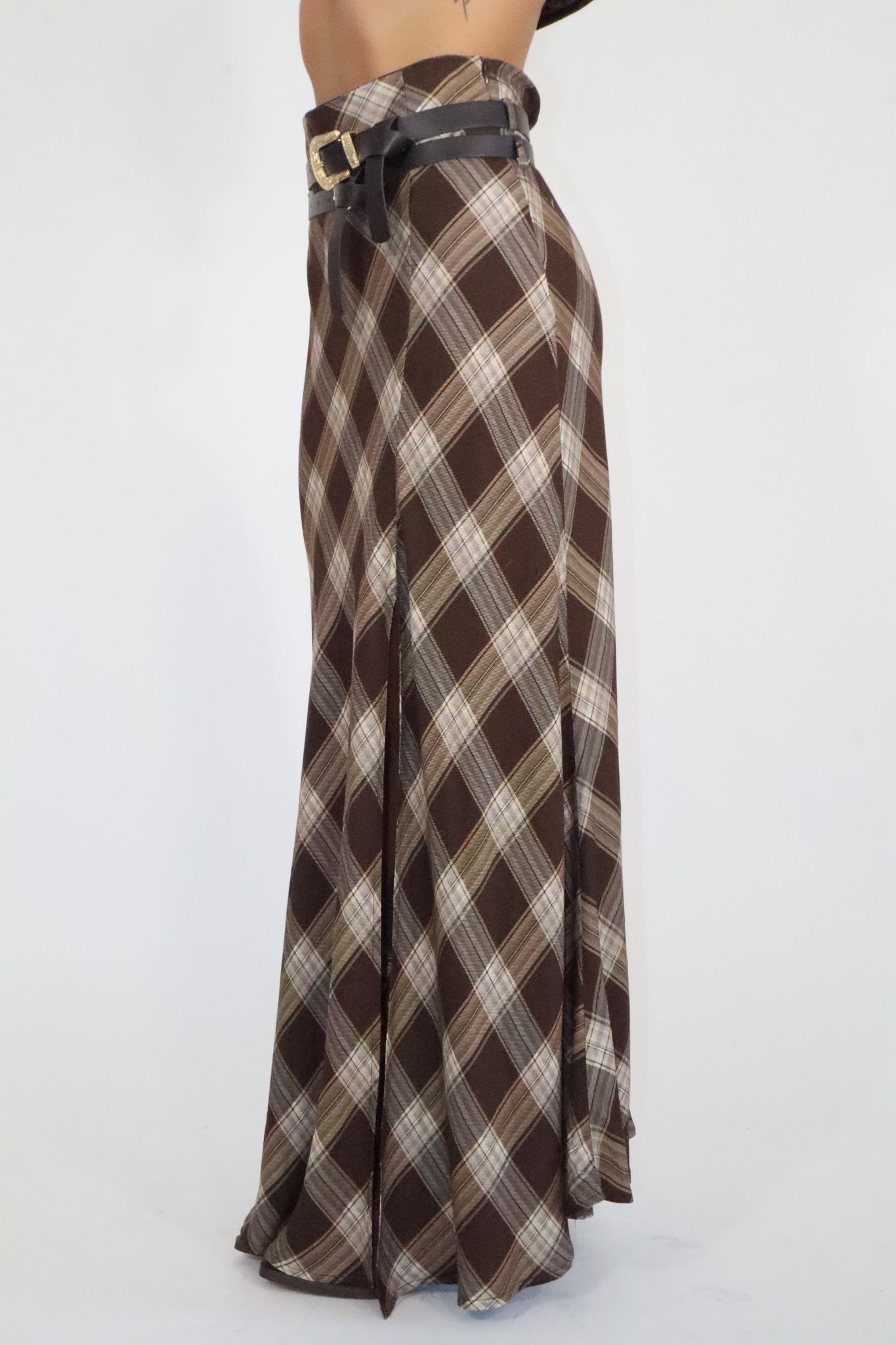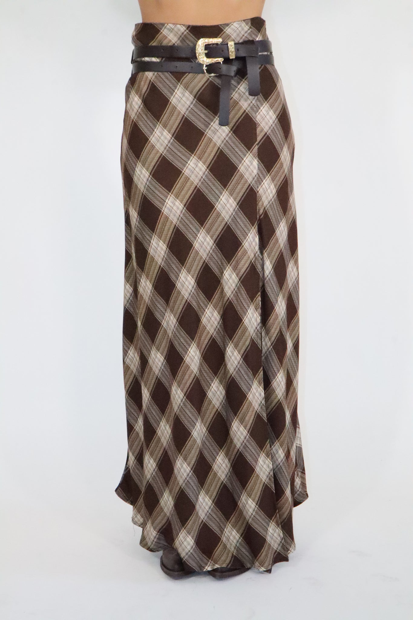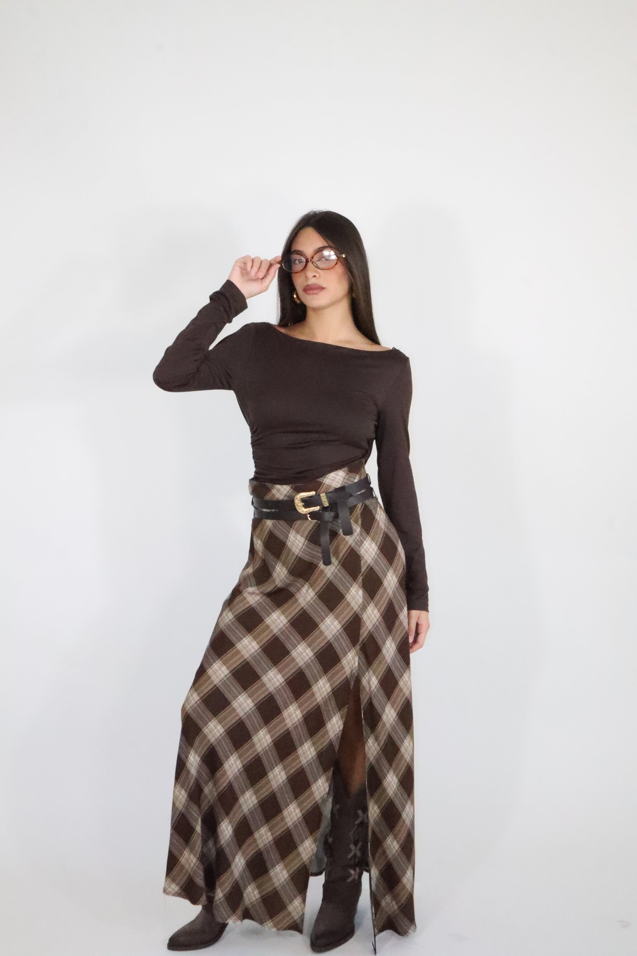 Gonna stampa quadri taglio asimmetrica con spacco, doppia cintura.