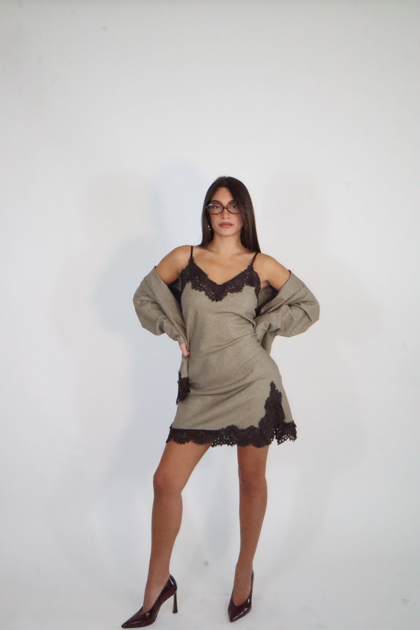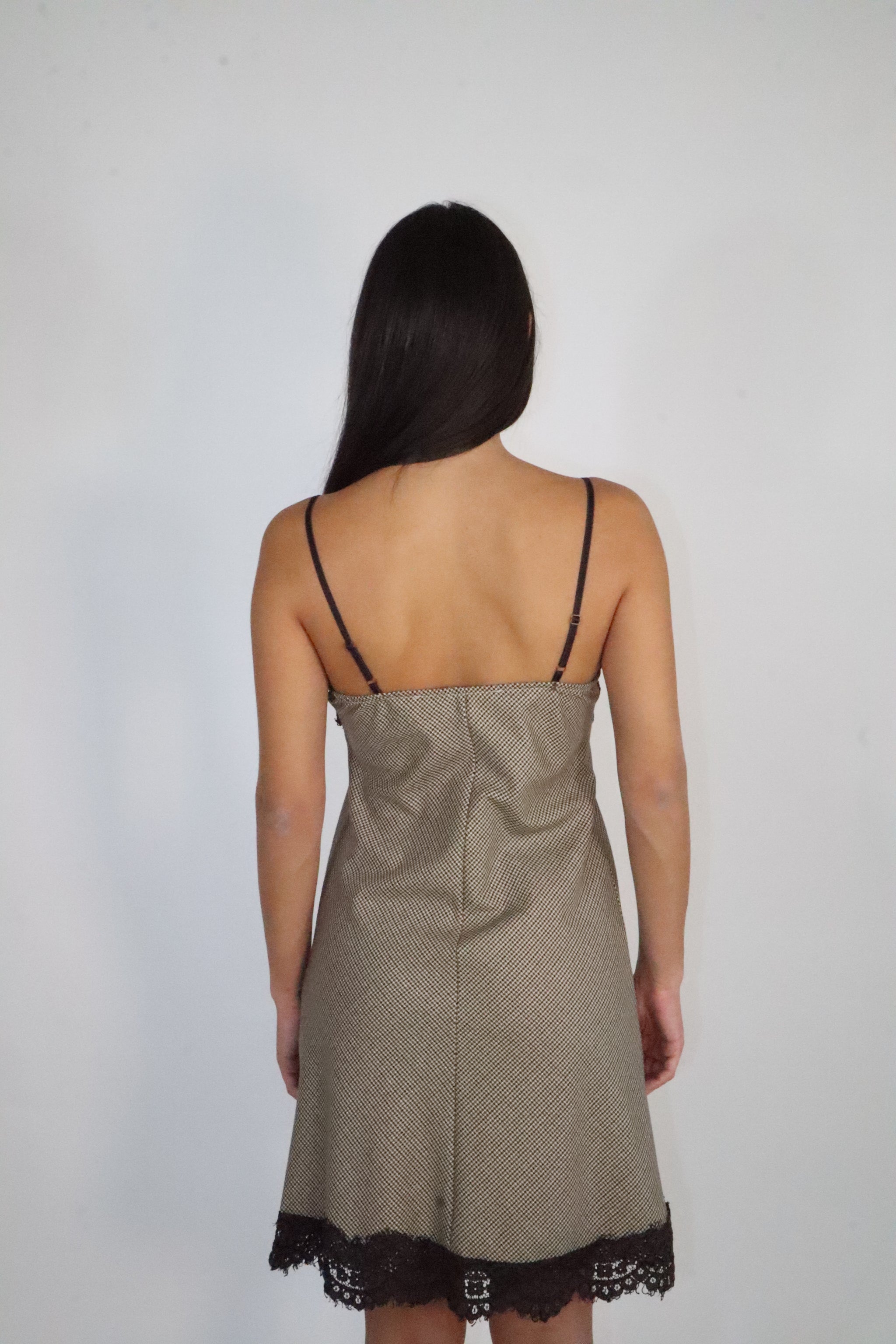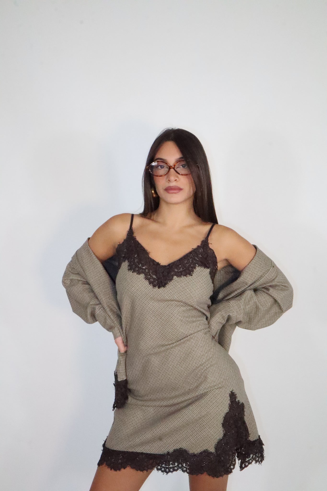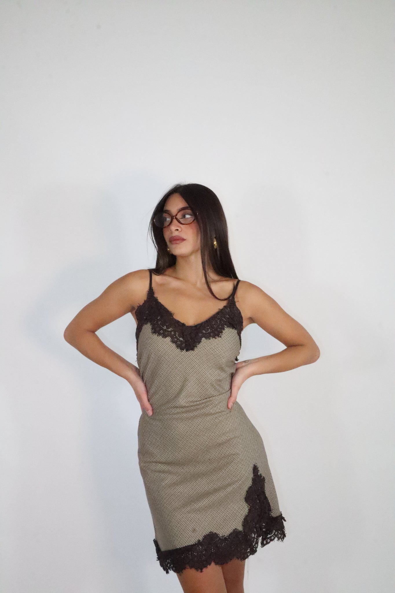 Mini dress con stampa check e orli in pizzo moro , bretella regolabile