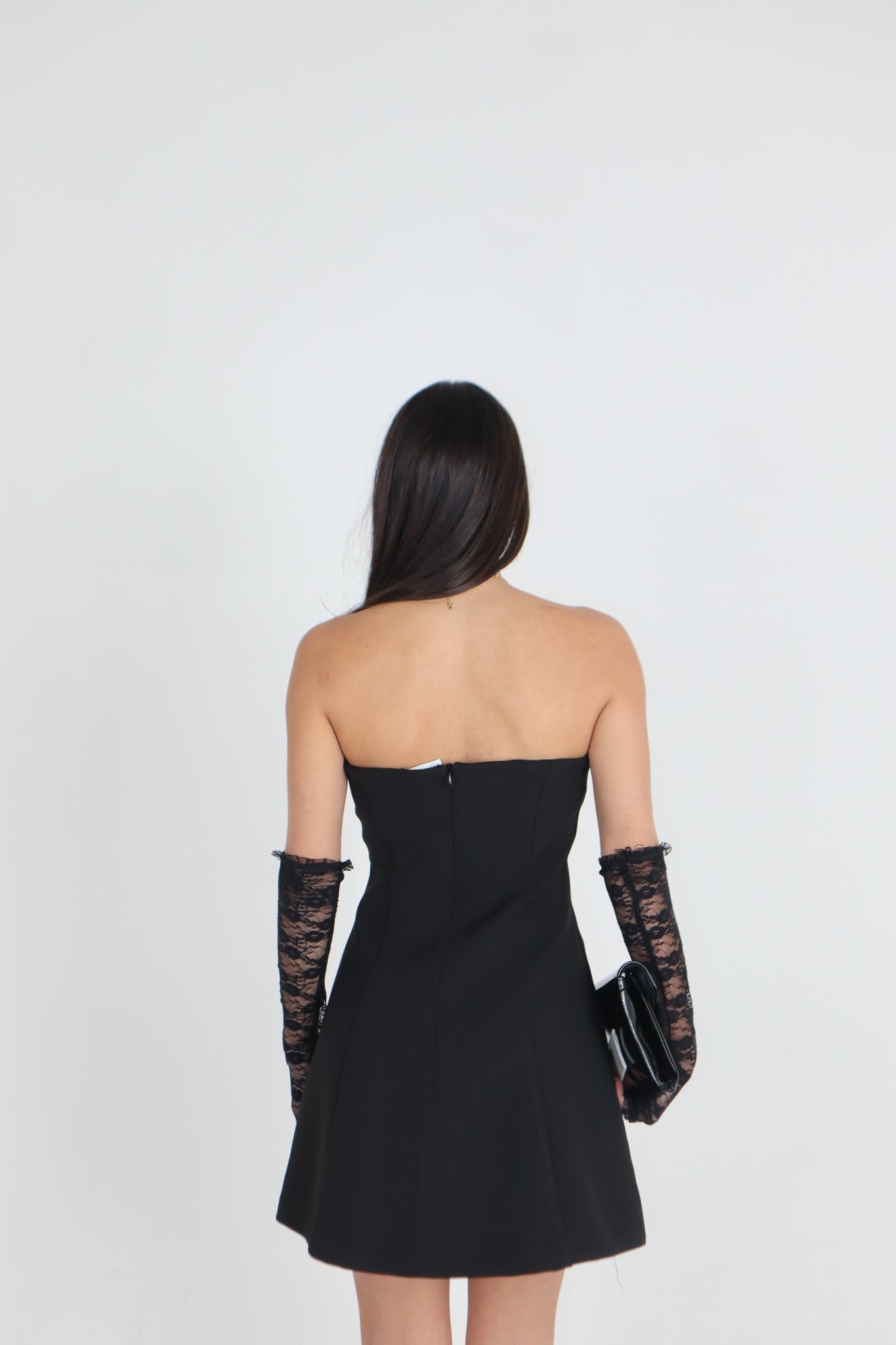Mini abito a fascia , bustino dritto. Manicotti in pizzo alle maniche.